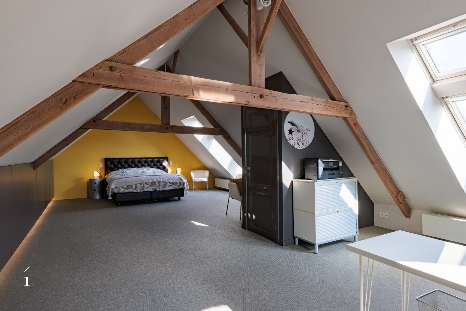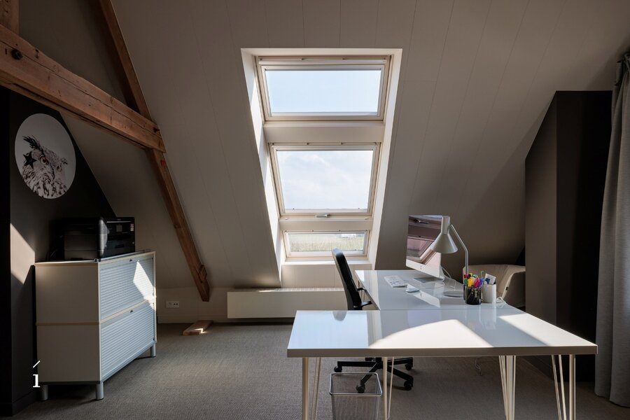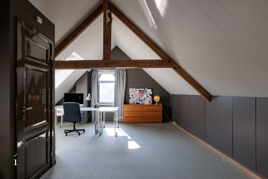 De bovenste verdieping biedt een indrukwekkende open ruimte die vandaag dienst doet als slaapkamer en bureau, met bovendien mogelijkheden om extra kamers of een tweede badkamer te creëren.