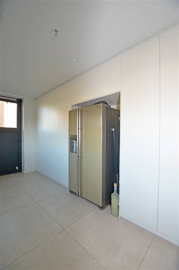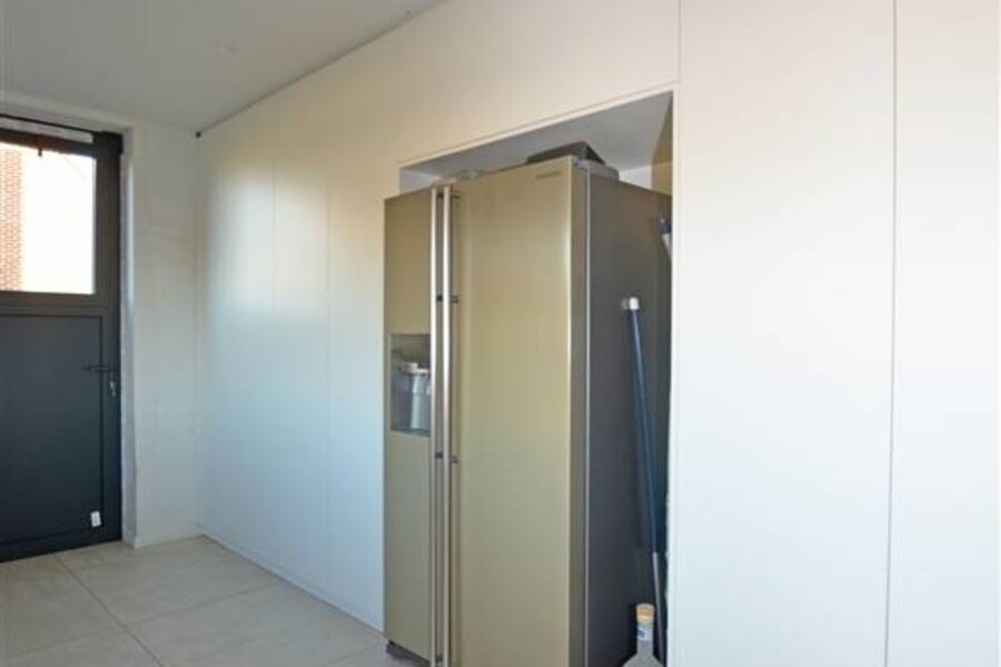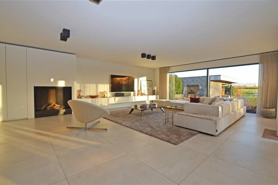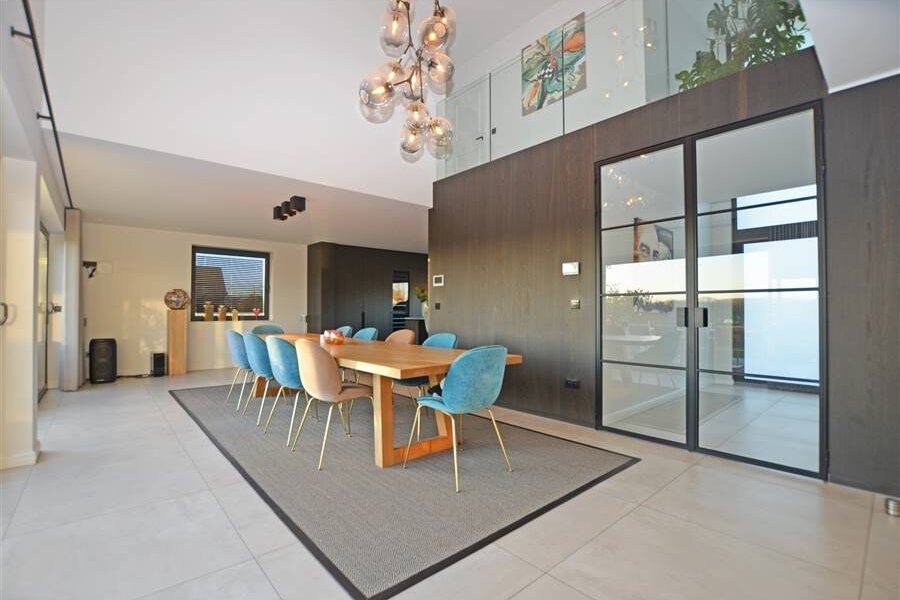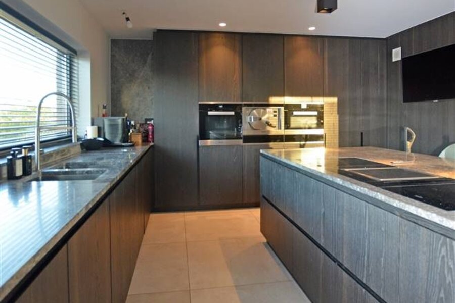 Via de inkomhal, met een ruime berging en gastentoilet, betreedt u de leefruimte. Deze bestaat uit een open en lichtrijke living/zithoek met gashaard, een eetgedeelte en een volledig ingerichte open leefkeuken. De keuken is uitgerust met een kookeiland, dubbele lavabo, oven en stoomoven, twee warmhoudlades, een teppanyaki-plaat en een wijnfrigo, alle toestellen van Miele.