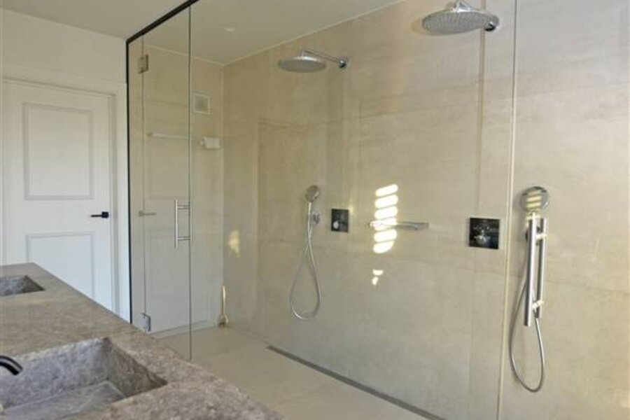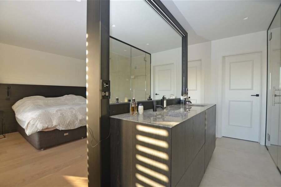 Op de eerste verdieping bevindt zich de masterbedroom met ensuite badkamer, voorzien van een dubbele inloopdouche, dubbele wastafel en een aparte dressing met inbouwkasten. Daarnaast zijn er nog twee slaapkamers, elk uitgerust met ingebouwde kasten, een apart toilet en een badkamer met ligbad en inloopdouche.