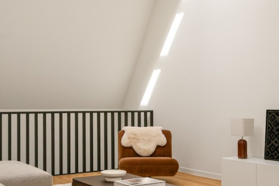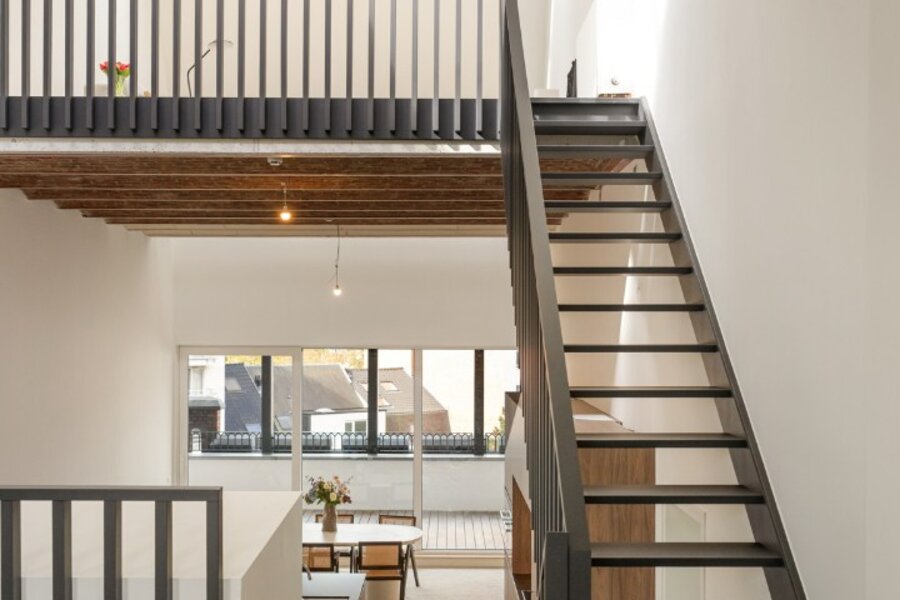 Op het tussenverdiep bevindt zich momenteel een formele leefruimte, die zich ook perfect leent als bureau of polyvalente ruimte. Op het bovenste niveau bevindt zich de tweede, royale leefruimte: een ware oase van licht dankzij de verschillende dakramen en de unieke openheid van het geheel.