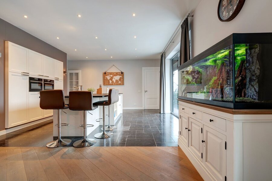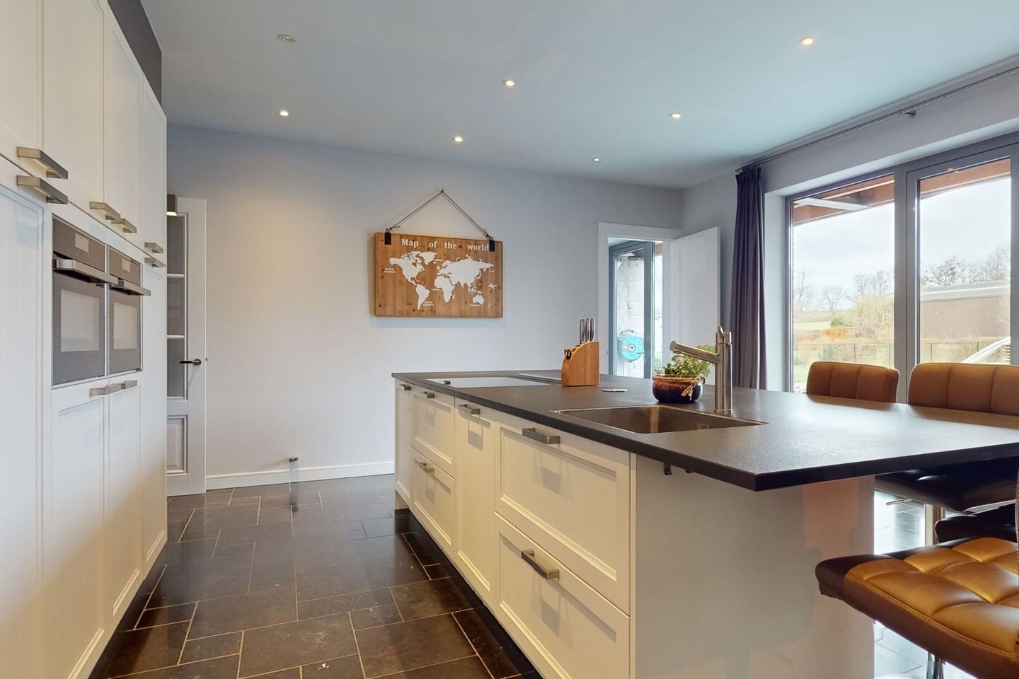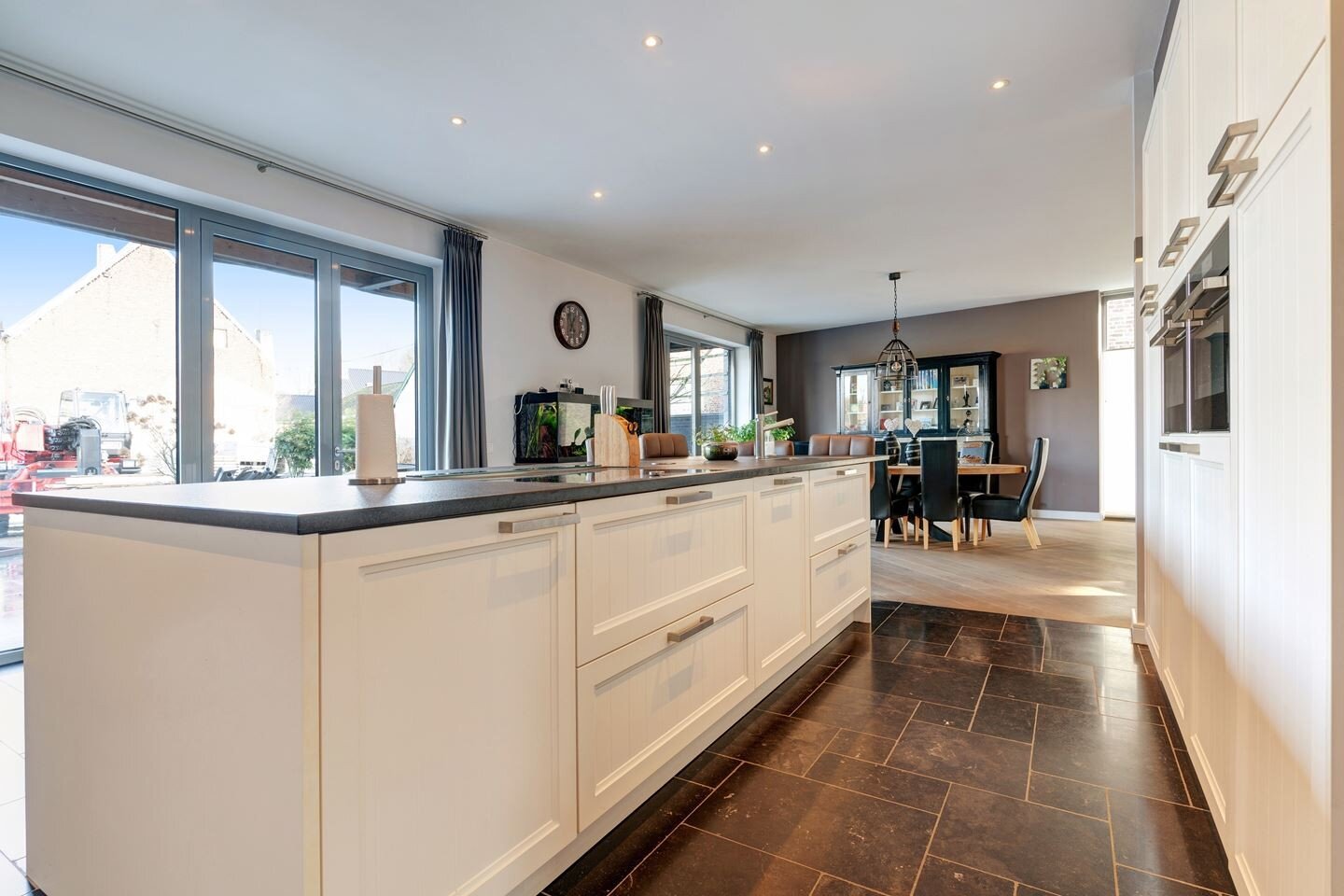 - De open keuken is compleet ingericht en heeft een prachtig kookeiland v.v. een granieten werkblad;