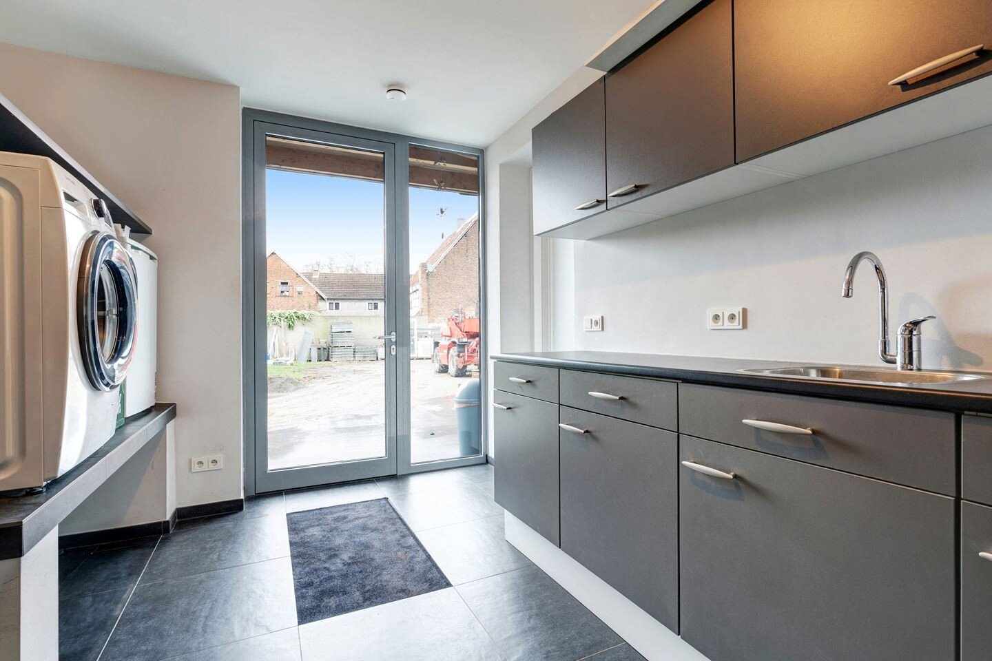 - Berging met spoelbak en aansluitingen voor wasmachine en droogkast;
