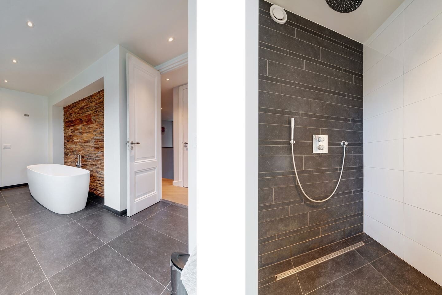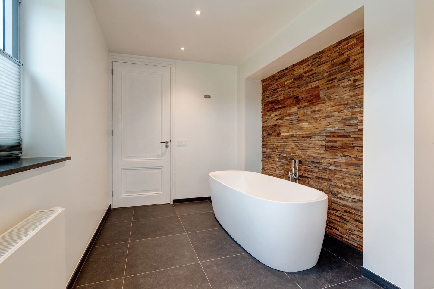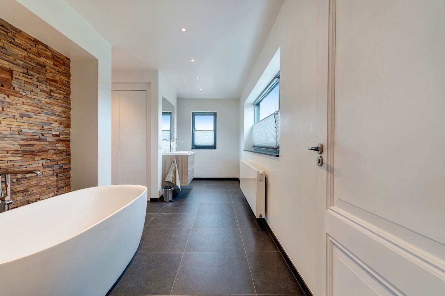 - De badkamer is uitgerust met een comfortabel ligbad, inloopdouche, dubbele wastafel en vloerverwarming;