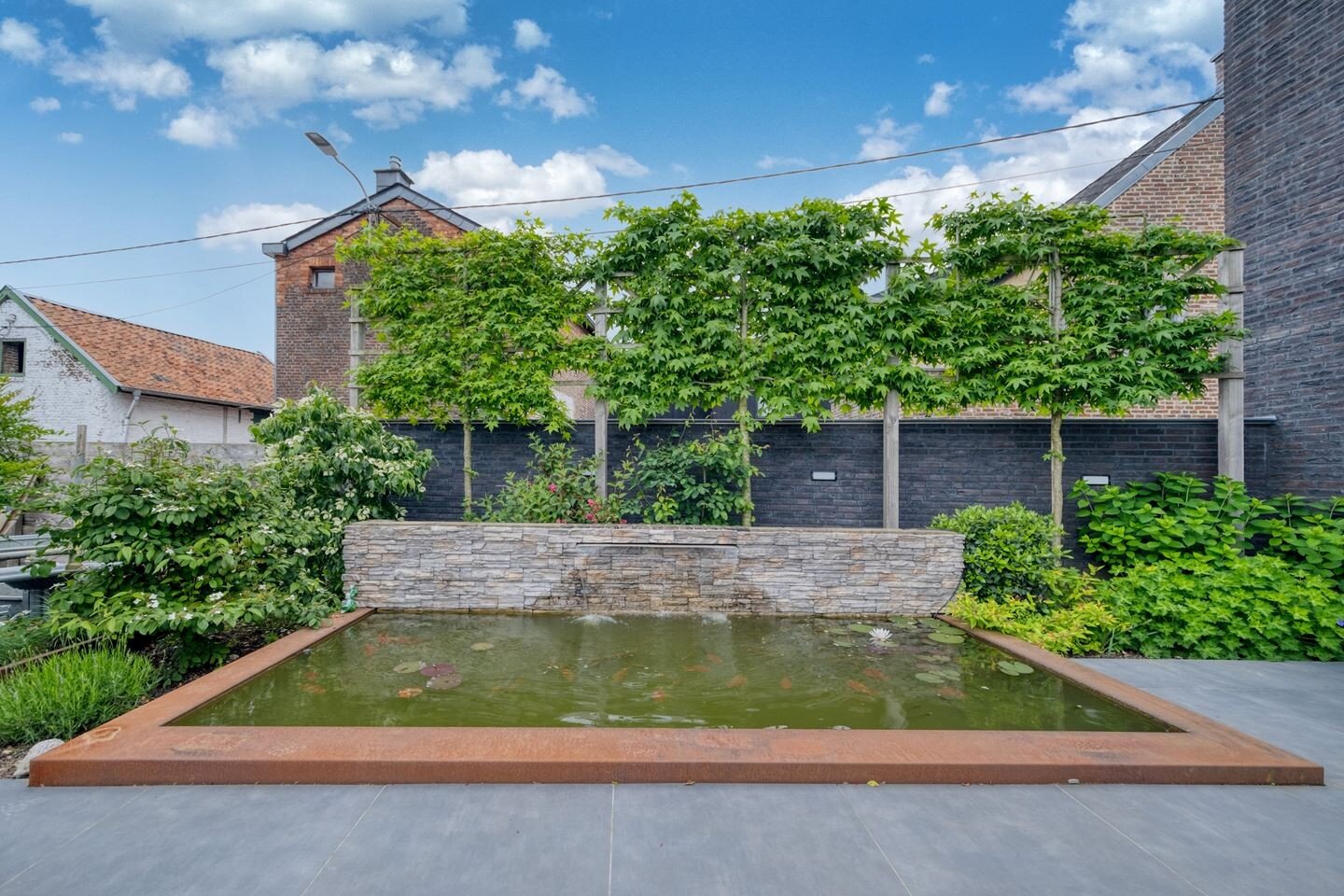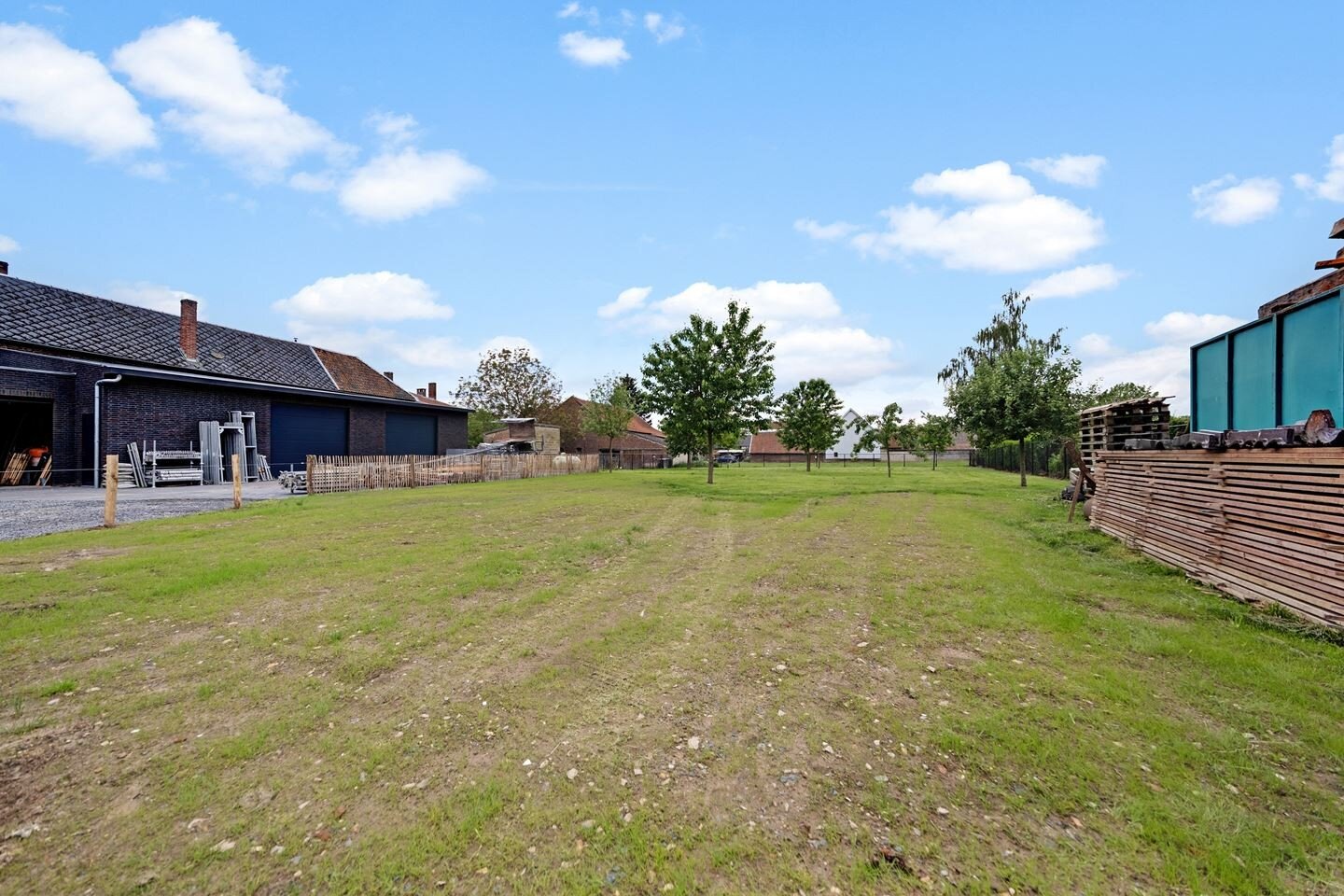 - Ruime tuin, volledig omheind en v.v. een verhoogd terras en uitgestrekt gazon;