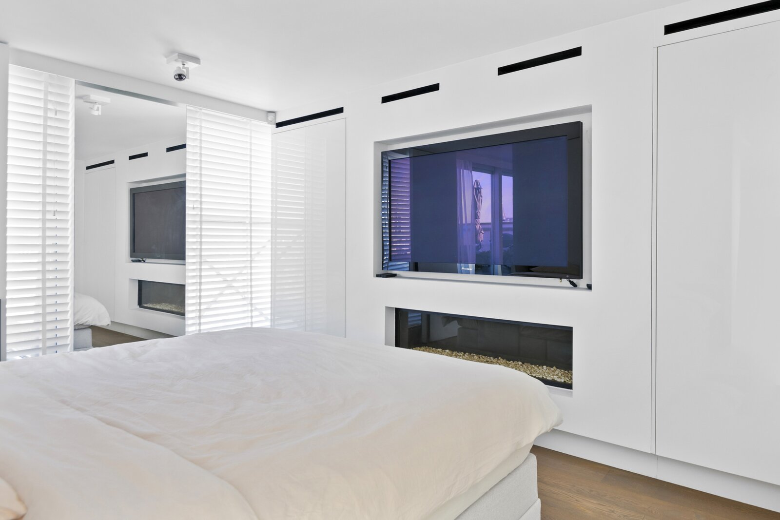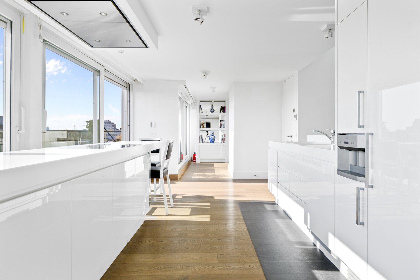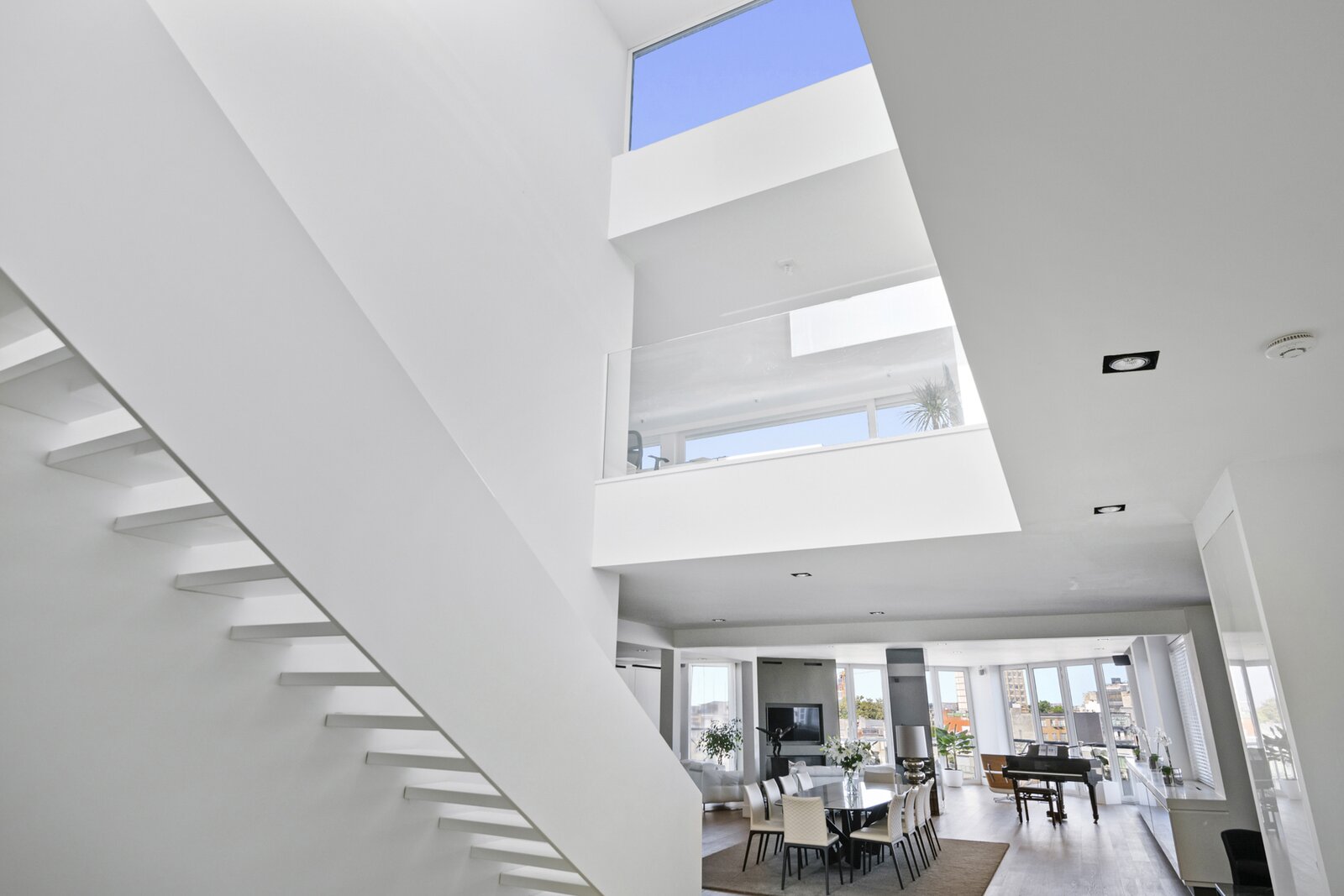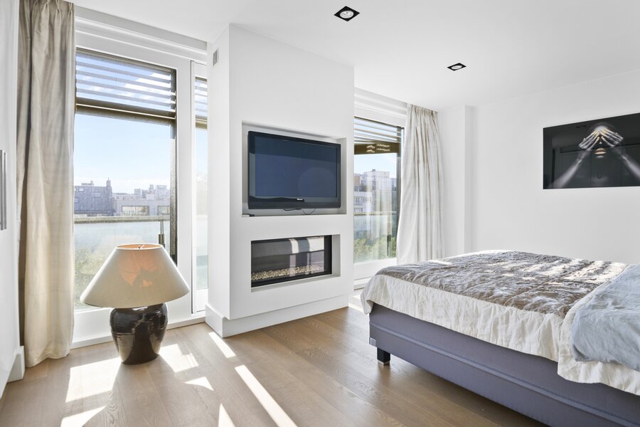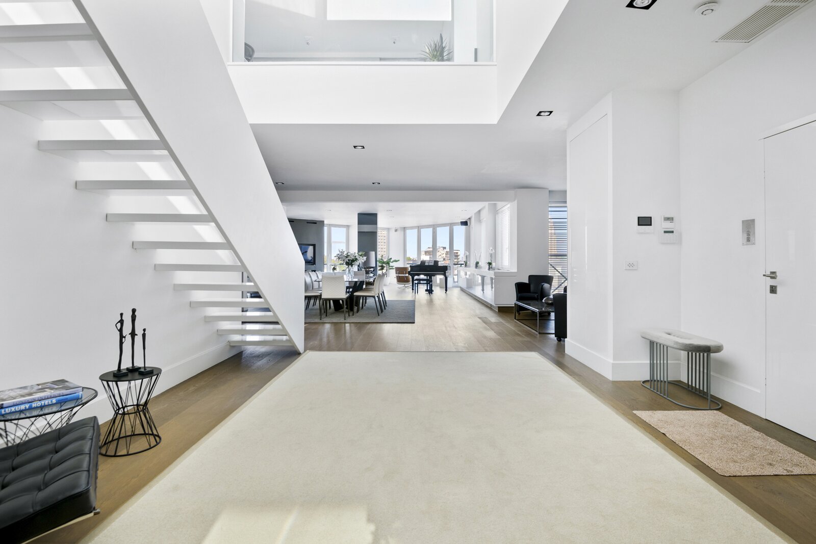 This penthouse was renovated in 2017 by the Dutch interior architect Jan des Bouvrie. The apartment features a private elevator, a living area of 434 m², two large sun terraces totaling 130 m², three storage rooms, and one indoor parking space, with a second parking spot possibly available for purchase at €35,000. The entire apartment is secured with a keypad for triple security. There is colorful LED lighting, air conditioning, white high-gloss built-in cabinets, and Corian finishes. The open entrance hall on the sixth floor provides direct access to the large reception area, with a lounge and dining section, three designer gas fireplaces, and a fully equipped bar with Gaggenau appliances. These include a double fridge/freezer with ice maker, double wine fridge, professional coffee machine, combi-oven, dishwasher, and an instant hot water boiler. This floor also houses two bedrooms, each with a private bathroom equipped with a rain shower with mosaic tiles, double sink, and toilet. The master bedroom additionally features a double jacuzzi with built-in LED lighting. A floating staircase and an internal private elevator connect the sixth and seventh floors. On the seventh floor, there is a private lounge, dining area, library, kitchen with the same Gaggenau appliances as downstairs, and a third bedroom with a shower room. This floor has automatic sunshades and two sun terraces of 90 m² and 40 m². From here, you have a unique view of the Cathedral of Our Lady, the Boerentoren, and the city theater.