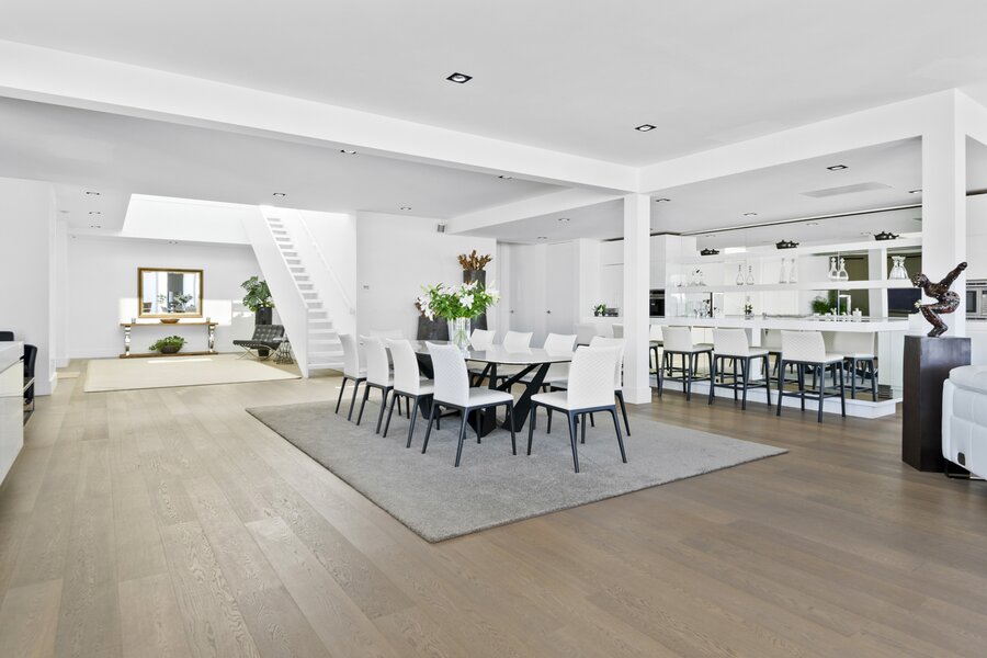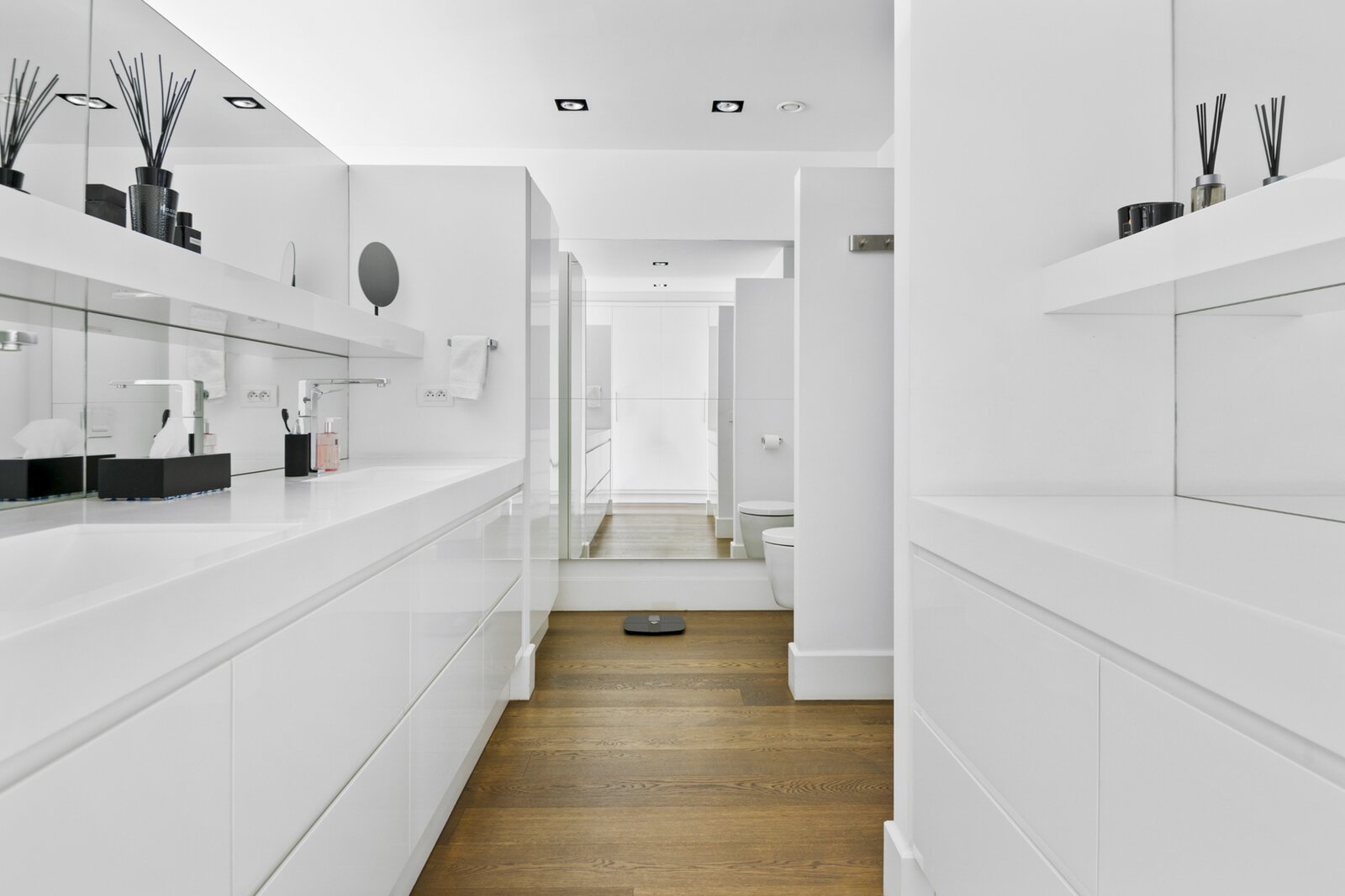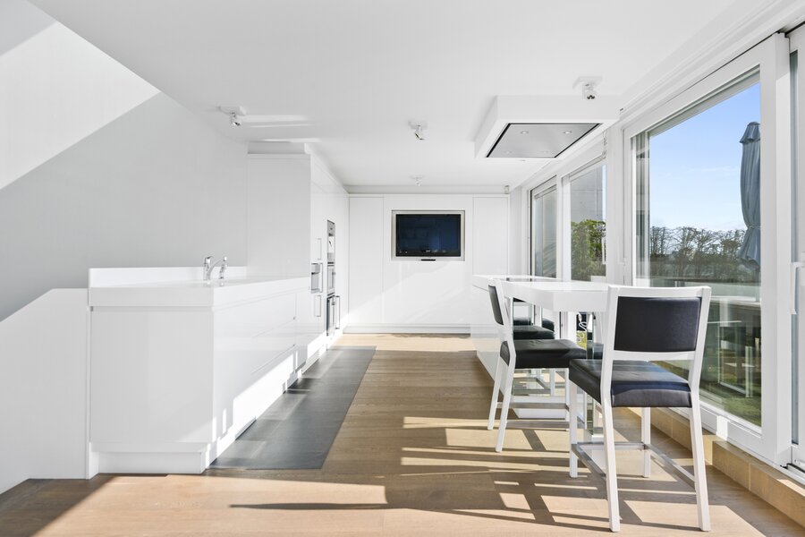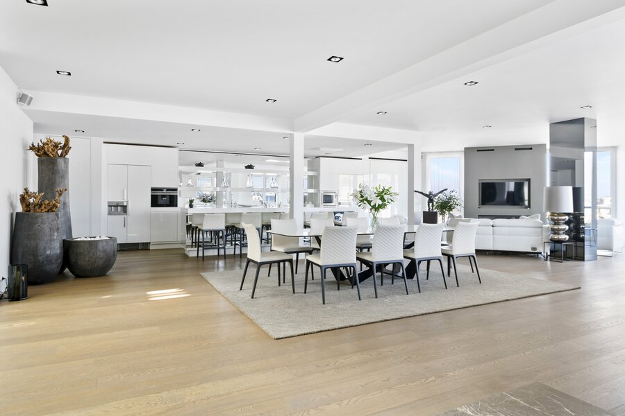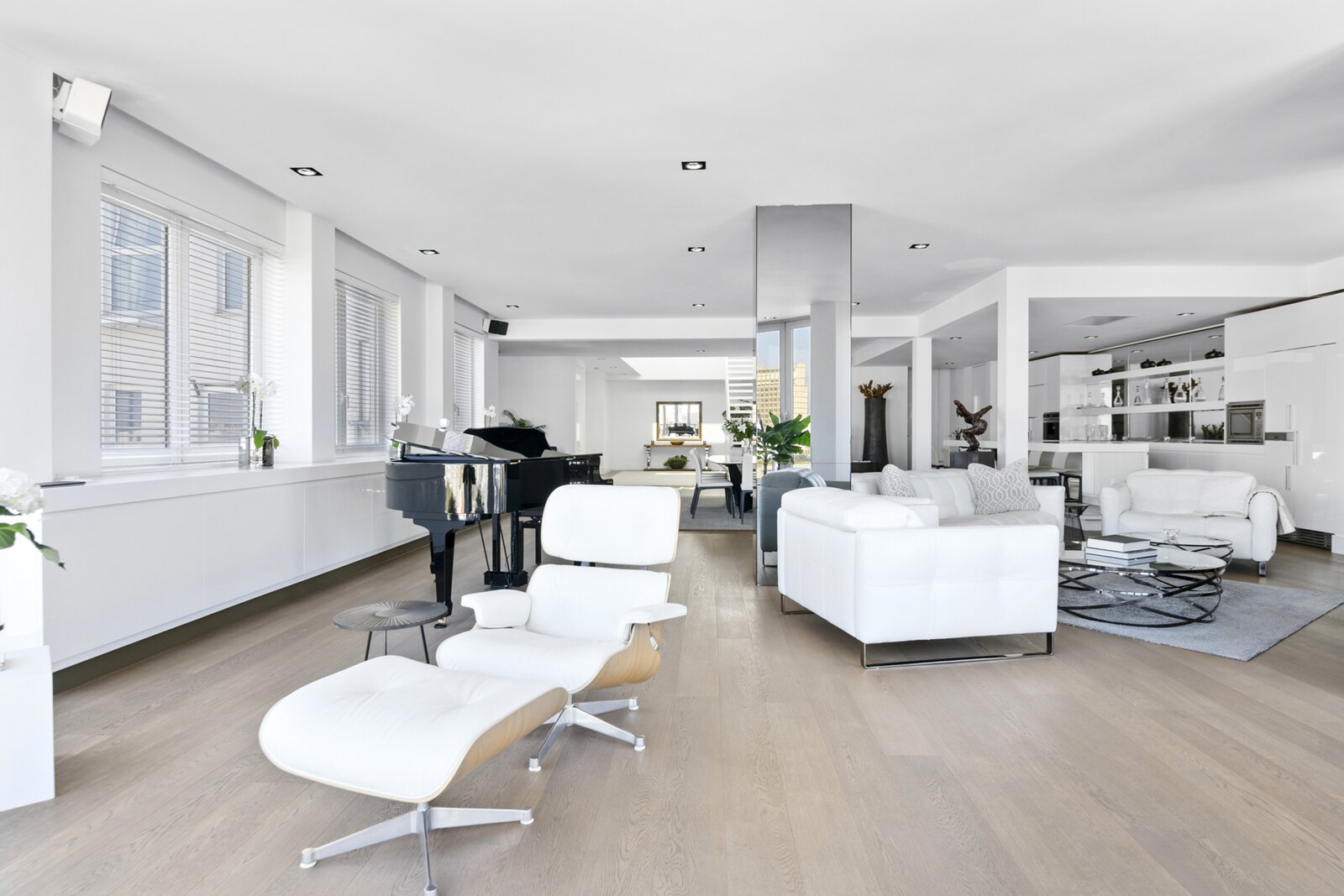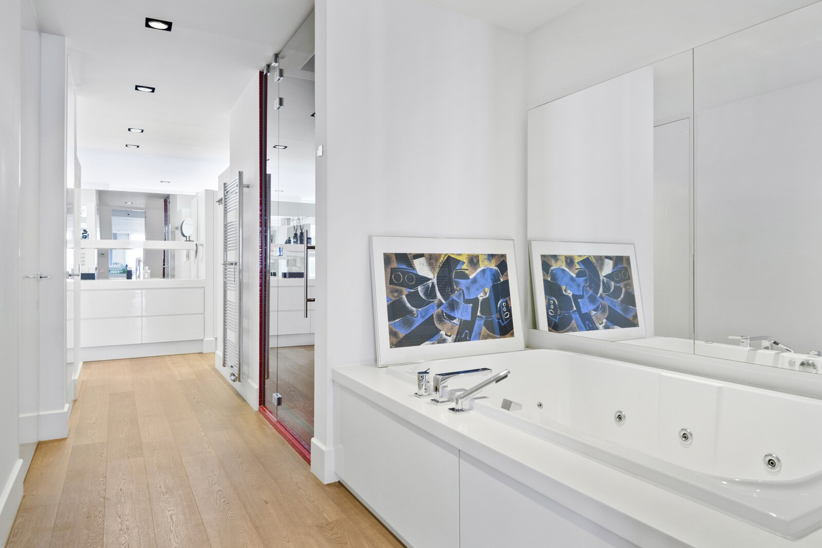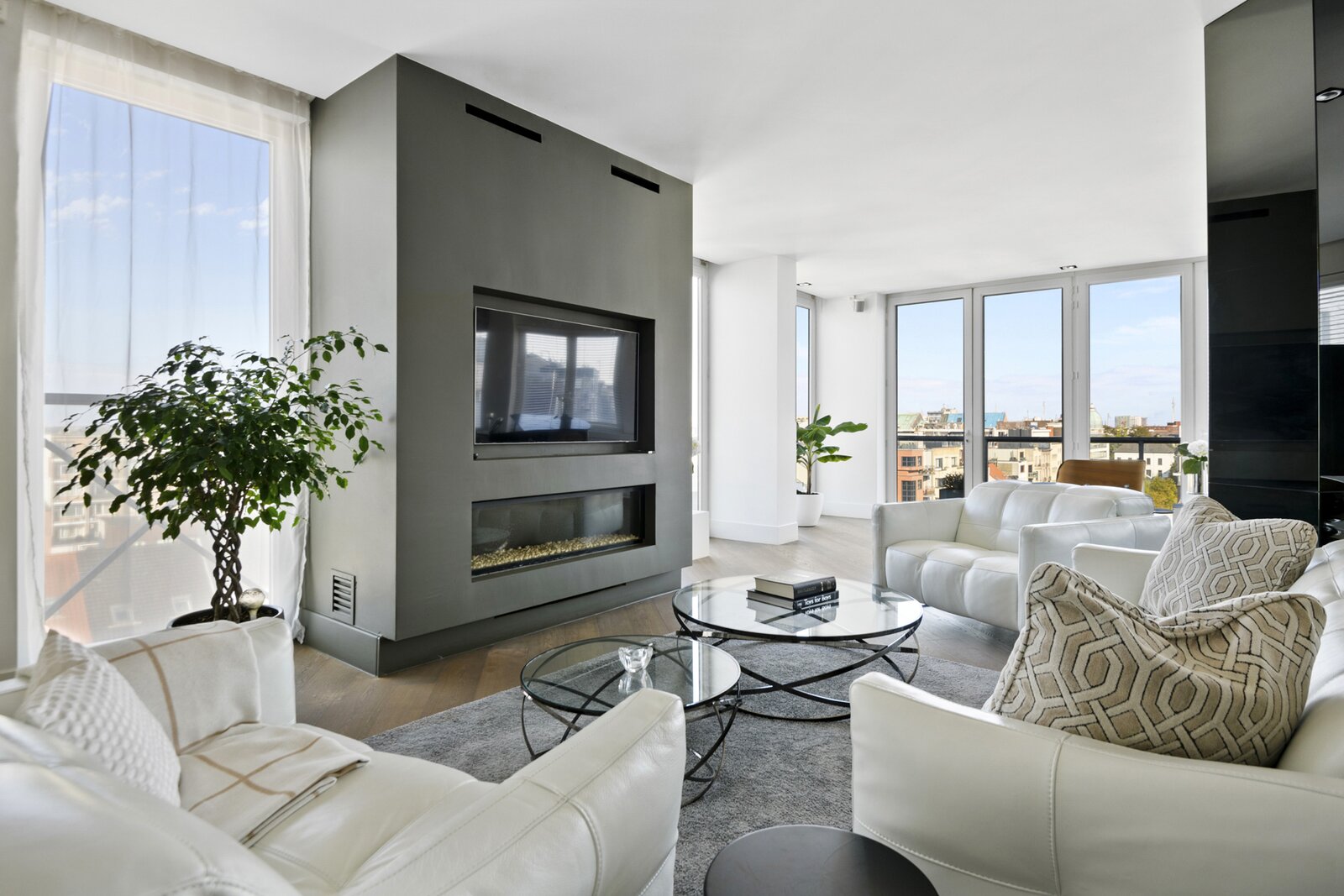 This penthouse was renovated in 2017 by the Dutch interior architect Jan des Bouvrie. The apartment features a private elevator, a living area of 434 m², two large sun terraces totaling 130 m², three storage rooms, and one indoor parking space, with a second parking spot possibly available for purchase at €35,000. The entire apartment is secured with a keypad for triple security. There is colorful LED lighting, air conditioning, white high-gloss built-in cabinets, and Corian finishes. The open entrance hall on the sixth floor provides direct access to the large reception area, with a lounge and dining section, three designer gas fireplaces, and a fully equipped bar with Gaggenau appliances. These include a double fridge/freezer with ice maker, double wine fridge, professional coffee machine, combi-oven, dishwasher, and an instant hot water boiler. This floor also houses two bedrooms, each with a private bathroom equipped with a rain shower with mosaic tiles, double sink, and toilet. The master bedroom additionally features a double jacuzzi with built-in LED lighting. A floating staircase and an internal private elevator connect the sixth and seventh floors. On the seventh floor, there is a private lounge, dining area, library, kitchen with the same Gaggenau appliances as downstairs, and a third bedroom with a shower room. This floor has automatic sunshades and two sun terraces of 90 m² and 40 m². From here, you have a unique view of the Cathedral of Our Lady, the Boerentoren, and the city theater.