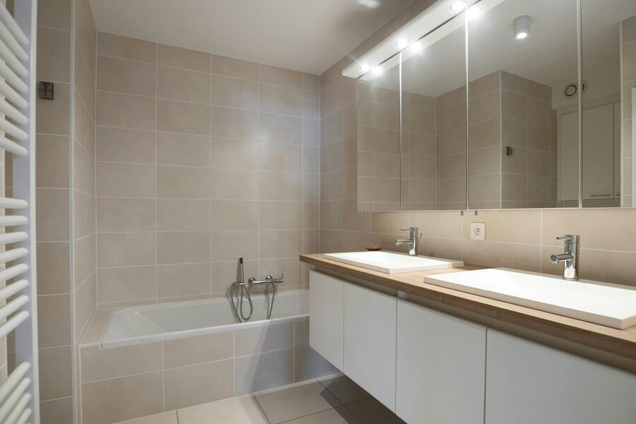 - bathroom with bath, double sink with washbasin, towel dryer and toilet;