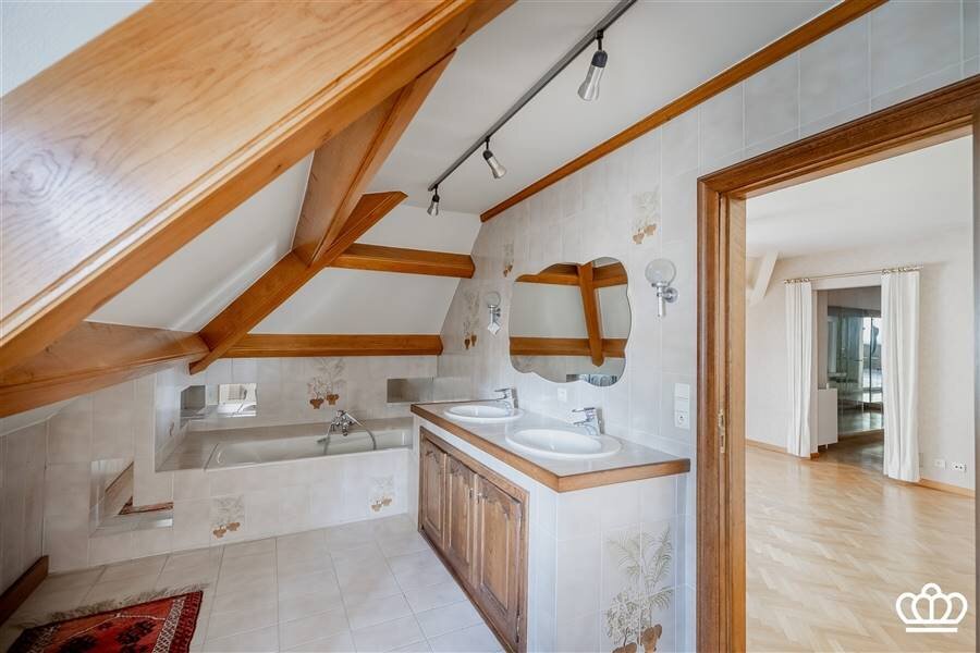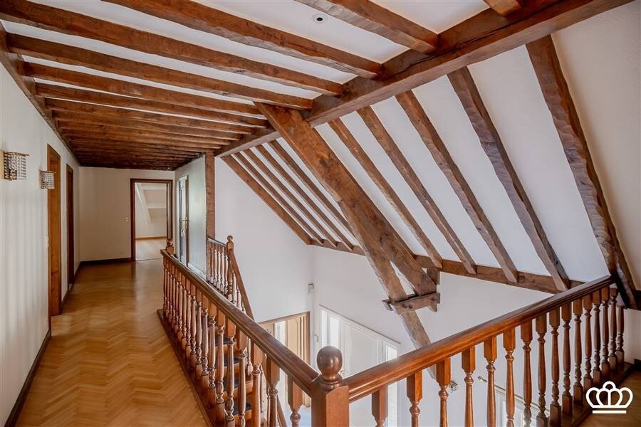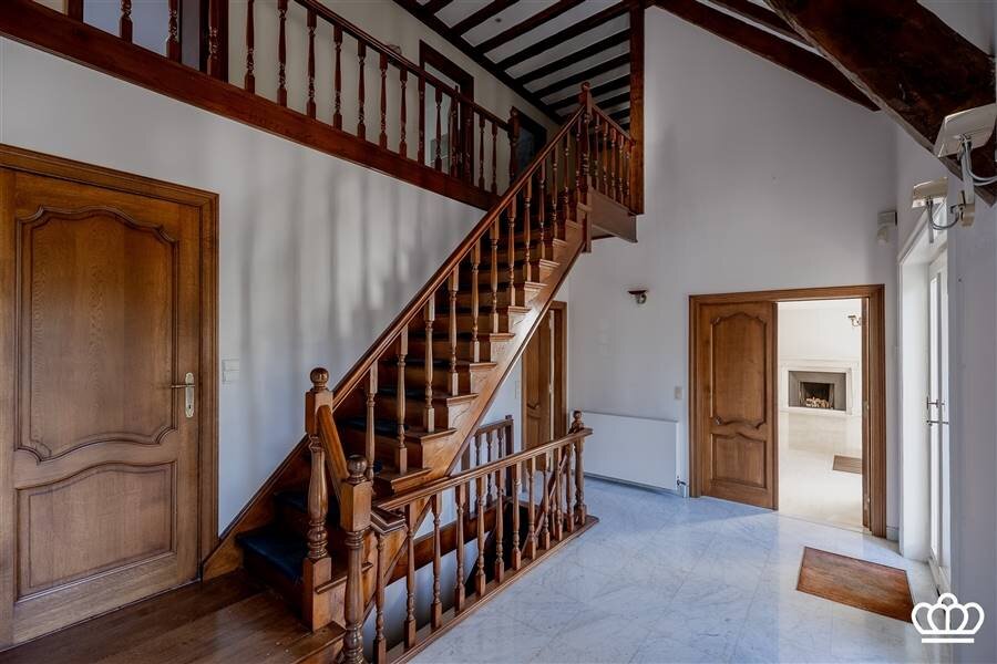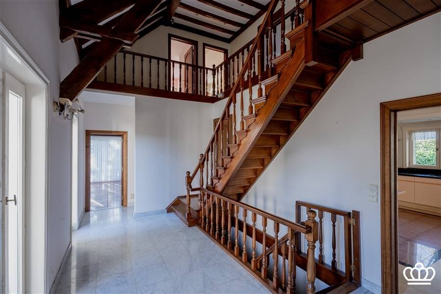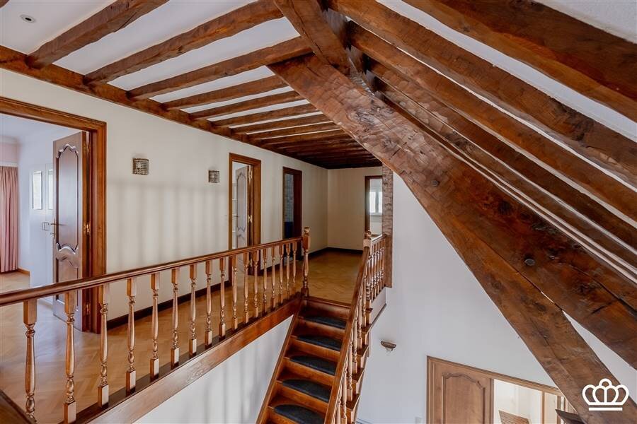 Prachtige houten trap naar de verdieping. Hier bevinden zich vijf ruime slaapkamers, waaronder één master bedroom met een grote en suite badkamer en ruime dressing.