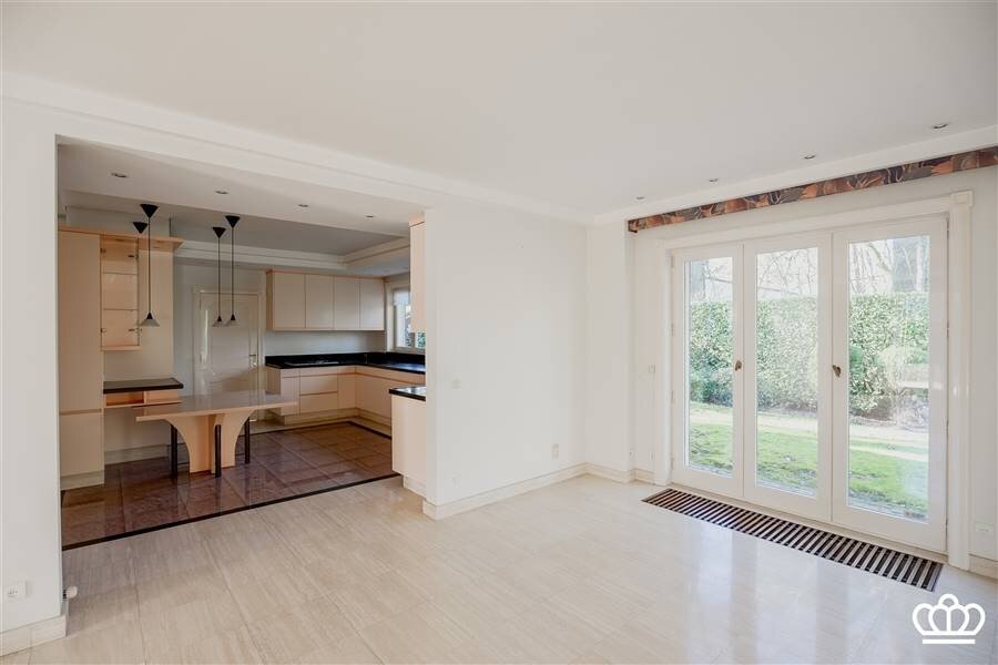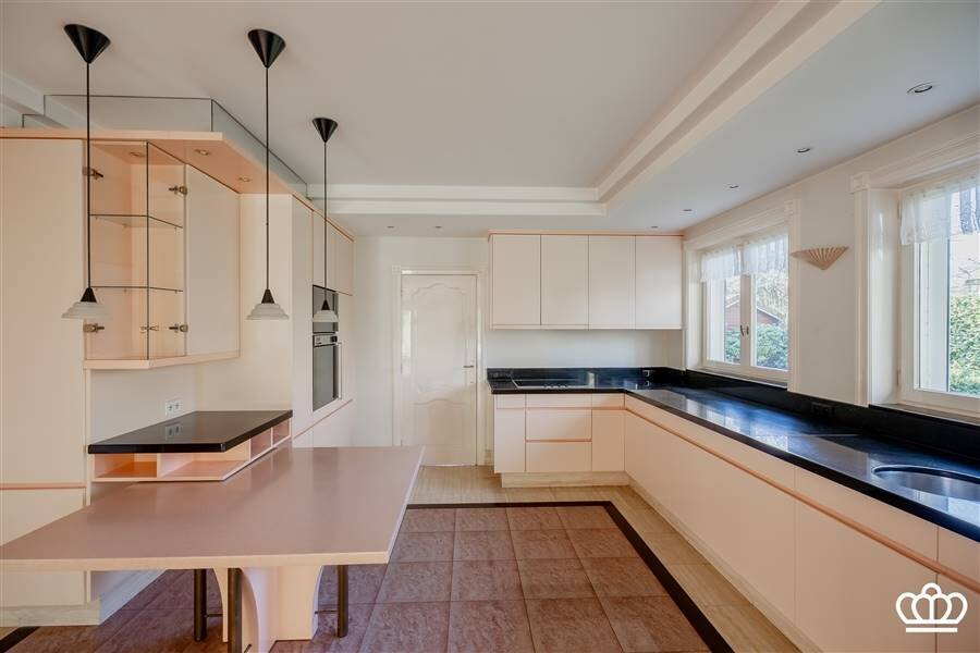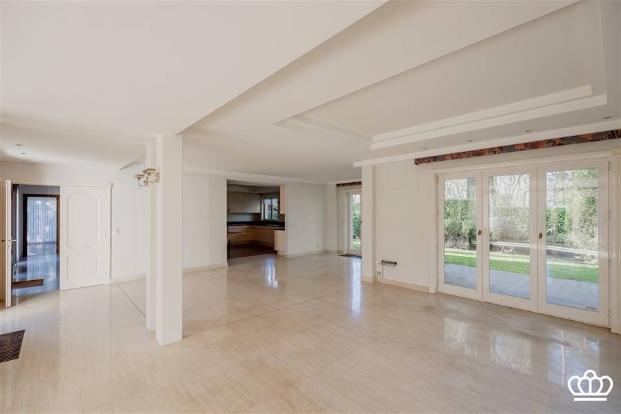 Riante inkomhal met open traphal en schitterende balkenstructuur. Vestiaire en gastentoilet. Grote leefkeuken, uitgerust met alle apparatuur, en eethoek. De keuken staat in open verbinding met de woonkamer. Deze baadt in het licht dankzij de vele raampartijen, is bijzonder ruim en biedt uitzicht op de omliggende tuin. Vanuit de keuken is er toegang tot een grote bijkeuken en een dubbele inpandige garage.