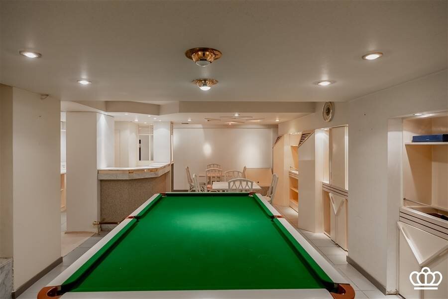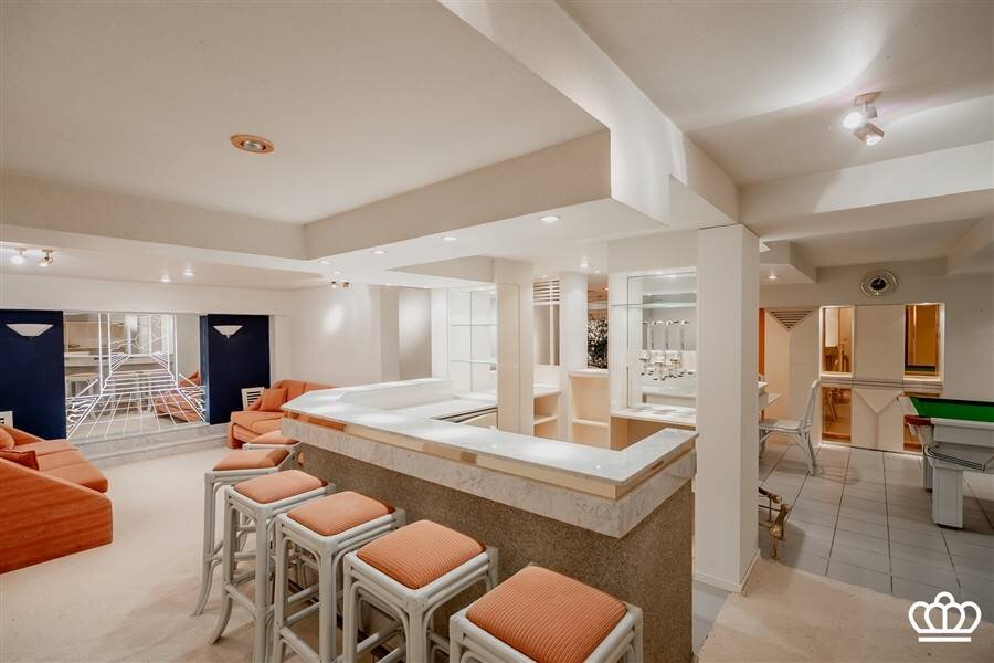 De kelderverdieping is bereikbaar vanuit de inkomhal en de garage. Ze is volledig en volwaardig ingericht, en verdeeld in verschillende ruimtes, waaronder een hobbyruimte, voorraadruimte, wijnkelder en een grote bar met biljart.