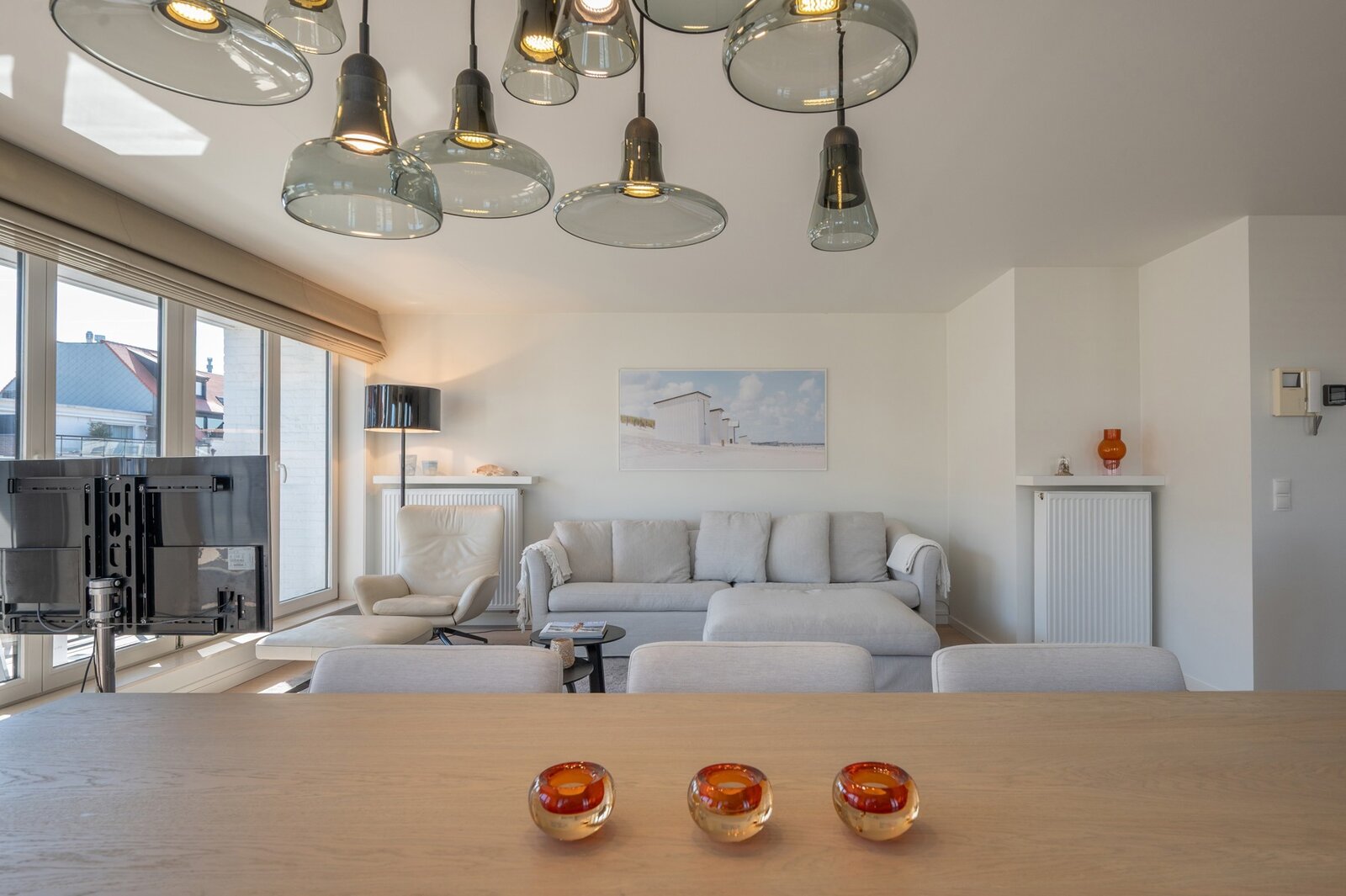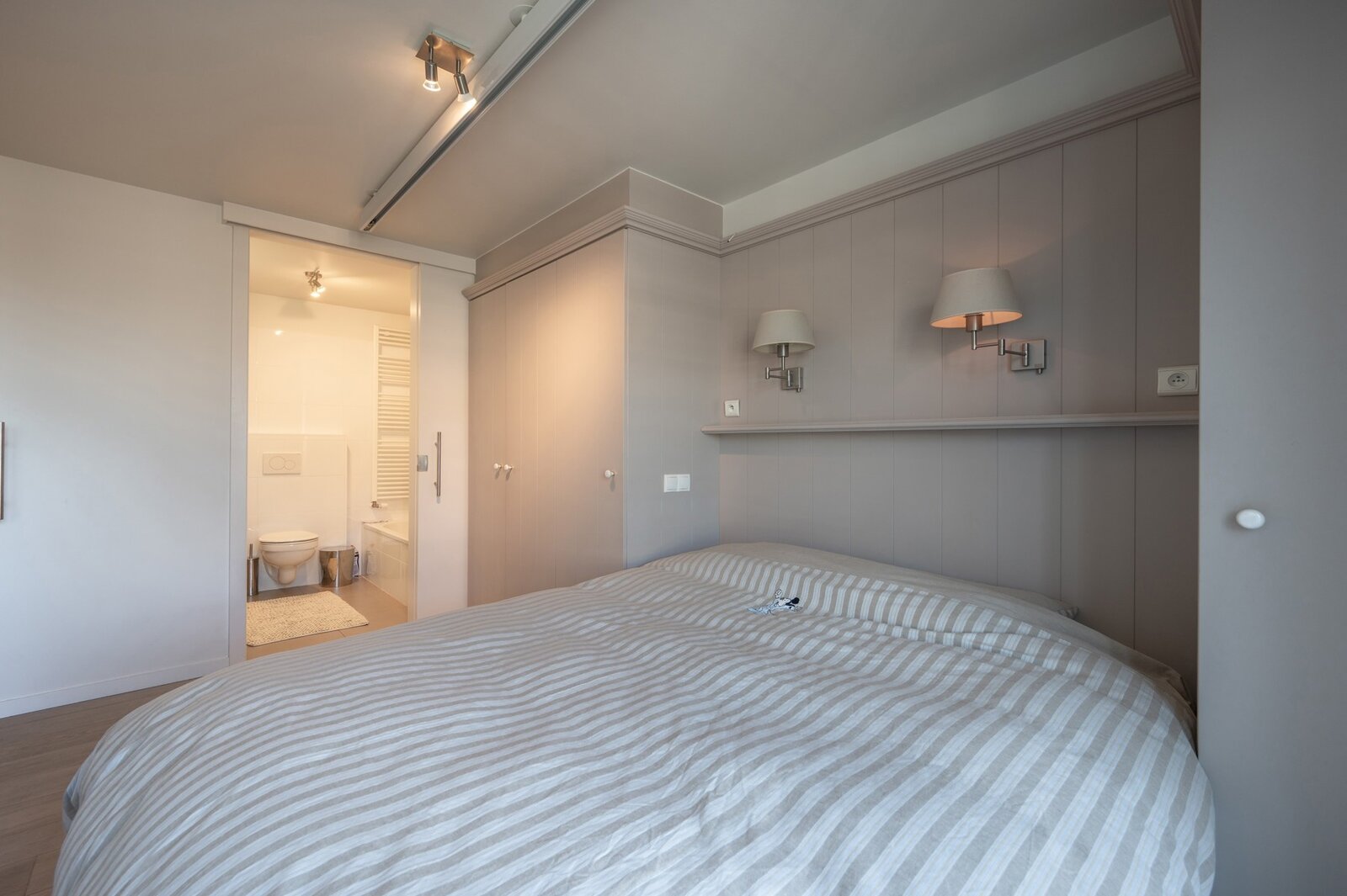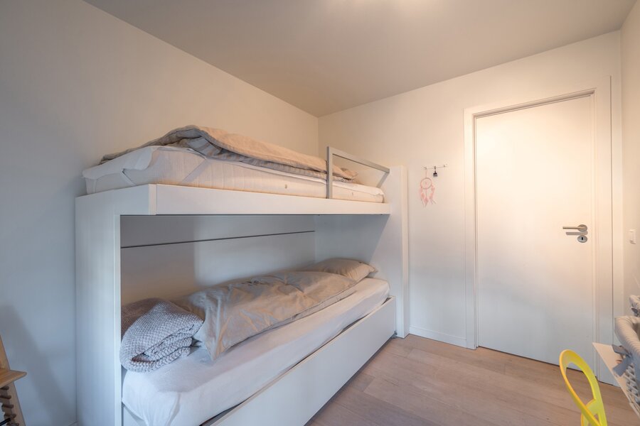 Indeling : inkomhal met vestiairekast en gastentoilet, uitzonderlijk lichtrijke woonkamer met maar liefst 9 raampartijen, uitgevend op een zonnig terras. Volledig uitgeruste keuken. Berging voorzien van aansluitingen voor wasmachine en droogkast. Ruime masterbedroom met ingemaakte kasten en ensuite badkamer. Daarnaast zijn er nog twee volwaardige slaapkamers, waarvan één voorzien van ingebouwde kasten.