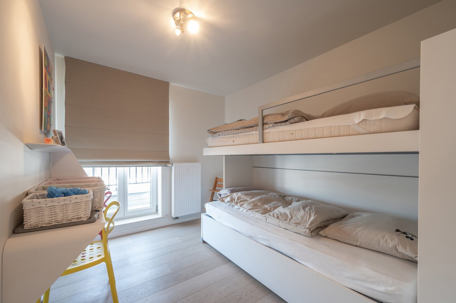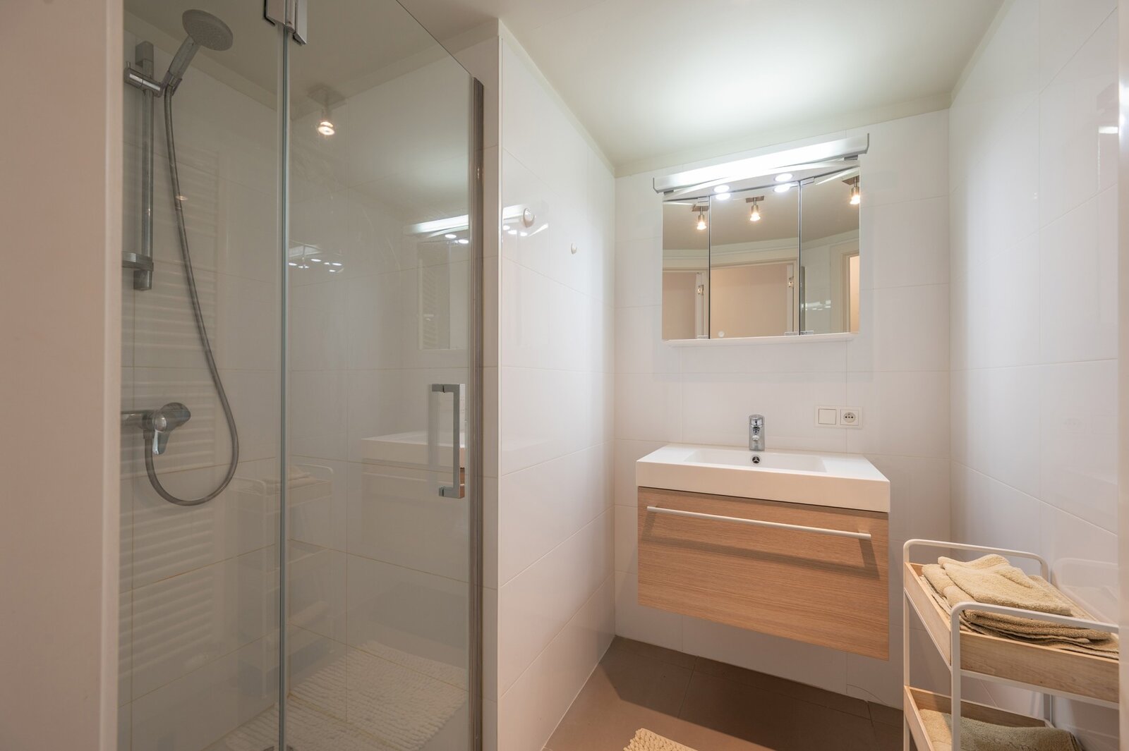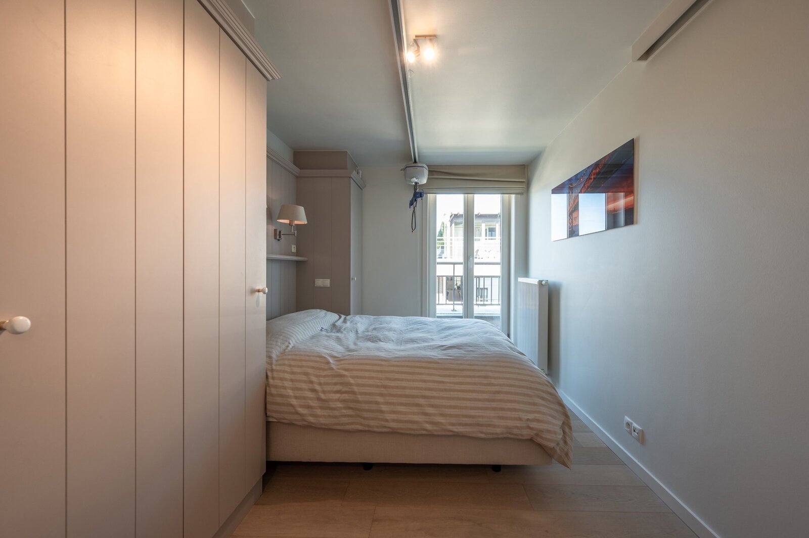 Indeling : inkomhal met vestiairekast en gastentoilet, uitzonderlijk lichtrijke woonkamer met maar liefst 9 raampartijen, uitgevend op een zonnig terras. Volledig uitgeruste keuken. Berging voorzien van aansluitingen voor wasmachine en droogkast. Ruime masterbedroom met ingemaakte kasten en ensuite badkamer. Daarnaast zijn er nog twee volwaardige slaapkamers, waarvan één voorzien van ingebouwde kasten.