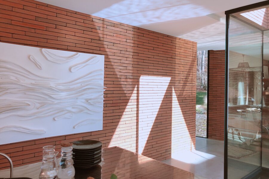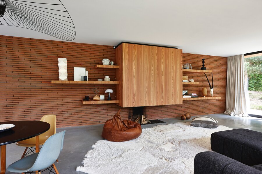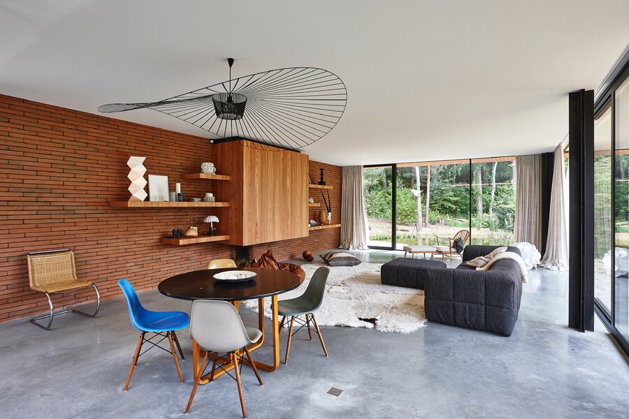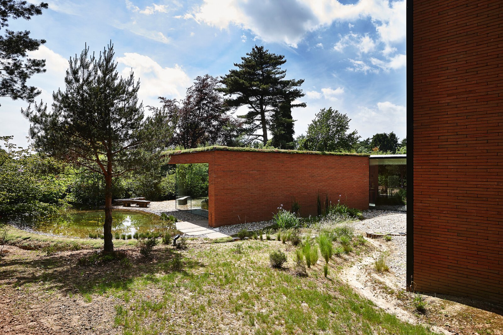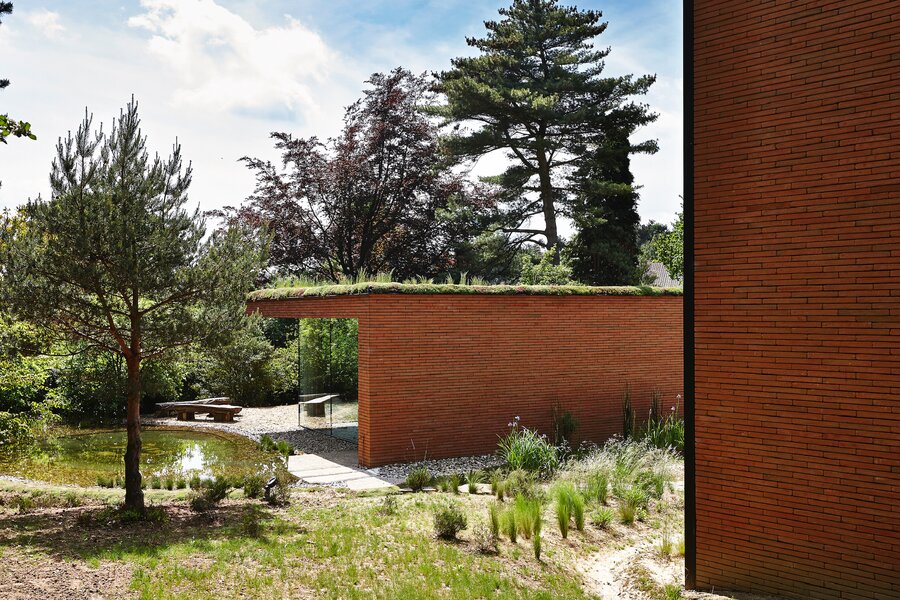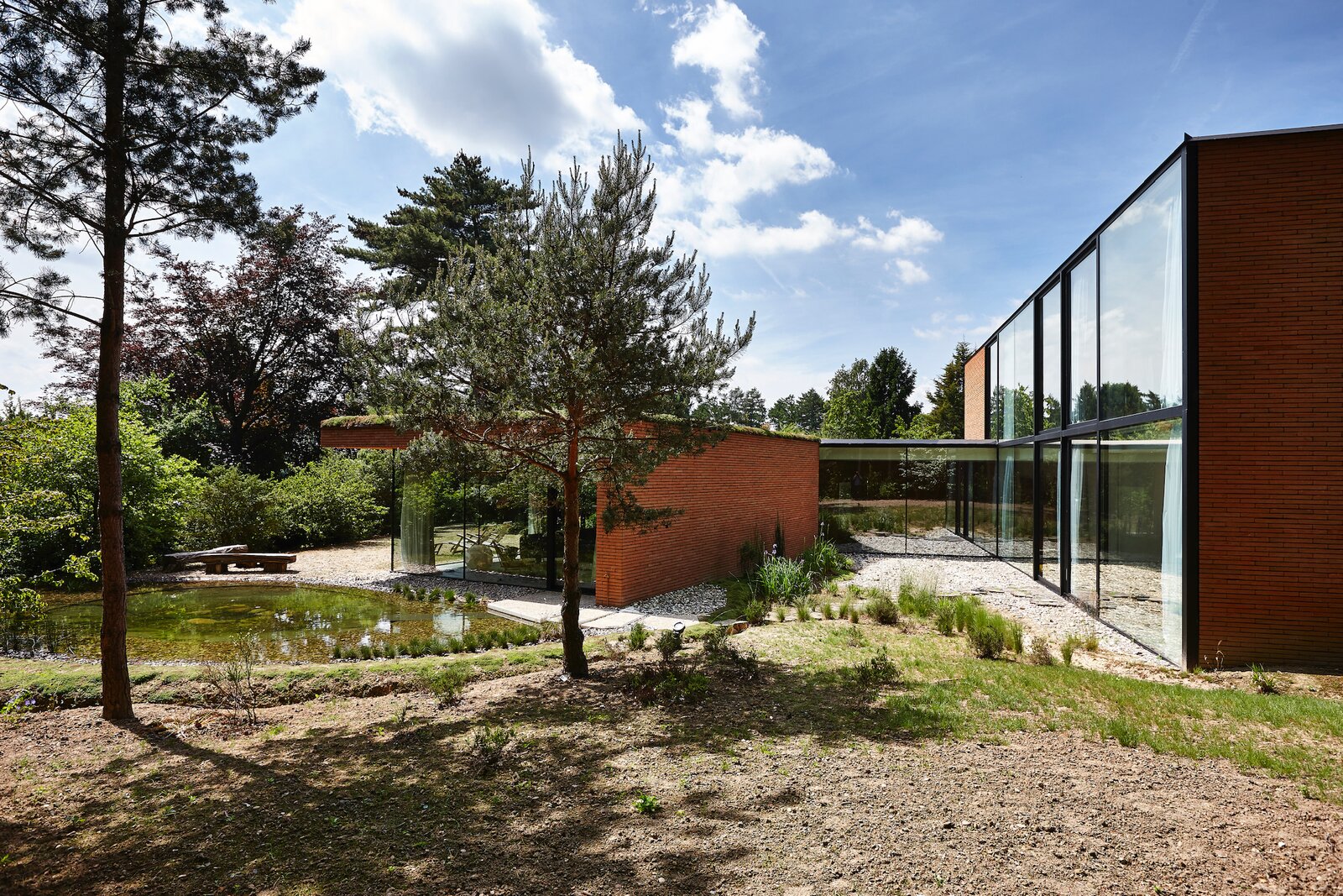 This unique villa by Bruno Erpicum lies at the end of a private road in Uccle, right next to the Sonian Forest, in a protected Natura 2000 area. From the street, the house is almost invisible—its closed façade in Italian terracotta brick hides all openings and the entrance, creating a monolithic presence. Inside, the house opens around a large patio, structuring space and light. Three long, slightly offset volumes define the layout, providing a natural flow between living, work and private areas. The open-plan living space, with integrated kitchen, faces south and overlooks the forest through full-height windows. A separate office entrance allows professional use. Upstairs are three bedrooms and two bathrooms. Materials include béton lissé, larch wood, and raw brick—aged and tactile by design. Outside, terraces connect to a garden by Christophe Spehar, featuring a pond and green roof. A rare property where architecture, nature and silence meet.