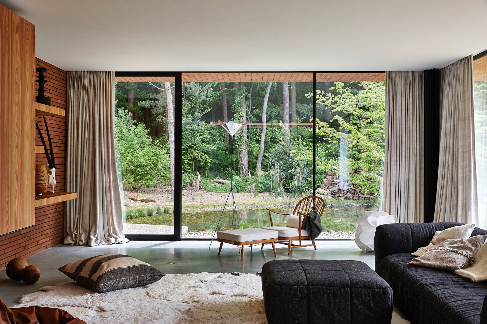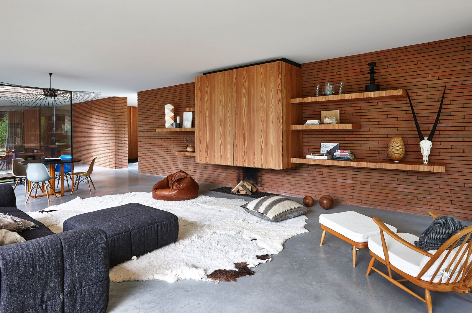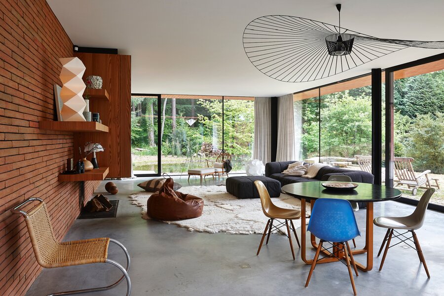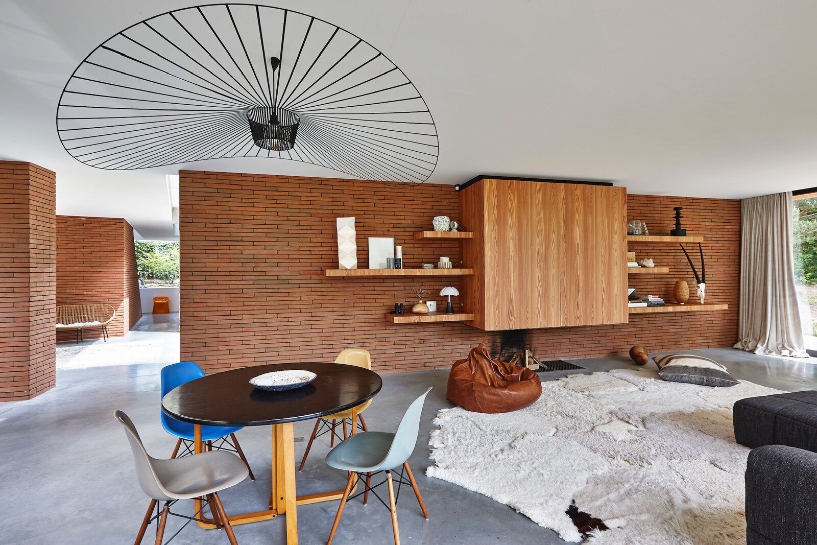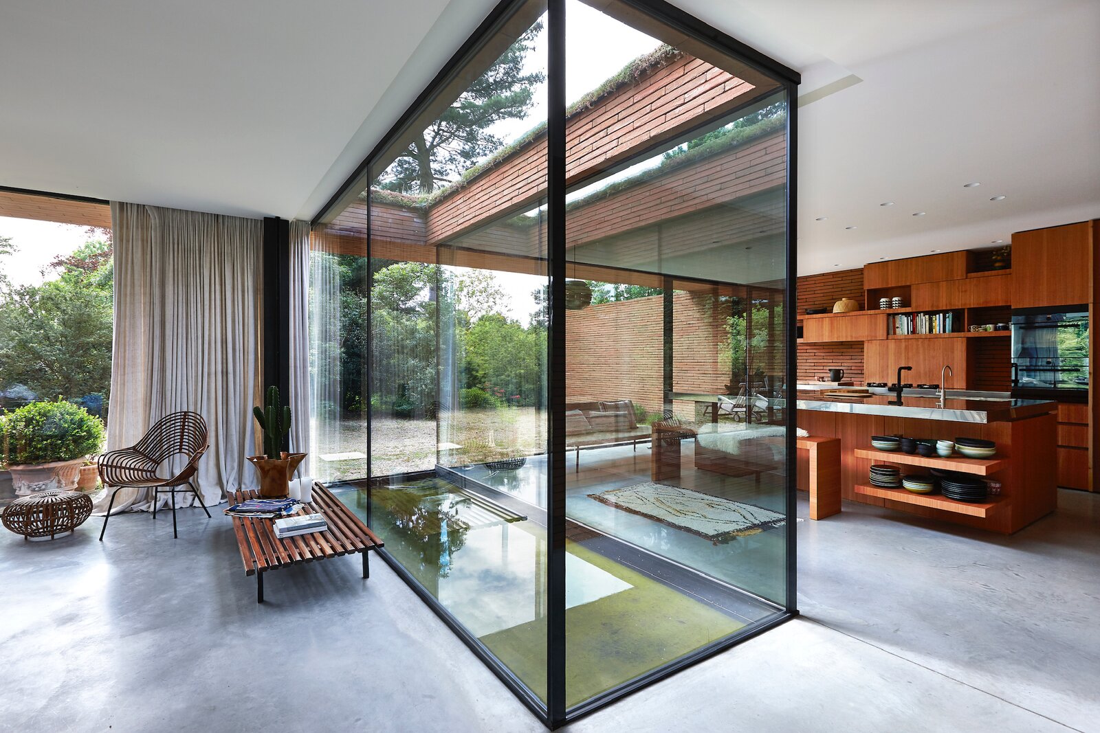 This unique villa by Bruno Erpicum lies at the end of a private road in Uccle, right next to the Sonian Forest, in a protected Natura 2000 area. From the street, the house is almost invisible—its closed façade in Italian terracotta brick hides all openings and the entrance, creating a monolithic presence. Inside, the house opens around a large patio, structuring space and light. Three long, slightly offset volumes define the layout, providing a natural flow between living, work and private areas. The open-plan living space, with integrated kitchen, faces south and overlooks the forest through full-height windows. A separate office entrance allows professional use. Upstairs are three bedrooms and two bathrooms. Materials include béton lissé, larch wood, and raw brick—aged and tactile by design. Outside, terraces connect to a garden by Christophe Spehar, featuring a pond and green roof. A rare property where architecture, nature and silence meet.