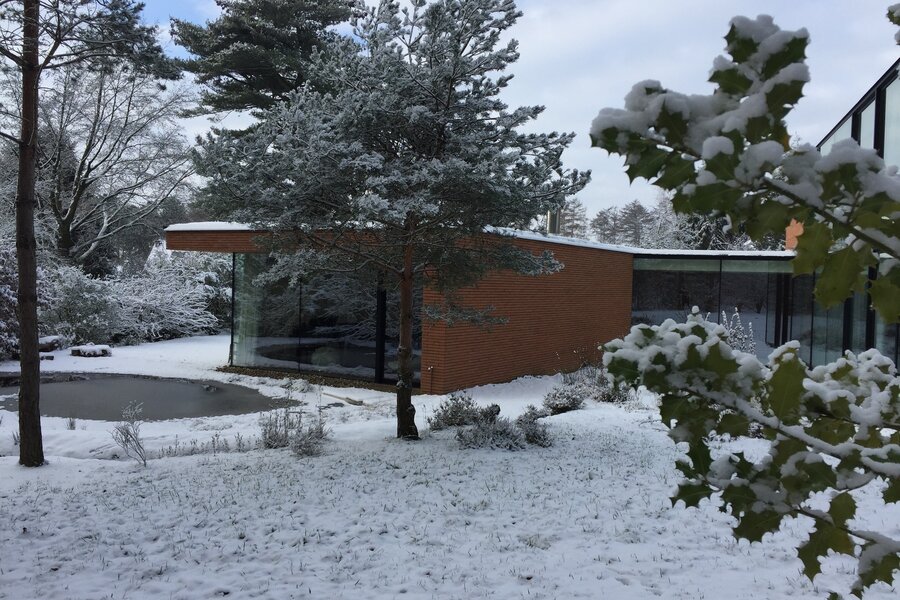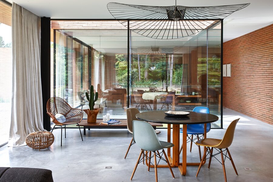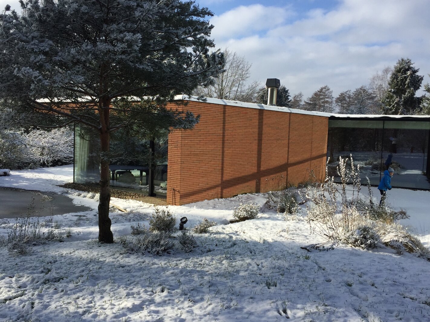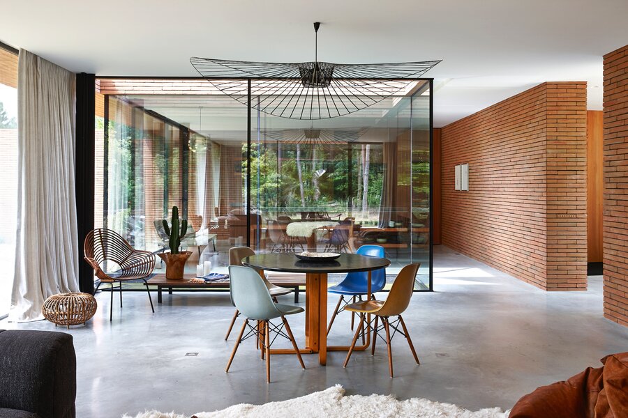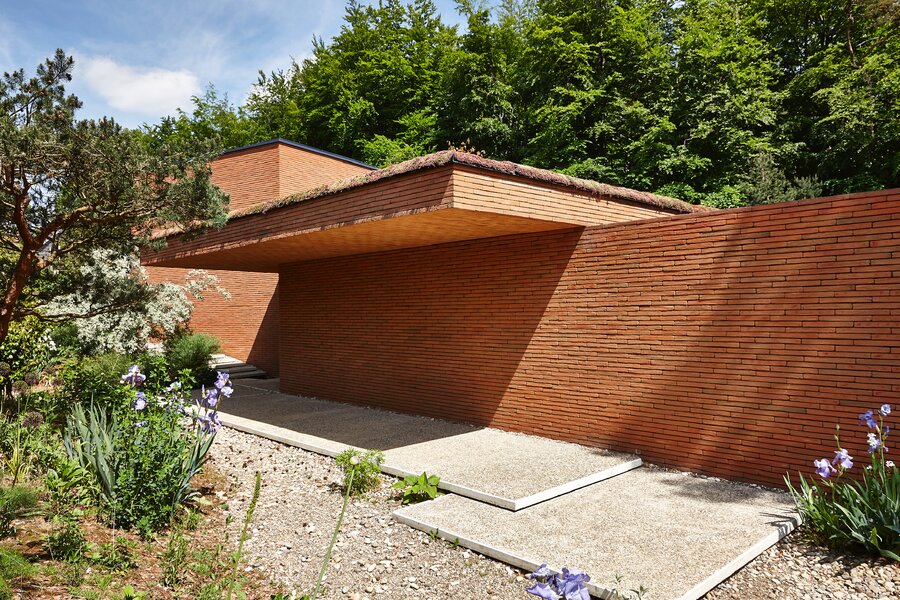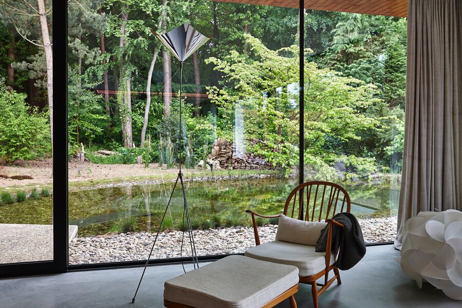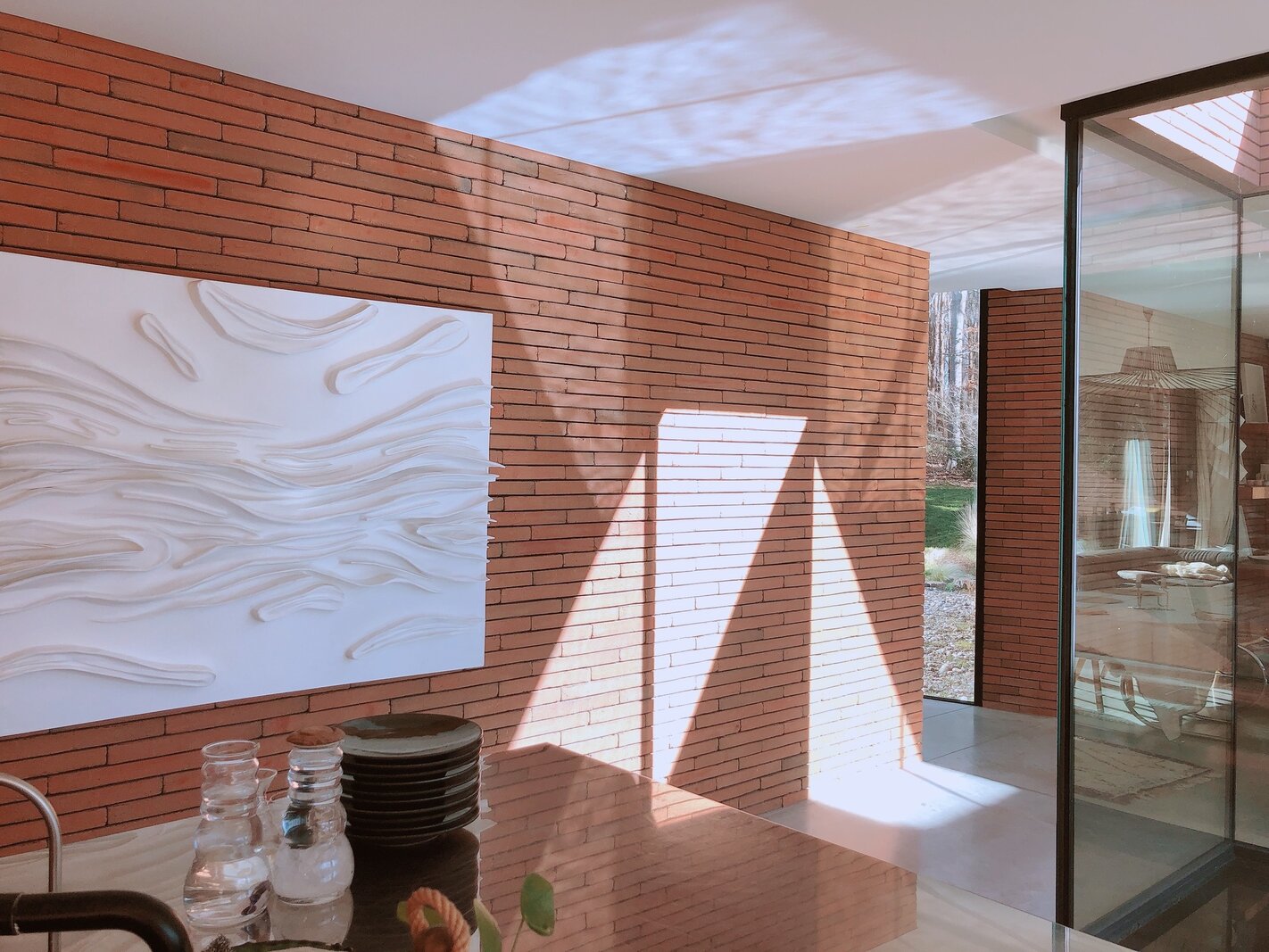 This unique villa by Bruno Erpicum lies at the end of a private road in Uccle, right next to the Sonian Forest, in a protected Natura 2000 area. From the street, the house is almost invisible—its closed façade in Italian terracotta brick hides all openings and the entrance, creating a monolithic presence. Inside, the house opens around a large patio, structuring space and light. Three long, slightly offset volumes define the layout, providing a natural flow between living, work and private areas. The open-plan living space, with integrated kitchen, faces south and overlooks the forest through full-height windows. A separate office entrance allows professional use. Upstairs are three bedrooms and two bathrooms. Materials include béton lissé, larch wood, and raw brick—aged and tactile by design. Outside, terraces connect to a garden by Christophe Spehar, featuring a pond and green roof. A rare property where architecture, nature and silence meet.