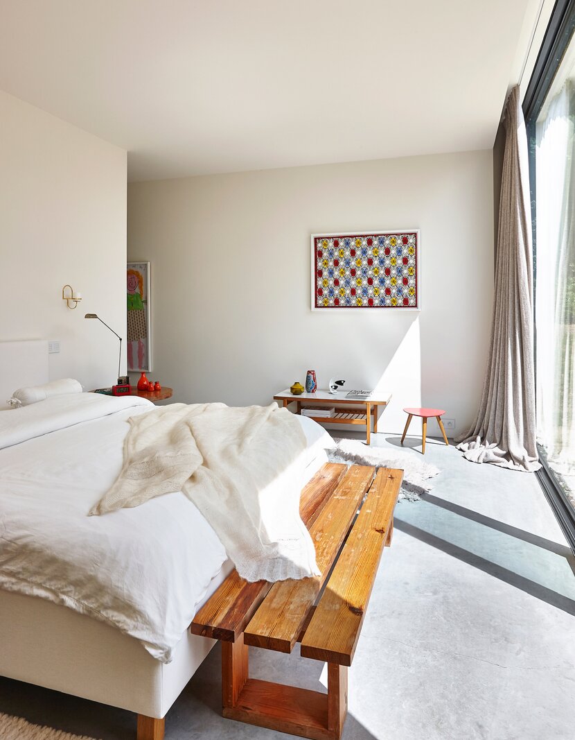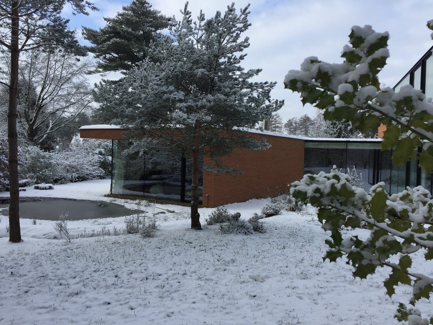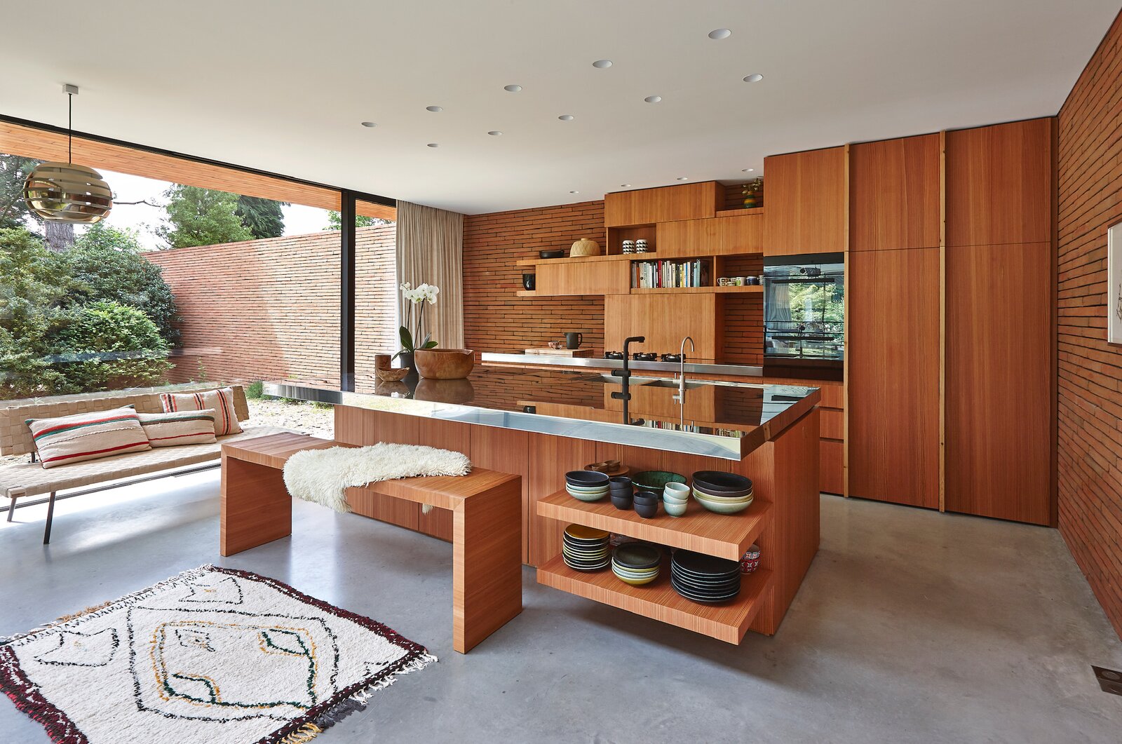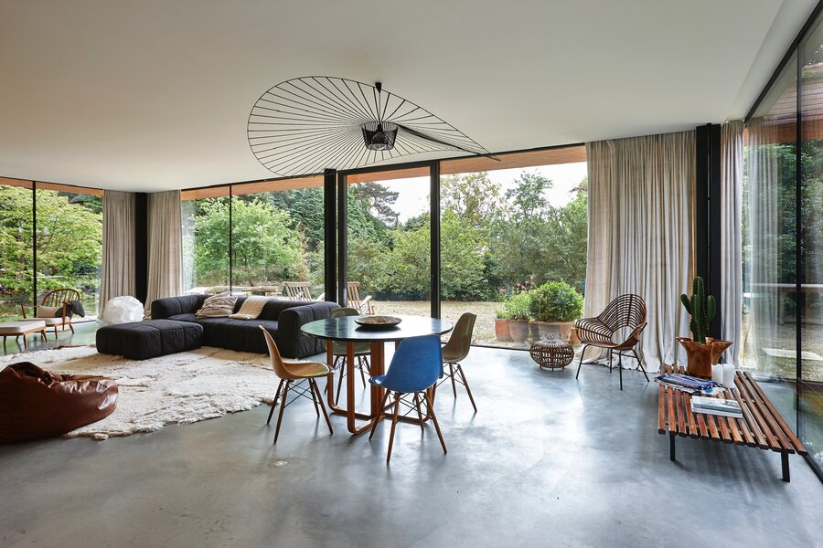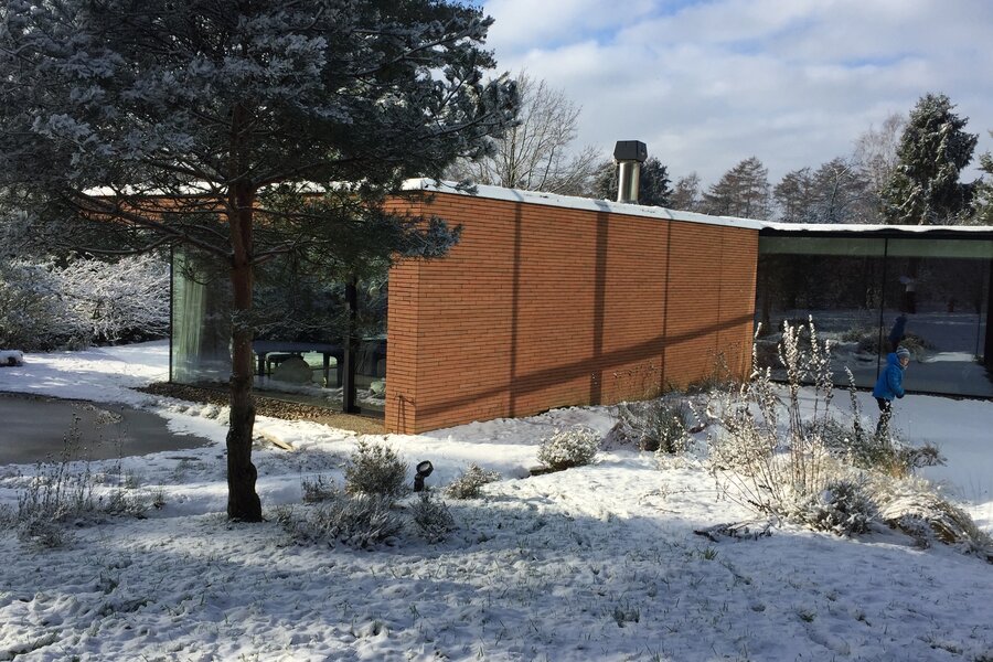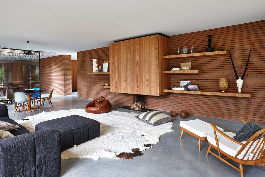 This unique villa by Bruno Erpicum lies at the end of a private road in Uccle, right next to the Sonian Forest, in a protected Natura 2000 area. From the street, the house is almost invisible—its closed façade in Italian terracotta brick hides all openings and the entrance, creating a monolithic presence. Inside, the house opens around a large patio, structuring space and light. Three long, slightly offset volumes define the layout, providing a natural flow between living, work and private areas. The open-plan living space, with integrated kitchen, faces south and overlooks the forest through full-height windows. A separate office entrance allows professional use. Upstairs are three bedrooms and two bathrooms. Materials include béton lissé, larch wood, and raw brick—aged and tactile by design. Outside, terraces connect to a garden by Christophe Spehar, featuring a pond and green roof. A rare property where architecture, nature and silence meet.
