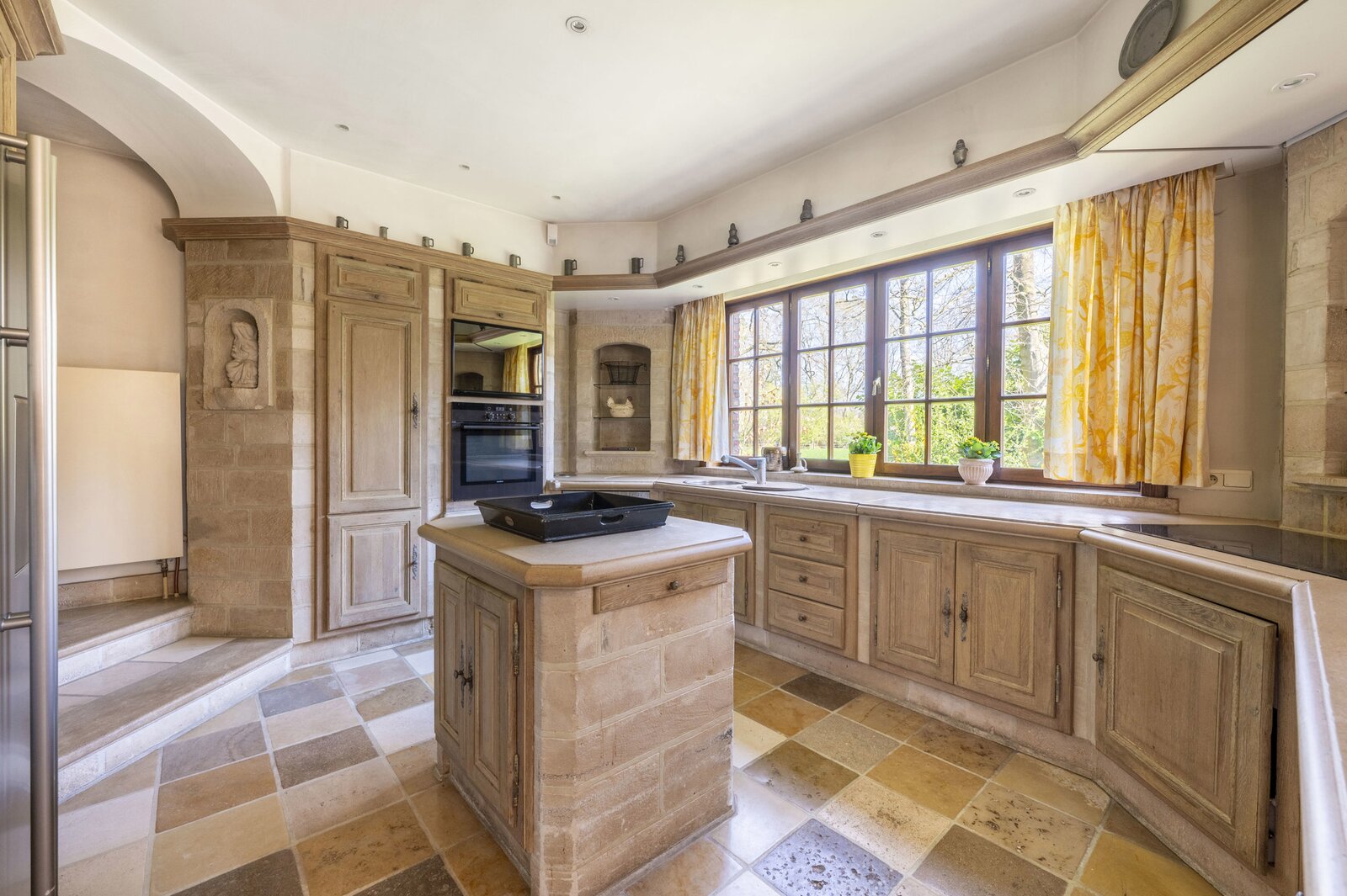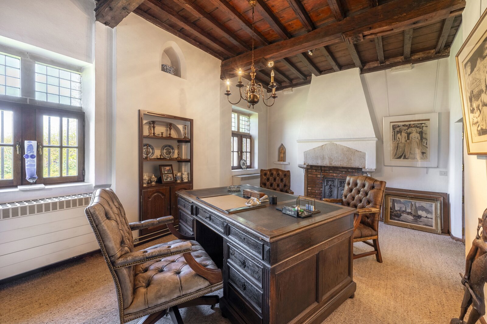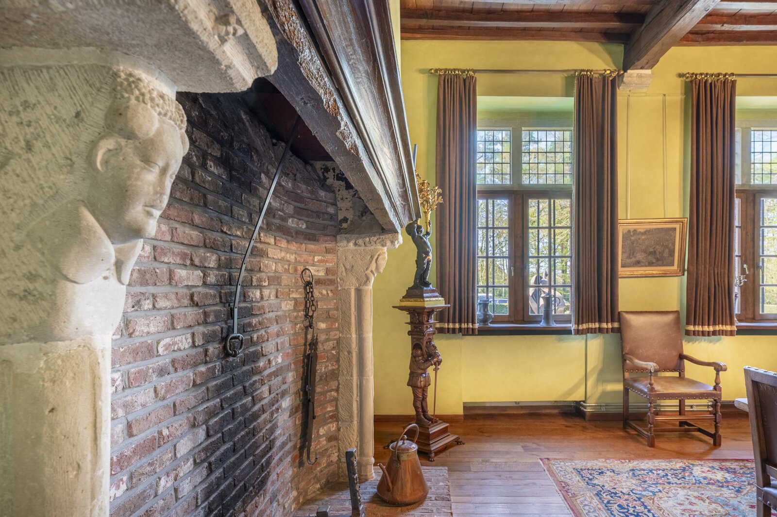Op de gelijkvloers treft u volgende indeling: U komt binnen via de ontvangstkamer en “ridderzaal”. De keuken, in volle eik en natuursteen, is uitgerust met de nodige toestellen. Praktisch is de bijkeuken en bergruimte. De living heeft uitzicht op het prachtige parkdomein en vijver. Er is heel wat maatwerk terug te vinden doorheen de woonst. Dit onder de vorm van: ingemaakte kasten, restauratie authentieke elementen, en natuursteen.
