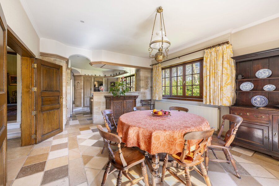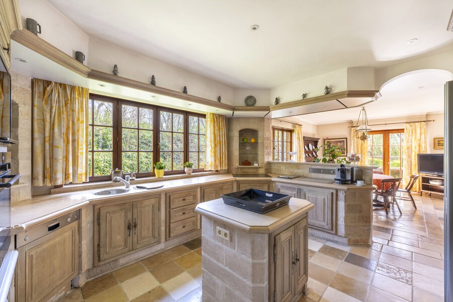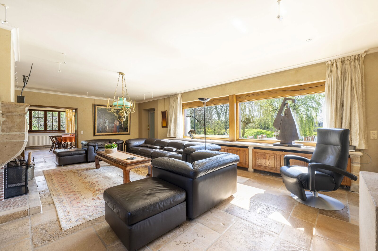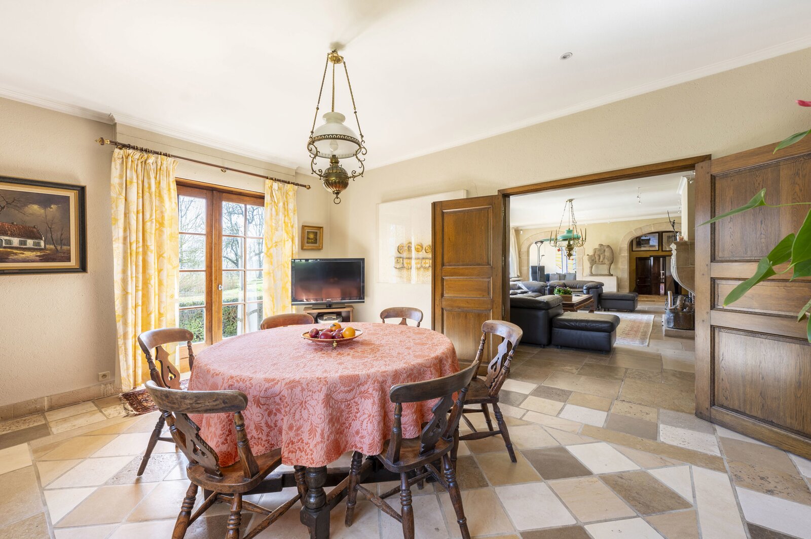 Op de gelijkvloers treft u volgende indeling: U komt binnen via de ontvangstkamer en “ridderzaal”. De keuken, in volle eik en natuursteen, is uitgerust met de nodige toestellen. Praktisch is de bijkeuken en bergruimte. De living heeft uitzicht op het prachtige parkdomein en vijver. Er is heel wat maatwerk terug te vinden doorheen de woonst. Dit onder de vorm van: ingemaakte kasten, restauratie authentieke elementen, en natuursteen.