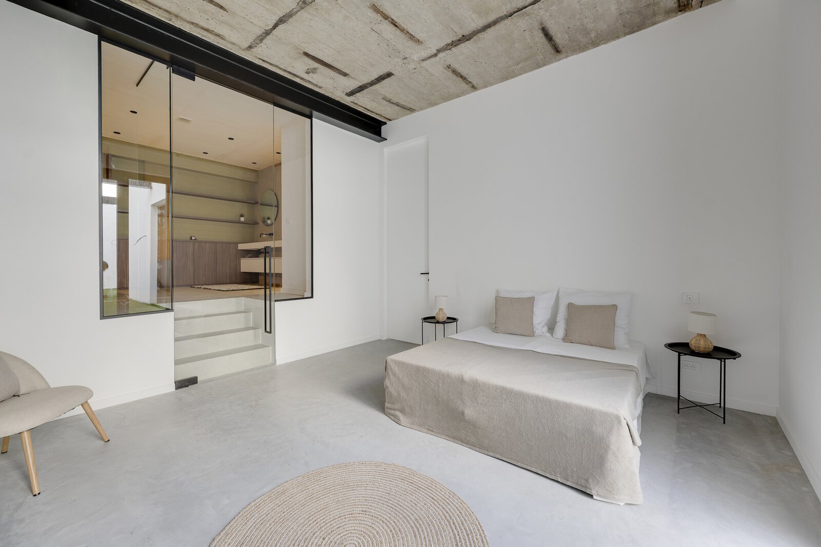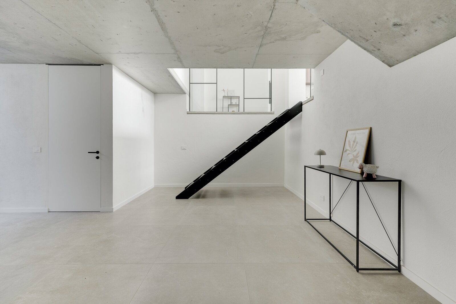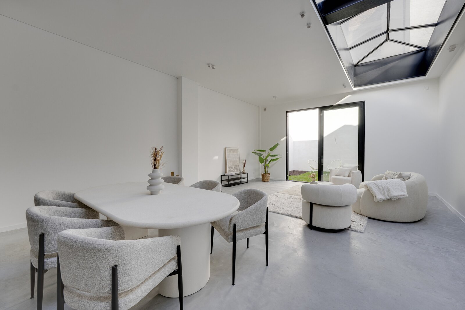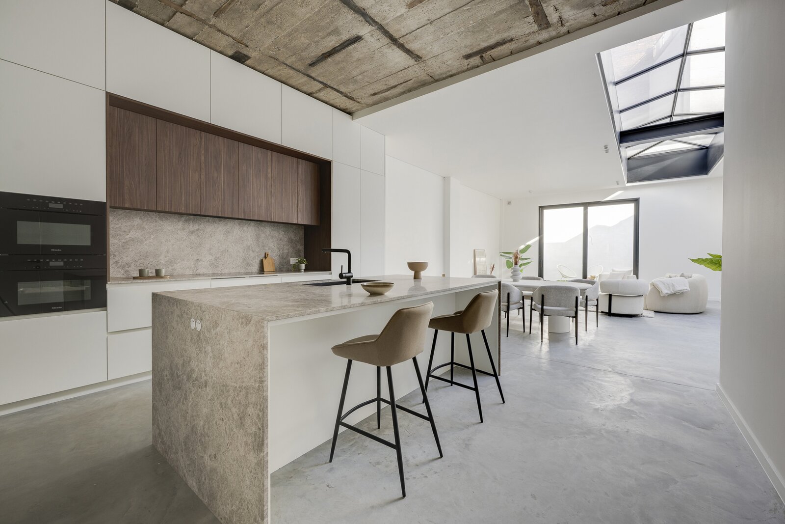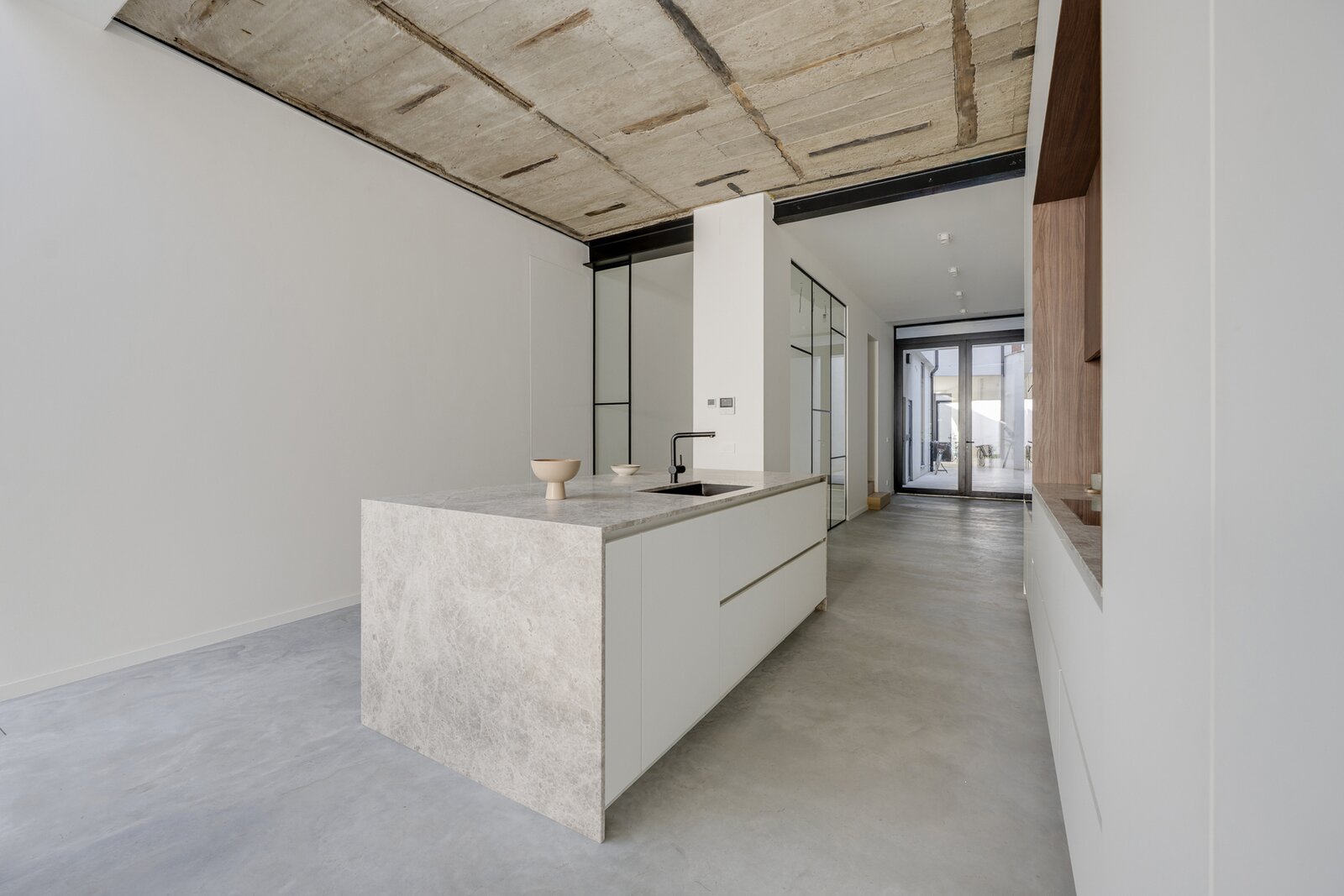 De royale leefruimte met strakke betonvloer en grote raampartijen vormt het hart van de loft en sluit naadloos aan op de zonnige, uiterst rustige tuin met uitstekende privacy.