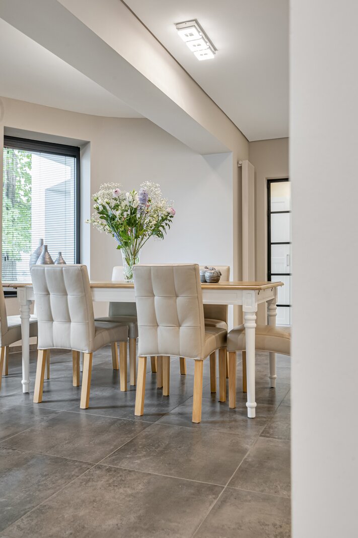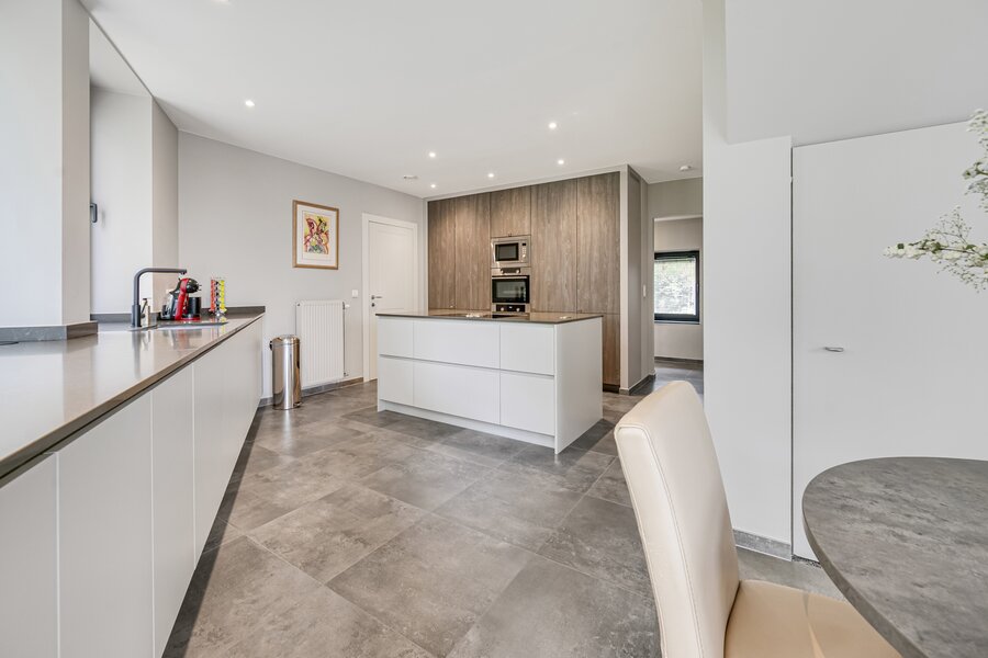 De stijlvolle eetkamer is voorzien van maatkasten en loopt via een stalen deur over in de hyper uitgeruste keuken. De keuken beschikt over een composiet werkblad en hoogwaardige toestellen, waaronder inductiekookplaat met ingewerkte dampkap, vaatwasser, koelkast, diepvries, oven, microgolf- en stoomoven. Aansluitend vindt u een koele berging, een aparte wasplaats met extra berging en een gastentoilet.
