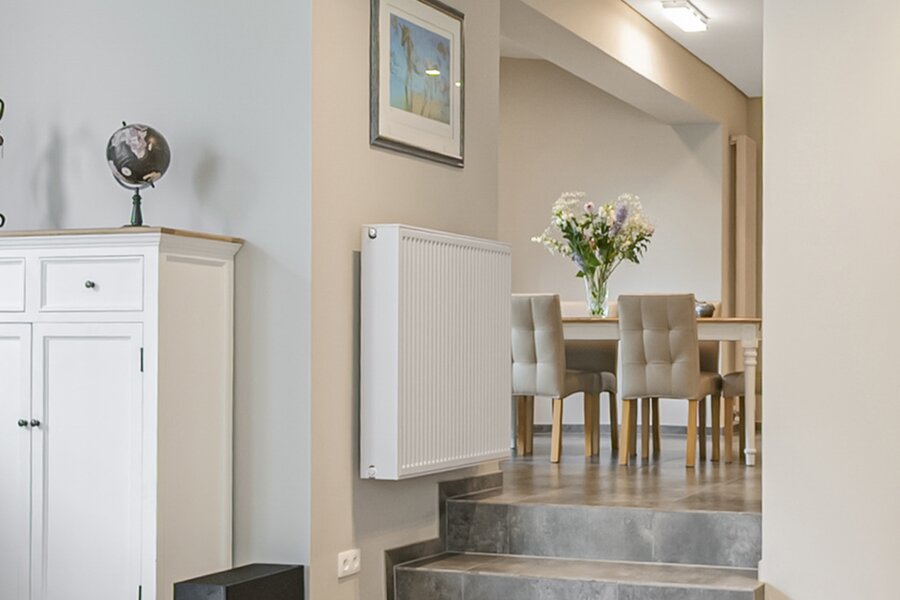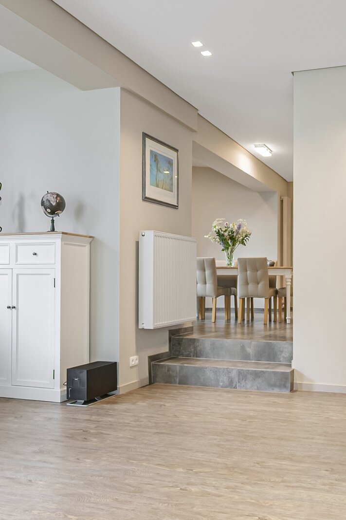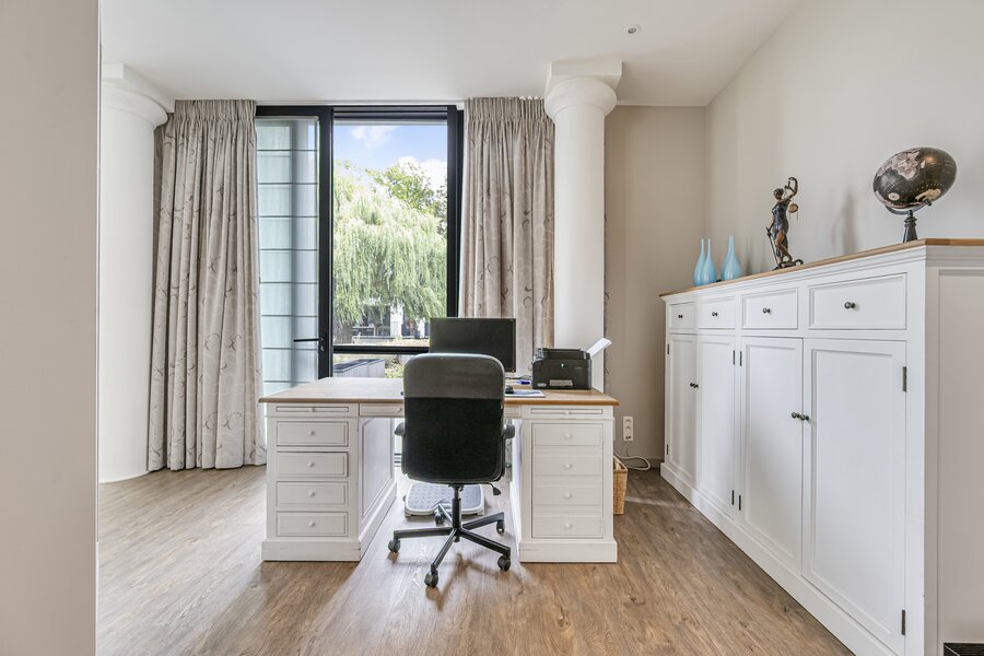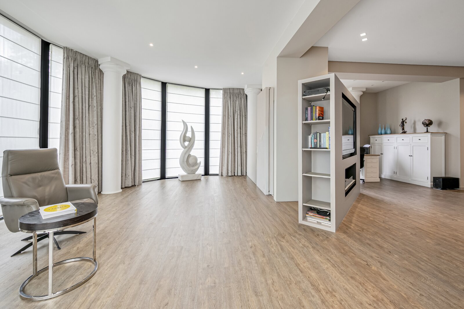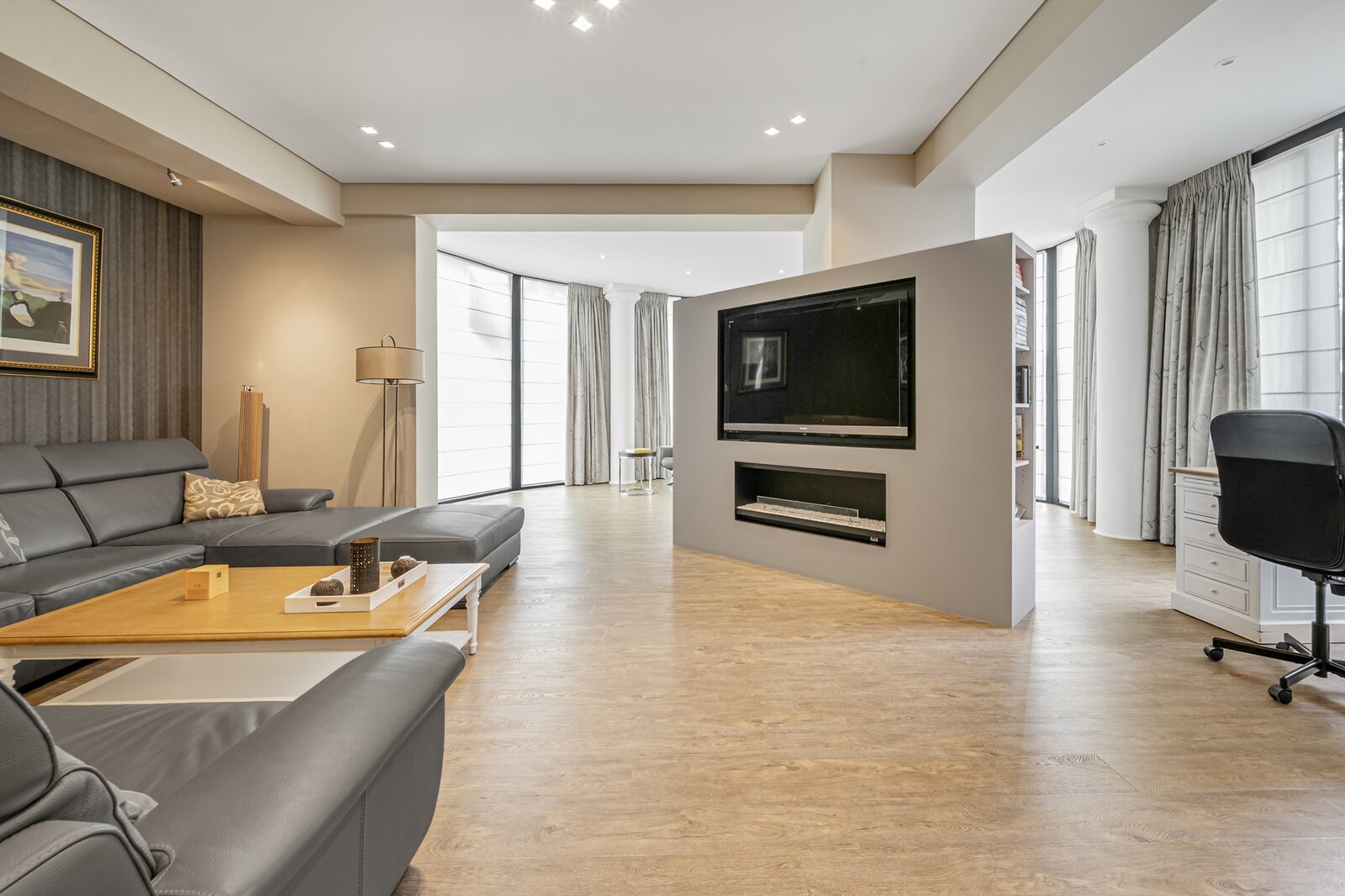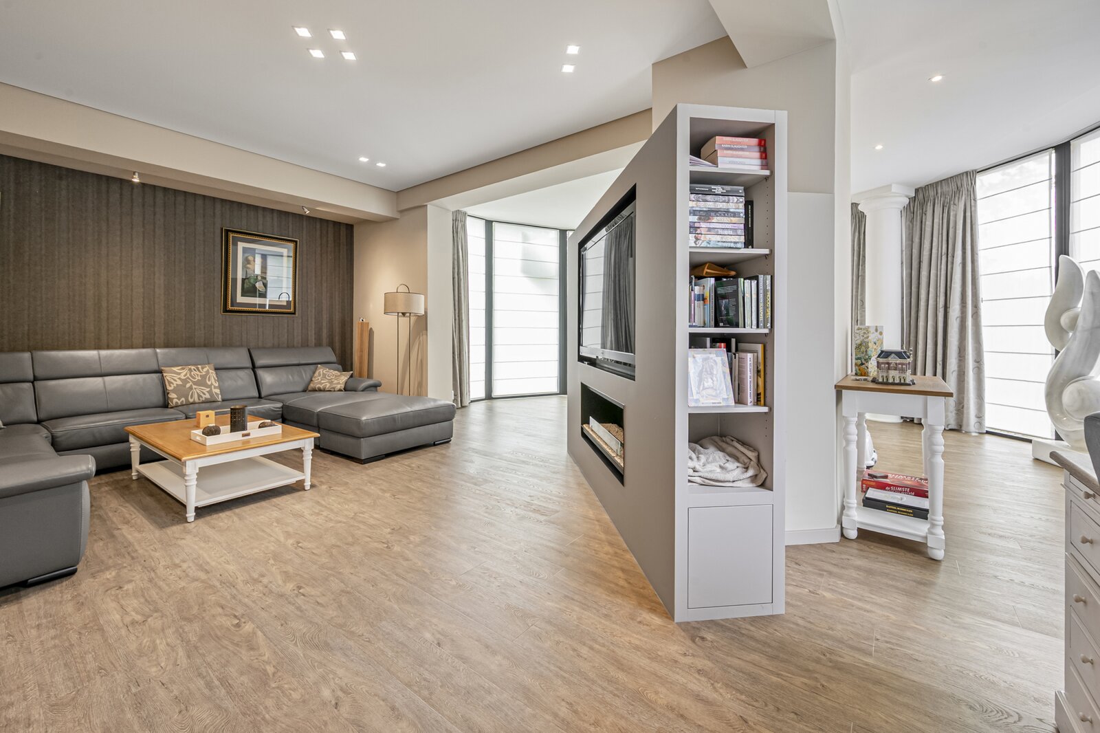 Een blikvanger is de zeer ruime woonkamer, die dankzij de grote raampartijen baadt in natuurlijk daglicht en uitkijkt op de prachtige parktuin. De oorspronkelijke zuilen werden behouden en geven het geheel extra cachet, terwijl een stijlvolle bio-ethanol haard zorgt voor warmte en gezelligheid. Deze ruimte leent zich bovendien perfect om een leeshoek, bureau of ontspanningsplek te creëren. Vanuit de woonkamer heeft u rechtstreeks toegang tot het ruime, deels overdekte terras en de prachtige parktuin. Een heerlijke plek om tot rust te komen en te genieten van de groene omgeving.