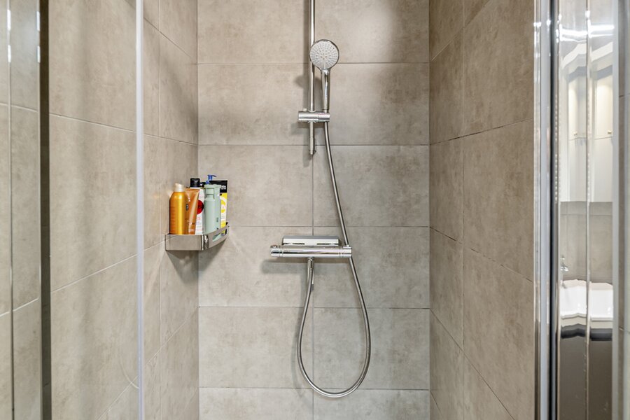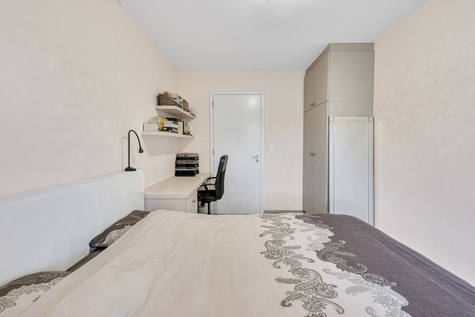 Het slaapgedeelte is volledig afgewerkt met maatwerk, inclusief ingemaakte kasten en schappen, en biedt drie comfortabele slaapkamers. Twee van de kamers zijn voorzien van een bureau, ideaal voor studie of werk. De master bedroom beschikt over een ensuite badkamer, terwijl de tweede badkamer praktisch is ingericht met een dubbel lavabomeubel en inloopdouche.