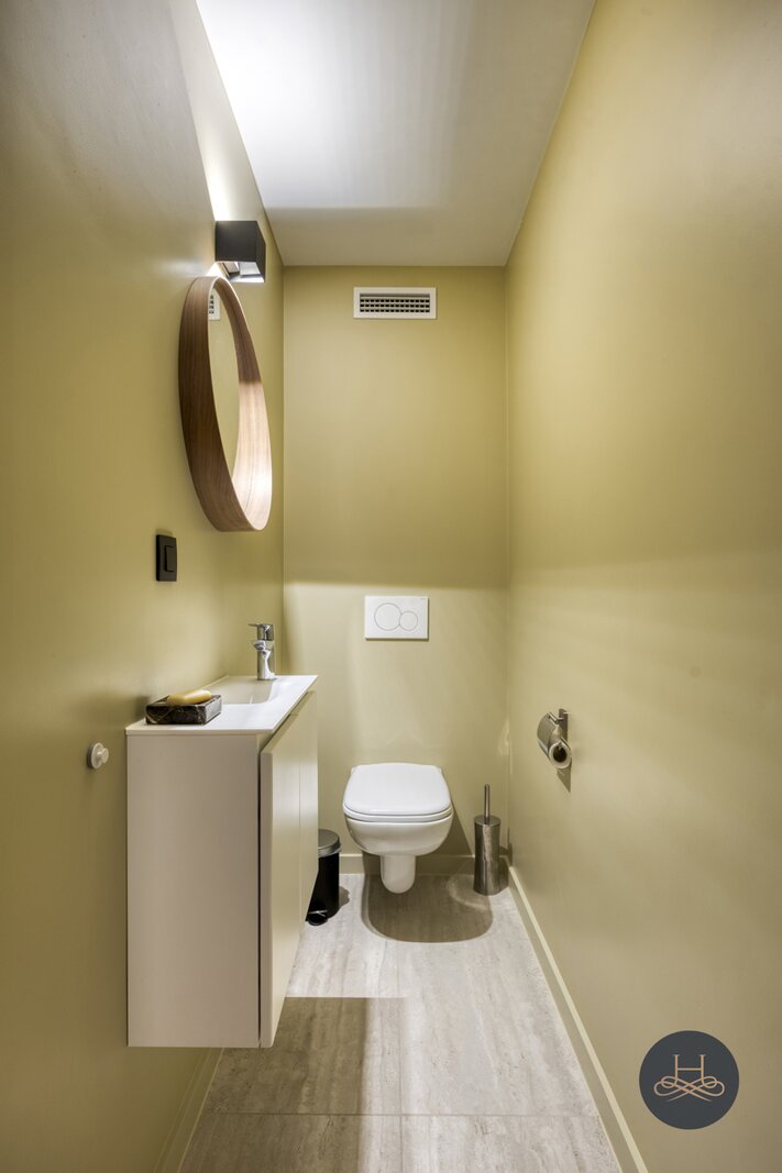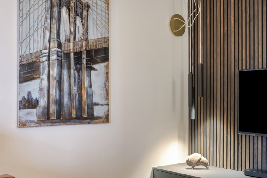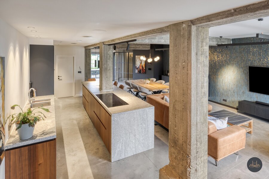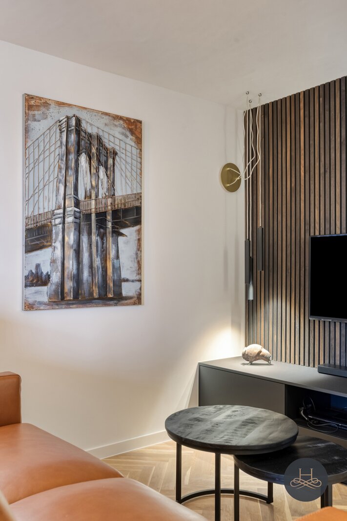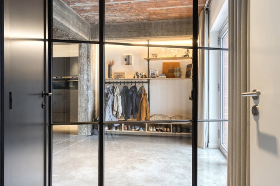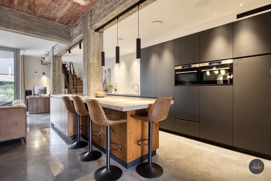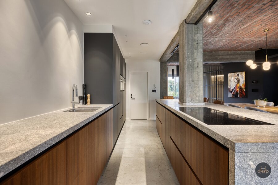 Het appartement werd in 2023 volledig gerenoveerd en afgewerkt met hoogwaardige materialen en oog voor detail. De open benedenverdieping ademt een loftgevoel en verbindt wonen en koken één mooi geheel. De ruime in notelarenhout uitgevoerde designkeuken van Dovy met granieten blad en hoogwaardige toestellen is een echte blikvanger.