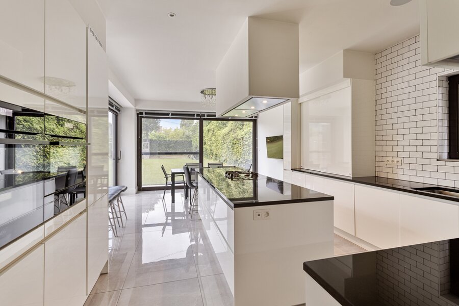 Zowel de keuken als de woonkamer genieten van veel raampartijen en bieden toegang tot het terras en de aangename open tuin.