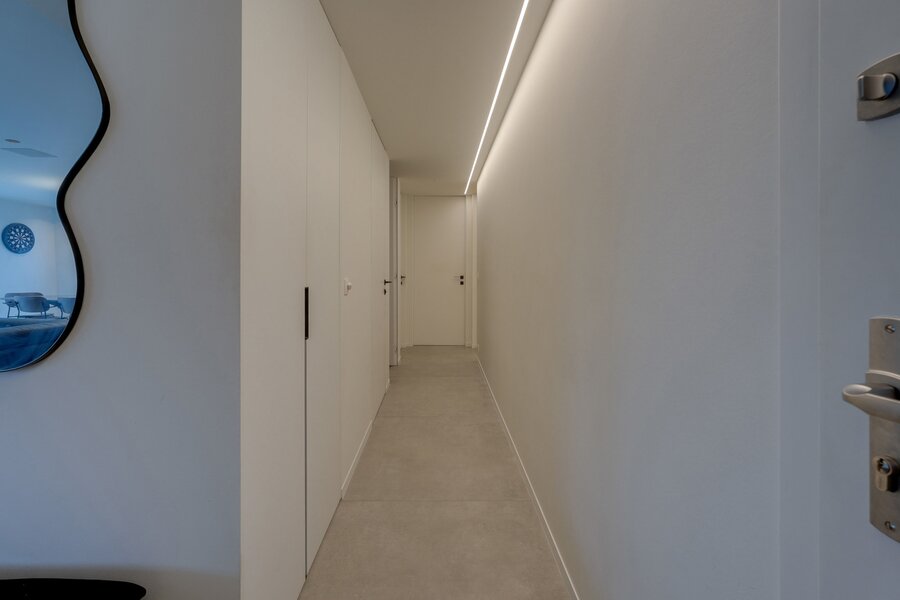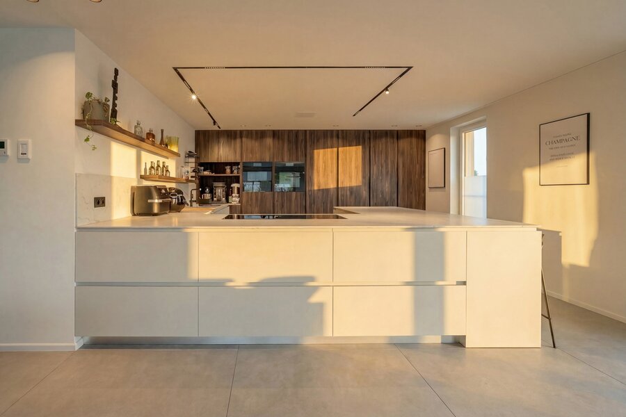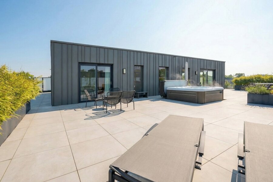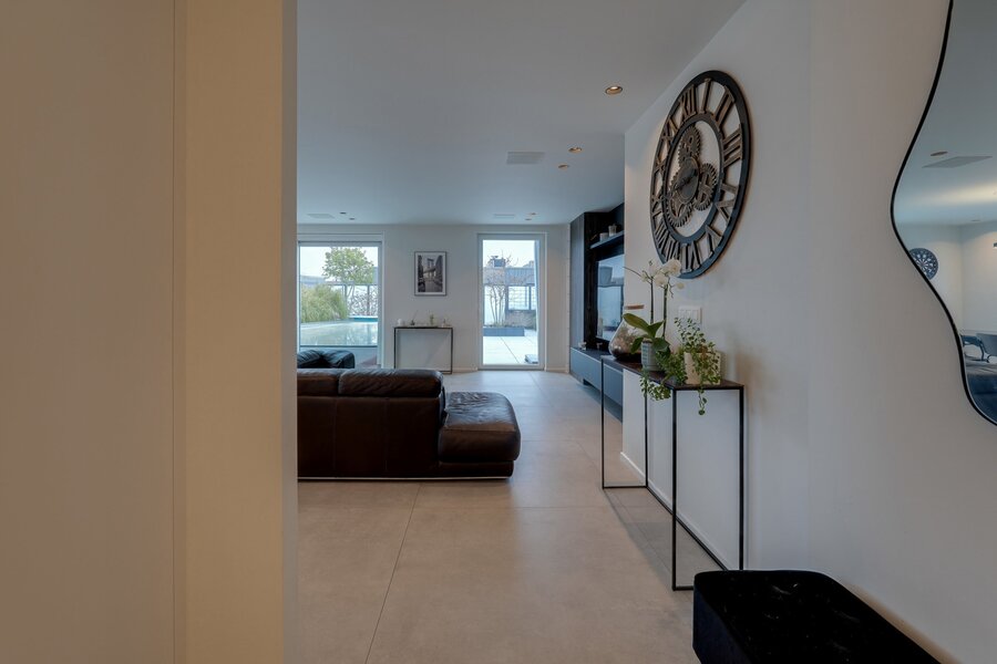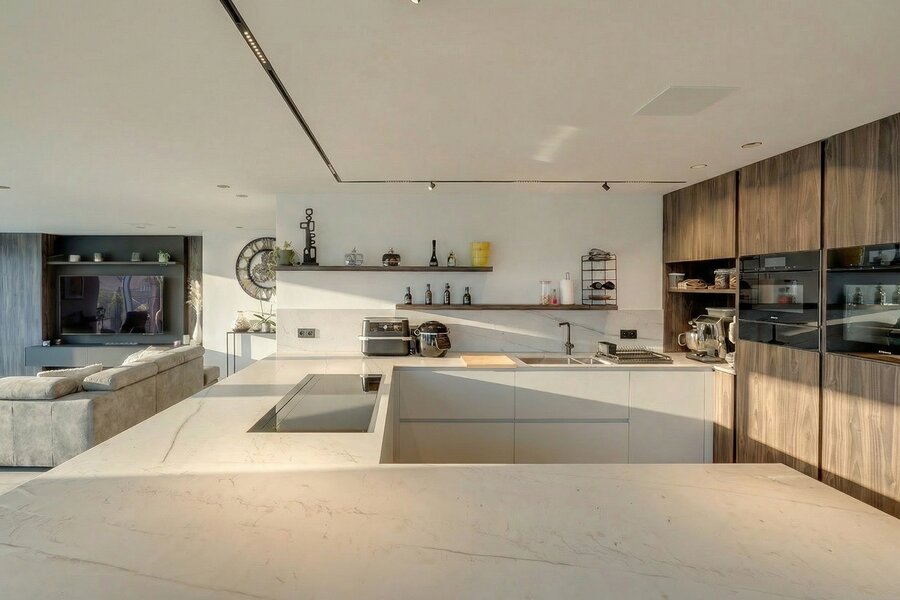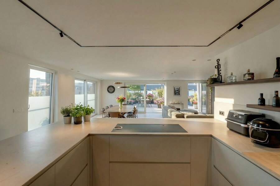 Situated on the top floor of a contemporary high-end residence, this penthouse offers a rare living environment combining generous volumes, abundant natural light and premium features. From the moment you enter, an elegant entrance hall with multiple cloakrooms leads to a spacious and light-filled living area, fully open-plan and designed for comfort and conviviality. It comprises a large living room and a fully equipped high-end kitchen with refined finishes, featuring an induction hob with integrated extractor, two refrigerators, a freezer, a dishwasher, a conventional and steam oven, a microwave, a warming drawer, a double sink, as well as a central island with dining area and ample storage space.