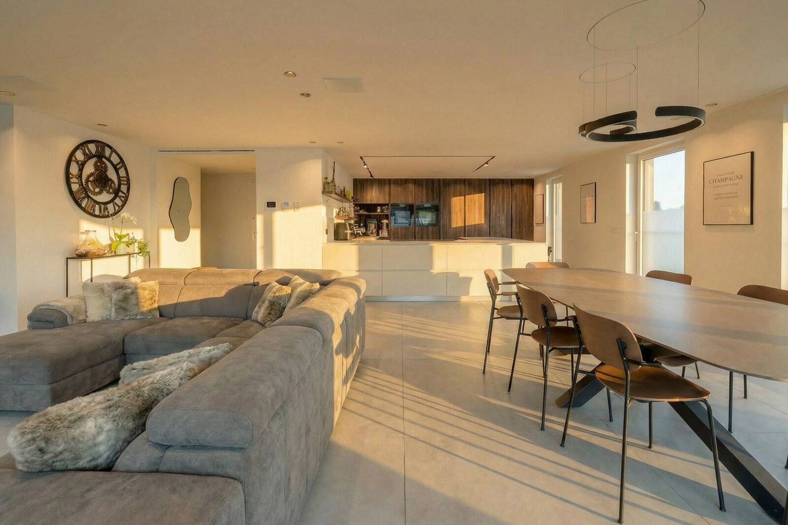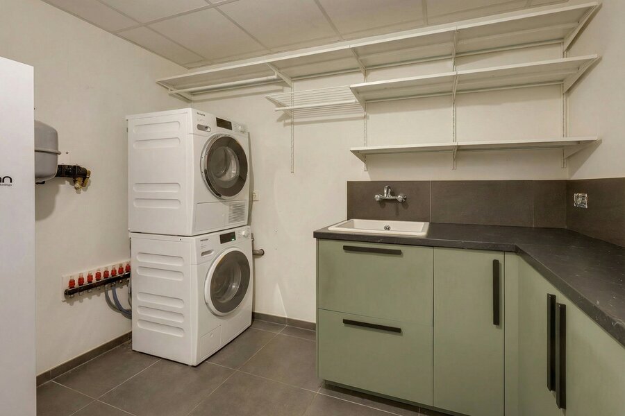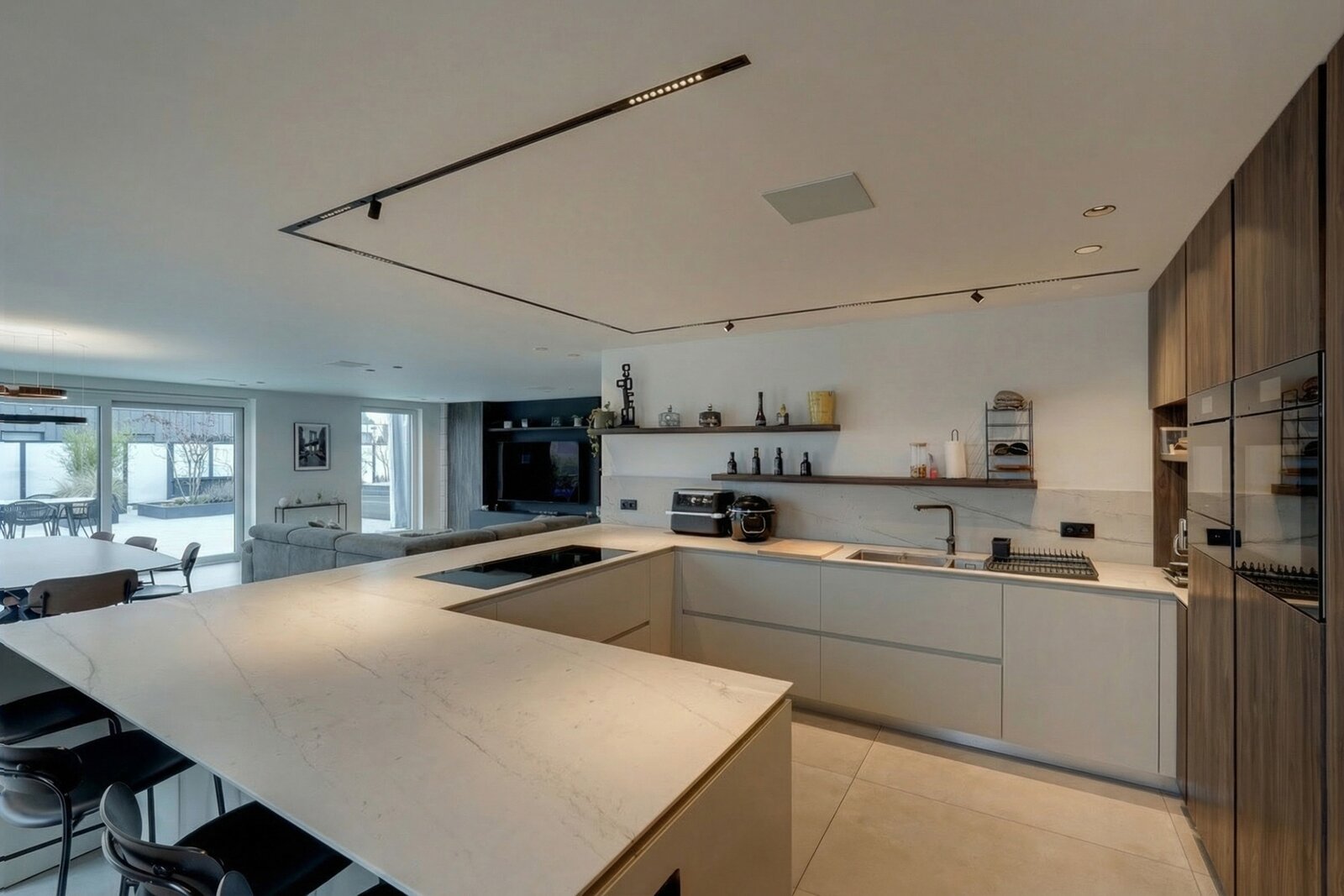Situated on the top floor of a contemporary high-end residence, this penthouse offers a rare living environment combining generous volumes, abundant natural light and premium features. From the moment you enter, an elegant entrance hall with multiple cloakrooms leads to a spacious and light-filled living area, fully open-plan and designed for comfort and conviviality. It comprises a large living room and a fully equipped high-end kitchen with refined finishes, featuring an induction hob with integrated extractor, two refrigerators, a freezer, a dishwasher, a conventional and steam oven, a microwave, a warming drawer, a double sink, as well as a central island with dining area and ample storage space.