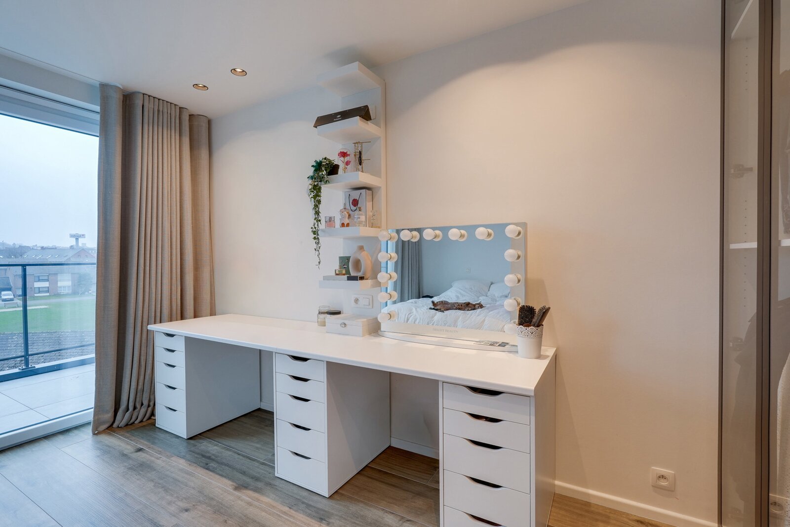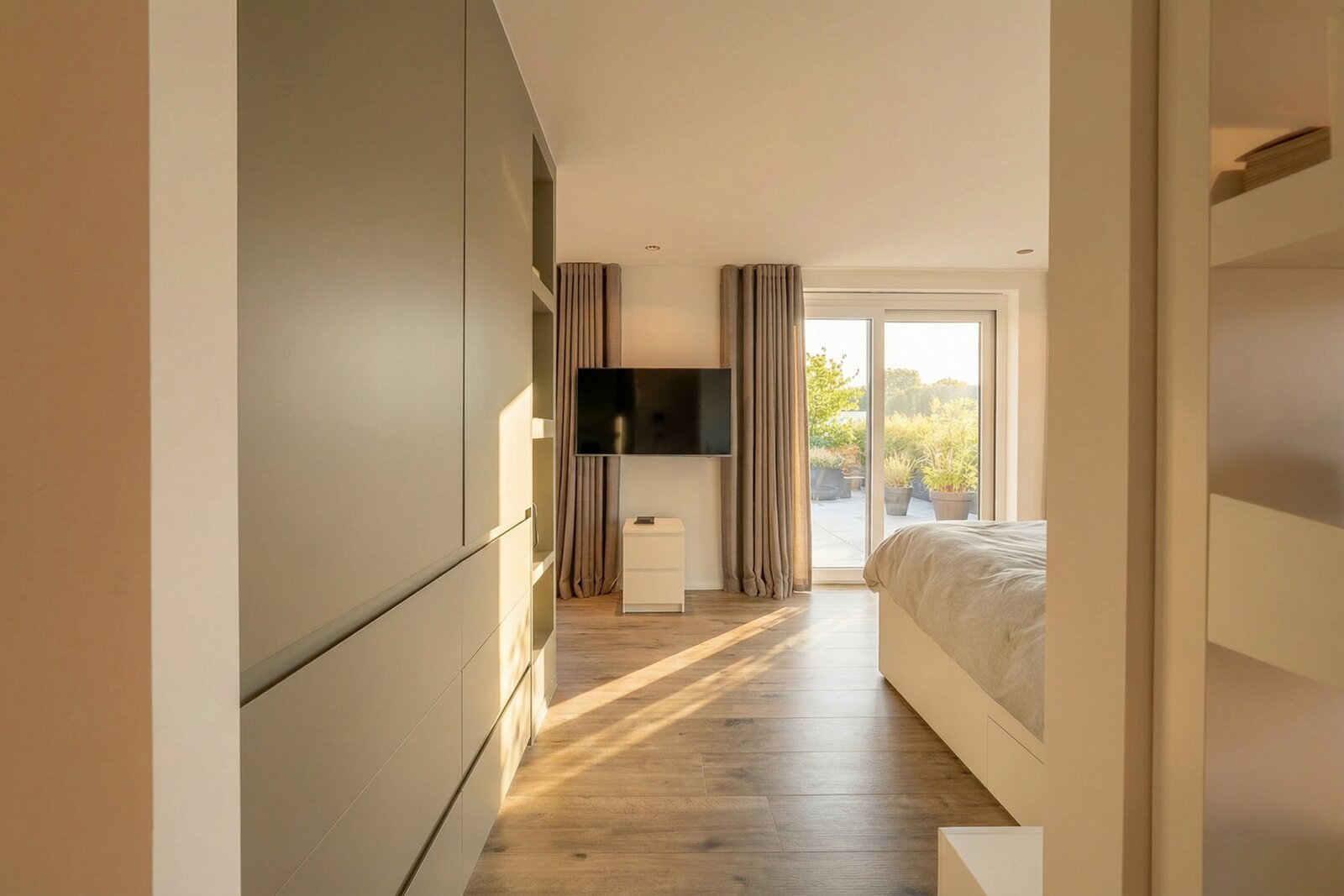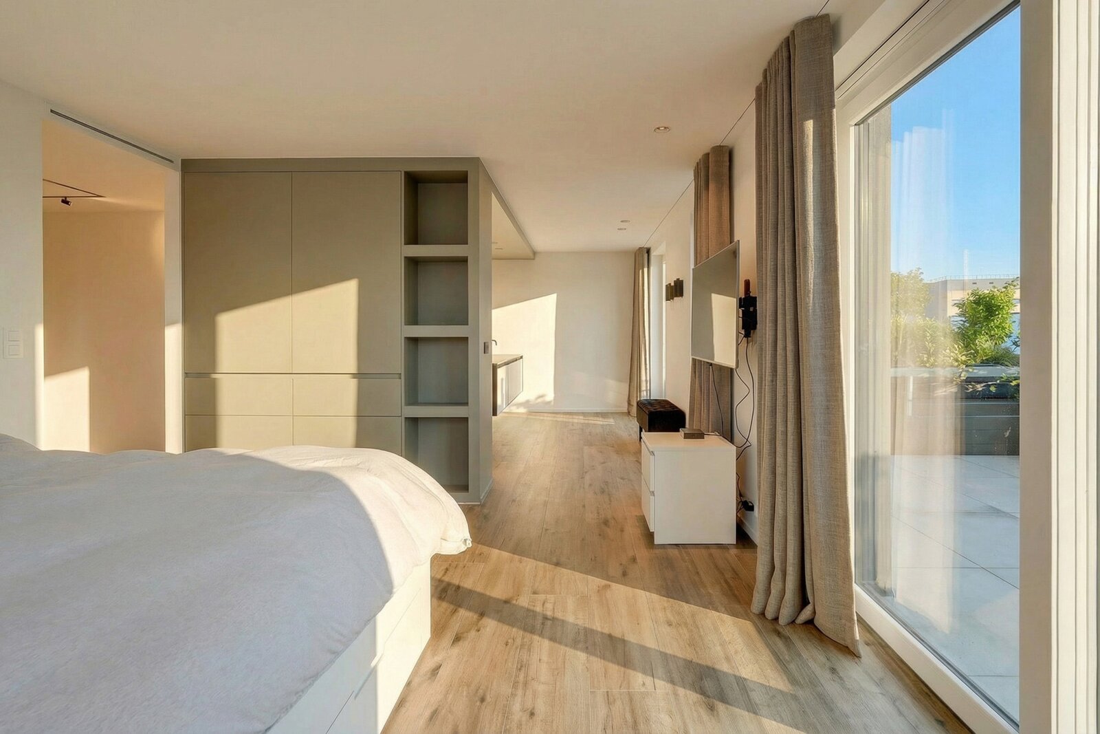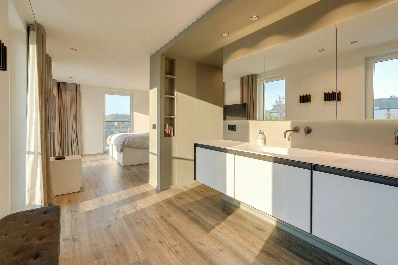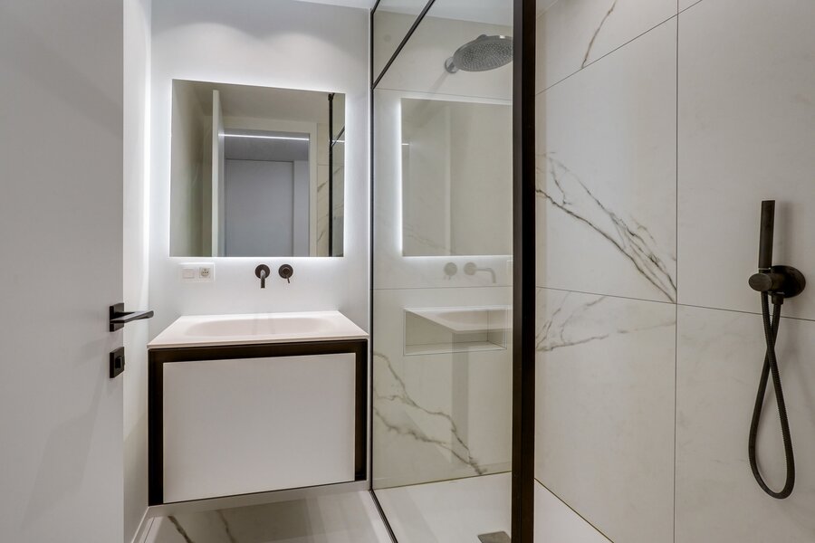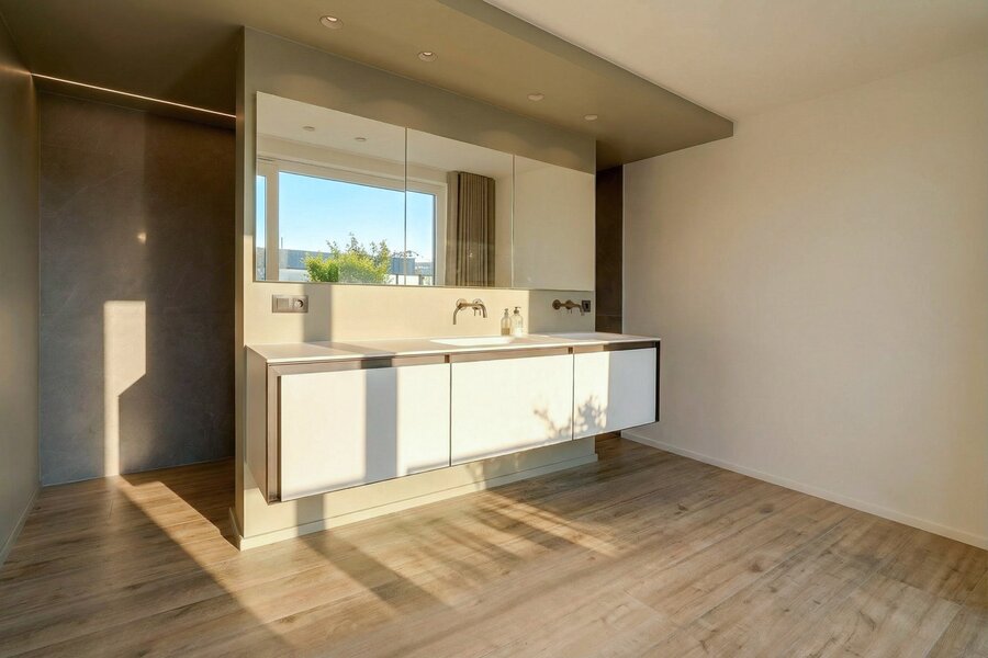 The night area offers a superb master suite consisting of a comfortable bedroom, an elegant bathroom with a large walk-in shower, double vanity unit and a separate wall-hung toilet, as well as a home office and a perfectly fitted dressing area. A second bedroom of 16 m² also benefits from its own bathroom with walk-in shower, washbasin unit and a separate wall-hung toilet with hand basin.
