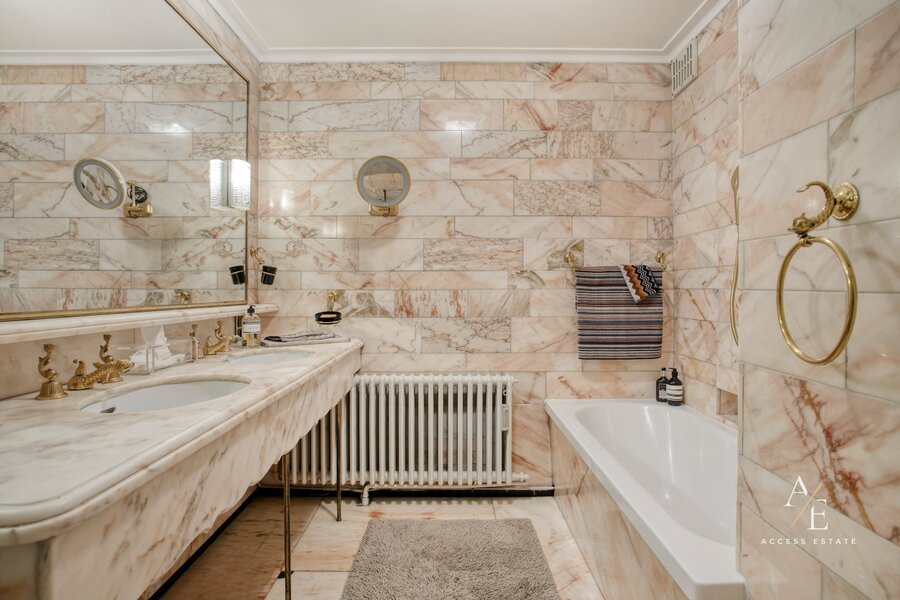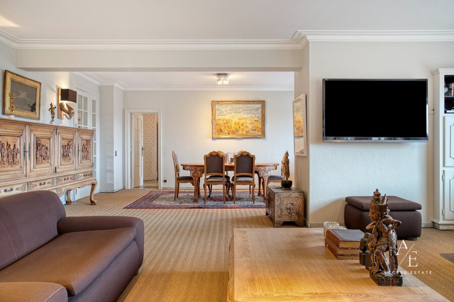 Bij het binnenkomen wordt u verwelkomd in de statige inkomhal met gastentoilet, ingemaakte kasten en vestiaire. De royale, lichtrijke leefruimte met open haard biedt een prachtig uitzicht op het achterliggende groen en sluit aan op de te vernieuwen keuken. Vanuit de eetplaats en keuken heeft u toegang tot het ruime zuidoostgerichte terras van ca. 27 m², waar u in alle rust van de zon en het uitzicht kunt genieten. De nachthal leidt naar drie slaapkamers, waarvan twee met toegang tot een balkon met zicht op de stad. De volledig in natuursteen afgewerkte badkamer is voorzien van een dubbele lavabo, ligbad en toilet, met de mogelijkheid om een douche te plaatsen.