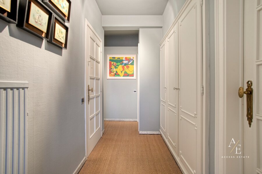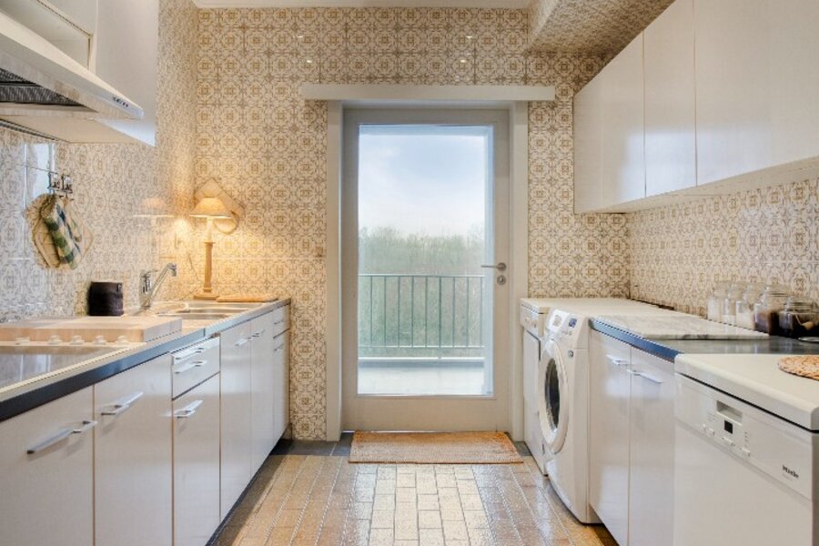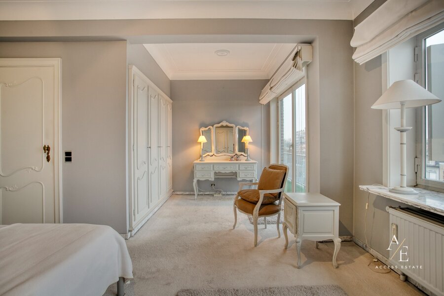 De hoge afwerkingsgraad springt meteen in het oog. Degelijke en duurzame materialen zoals massieve houten deuren, inbraakveilige inkomdeuren, tal van ingemaakte kasten en diverse natuursteen accenten benadrukken het kwaliteitsvolle karakter van dit appartement.