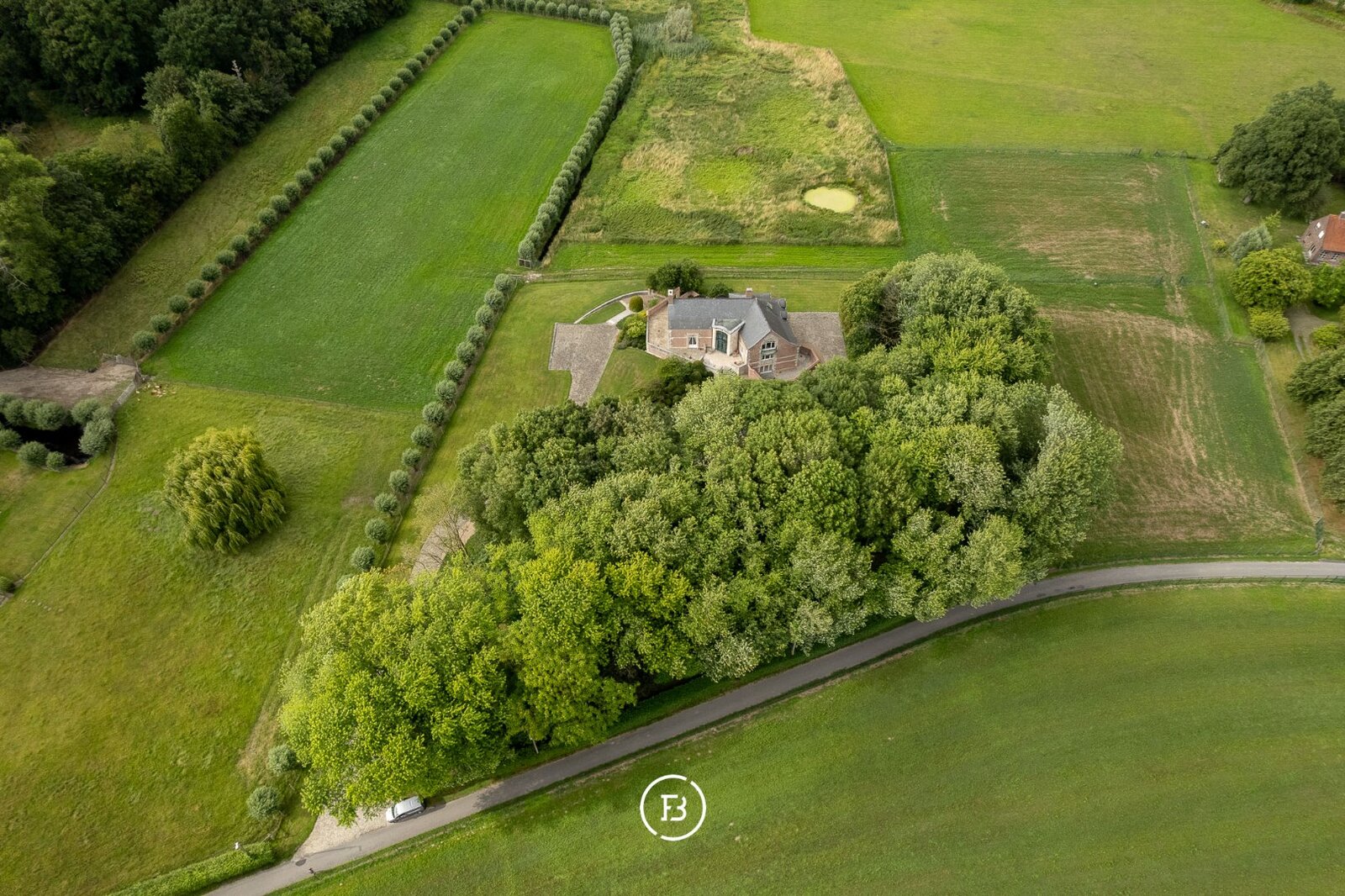 Op een rustige, groene locatie vlak bij het centrum van Izegem vinden we deze karaktervolle villa, ontworpen door Marcel Raymakers van Queen of the South. De woning ligt discreet verscholen, bereikbaar via een charmante kasseien oprit, en biedt een prachtig uitzicht op omliggende weiden en het bos van Kasteel Blauwhuis.