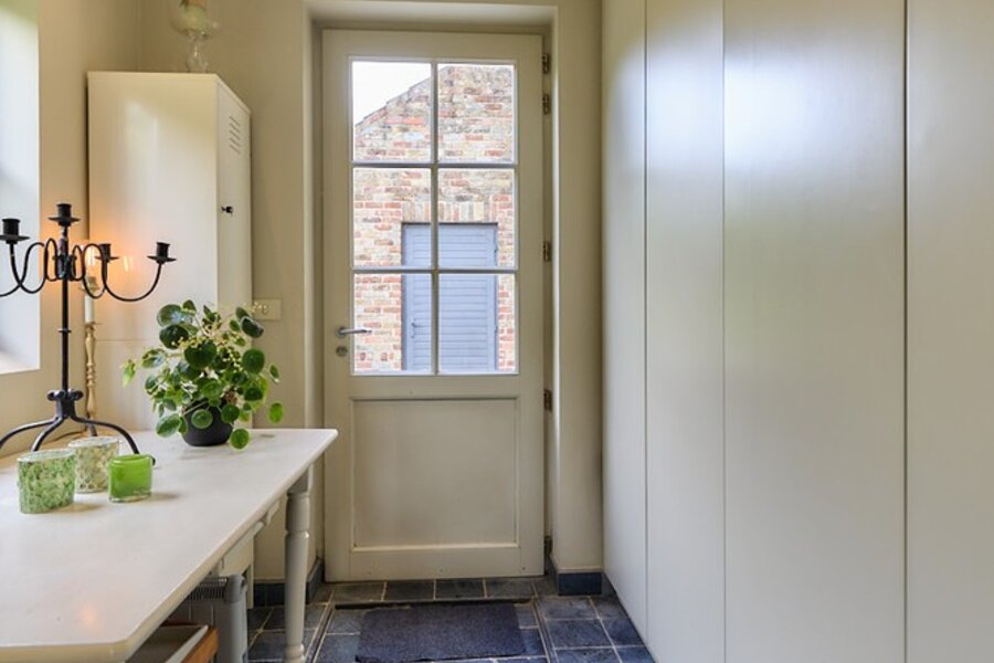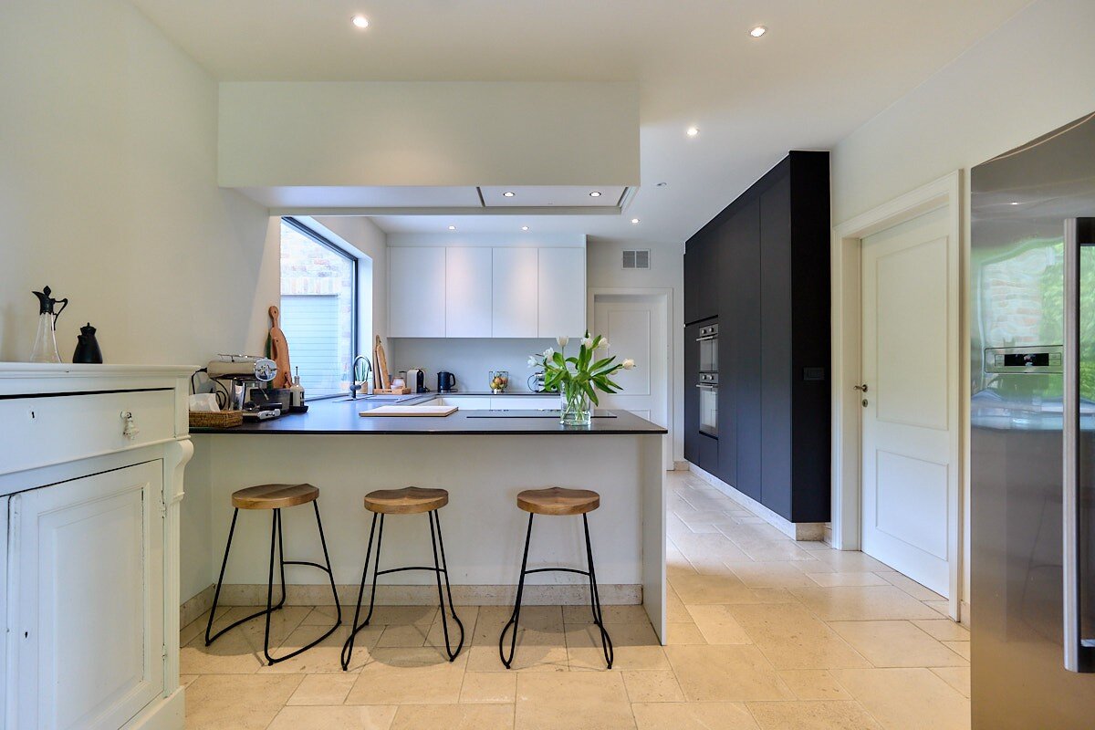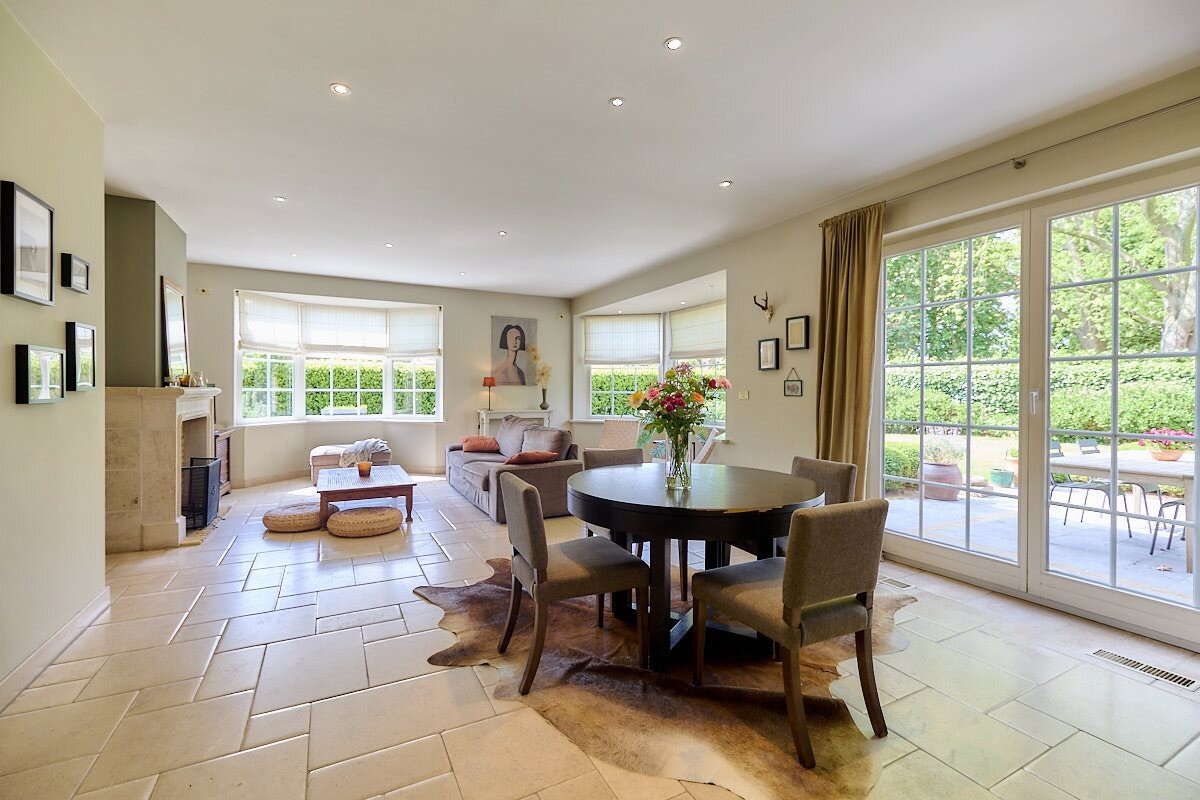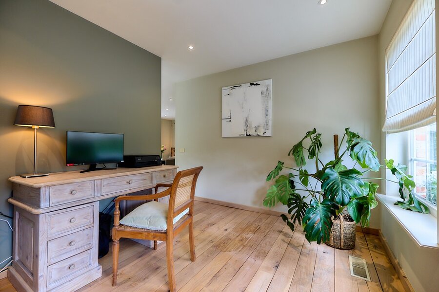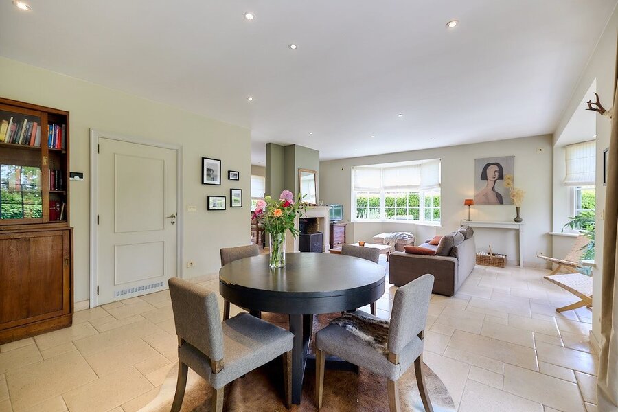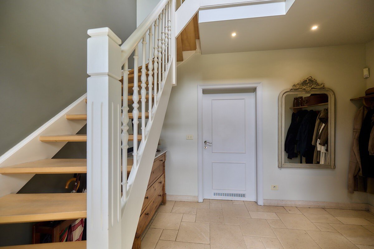 De centrale inkomhal met gastentoilet leidt naar de huiselijke woonkamer met haard en een open bureauruimte, tevens dienstig als tv-hoek, bibliotheek of extra zitruimte. Aansluitend de grote recente keuken met eetkamer die rechtstreeks in verbinding staat met de terrassen en de onderhouden en aangelegde tuin - goed voor een buitengevoel doorheen alle seizoenen. Via een handige bijkeuken met stookplaats is de dubbele garage met geautomatiseerde poorten bereikbaar.