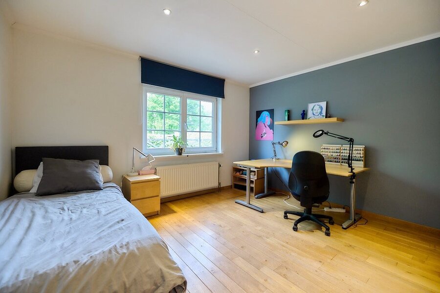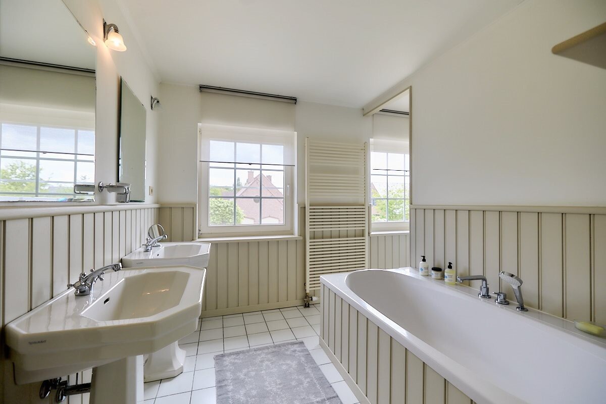 De nachthal op de verdieping geeft toegang tot vier volwaardige slaapkamers met parket, een badkamer met ligbad en aansluitend een dressing, een afzonderlijk toilet én een douchekamer. Op de bovenliggende zolder is er eindeloos veel opbergruimte.