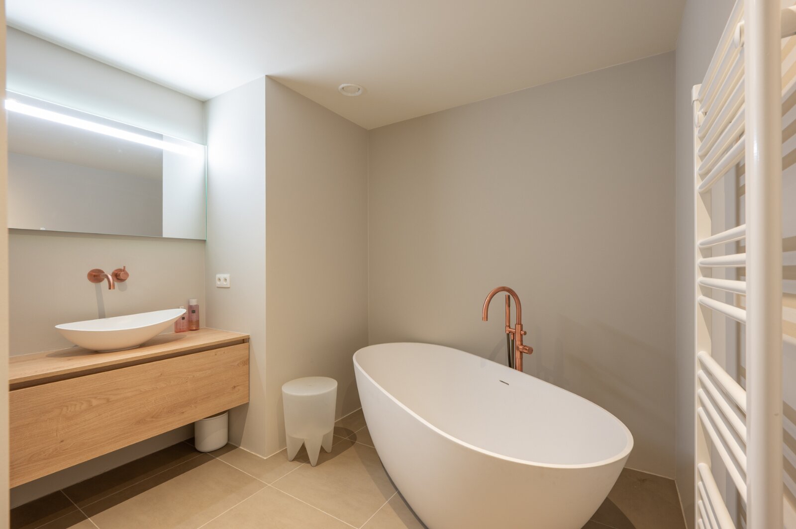 The two bedrooms each offer access to the terrace and plenty of natural light. The luxuriously finished bathroom is equipped with a bathtub, a walk-in shower, and a double sink. All this creates a place of pure relaxation.