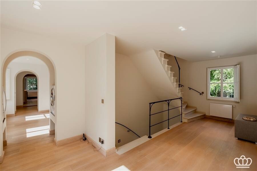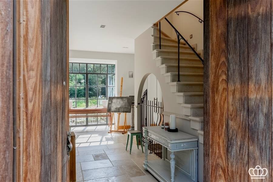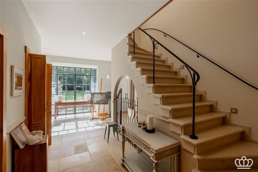 Spacious entrance hall with a view to the rear garden, guest toilet, checkroom, beautiful natural stone staircase and a passenger elevator.