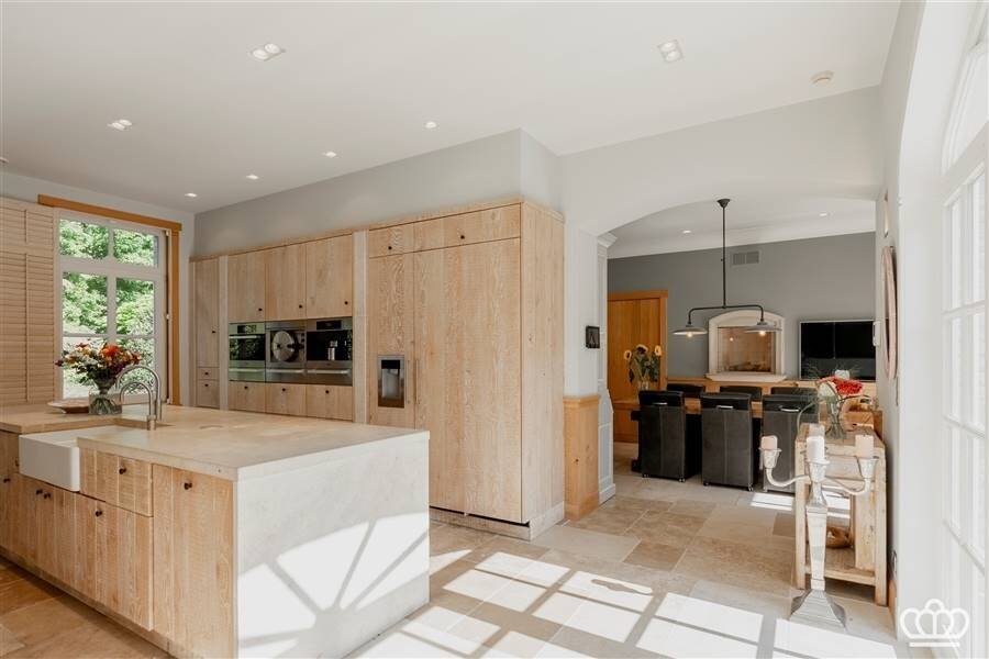 On the right side of the entrance hall are the dining room with fireplace, a sitting area with fireplace and a TV room with fireplace and overlooking the garden and pond.