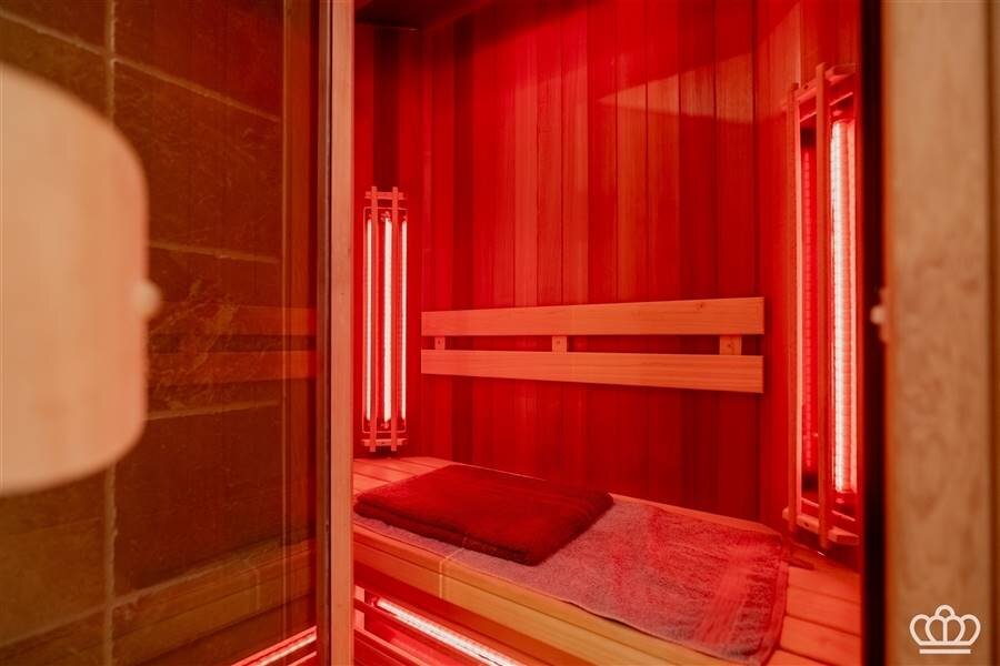 On the right side is the master bedroom consisting of a dressing room, bedroom with glass window and balcony and a large bathroom equipped with double sink, double bathtub/jacuzzi, walk-in shower, toilet and infrared sauna.