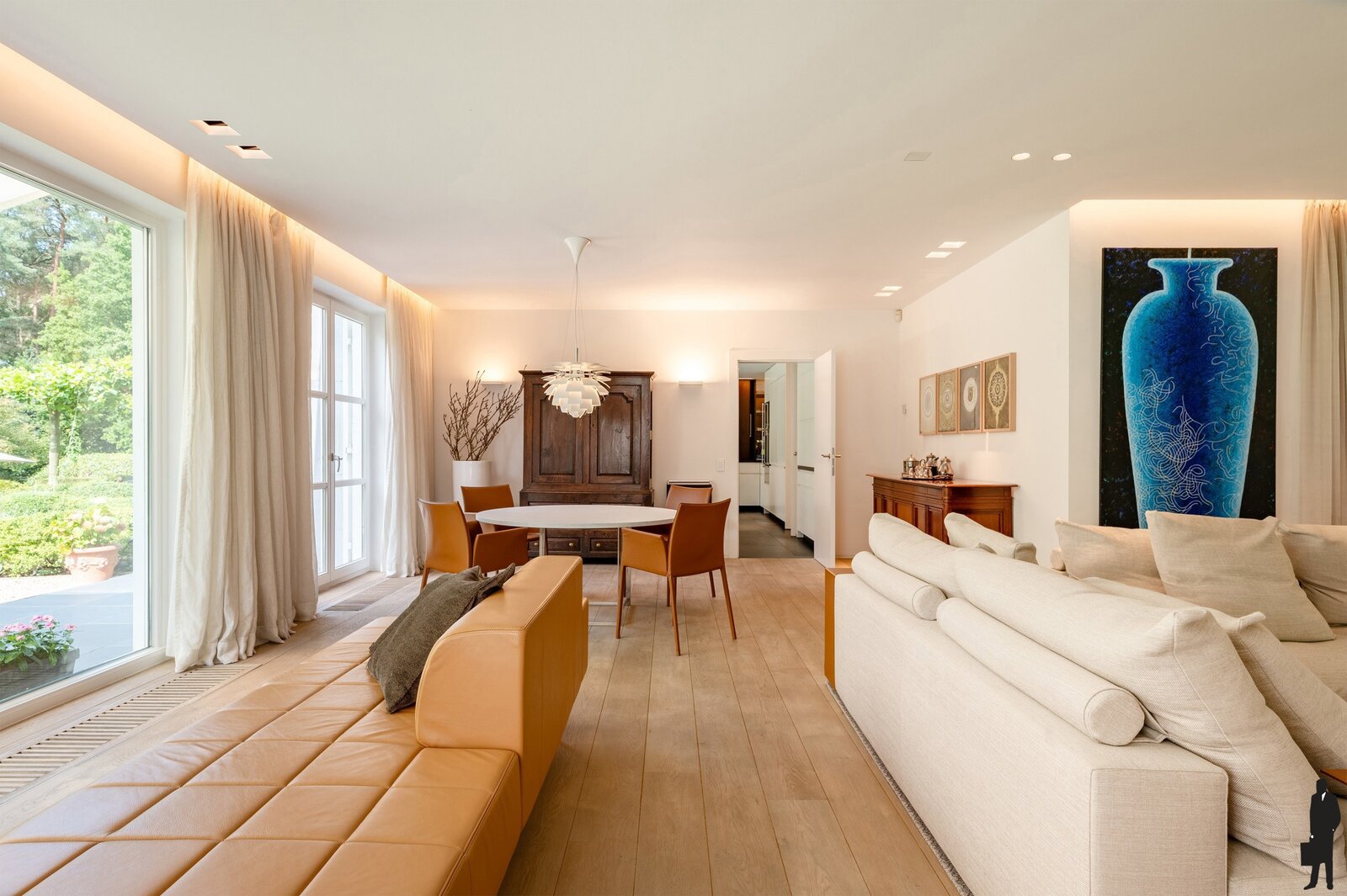 - Een TV-kamer (ca. 55 m²) met ingemaakte kasten en eveneens dubbel openslaande deuren en schuifraam naar terras
