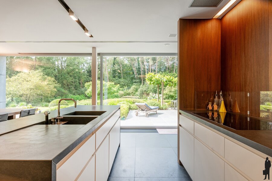 - Een royale leefkeuken (ca. 38 m²) met inbouwtoestellen waaronder o.a. Gaggenau oven, warmhoudlade, inductie, koelkast en vrieslade, alsook een eiland voorzien van dubbele gootsteen, Miele vaatwasser en ingemaakte kasten. Groot schuifraam naar de tuin