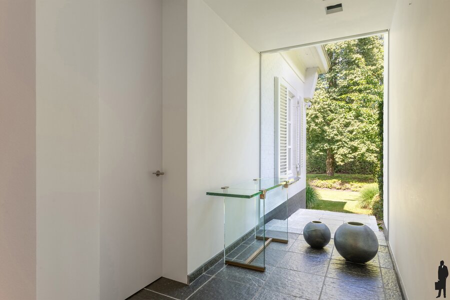 - Een inkomhal (ca. 19 m²) met ingemaakte vestiaire en gastentoilet met separate handenwasser