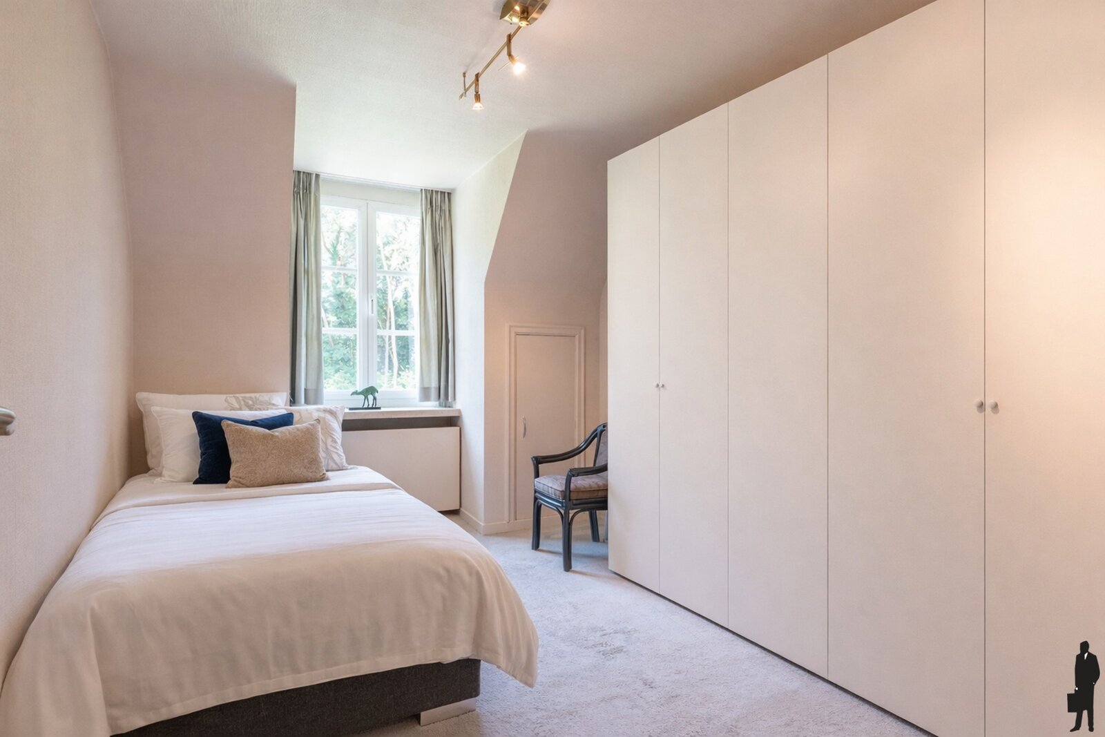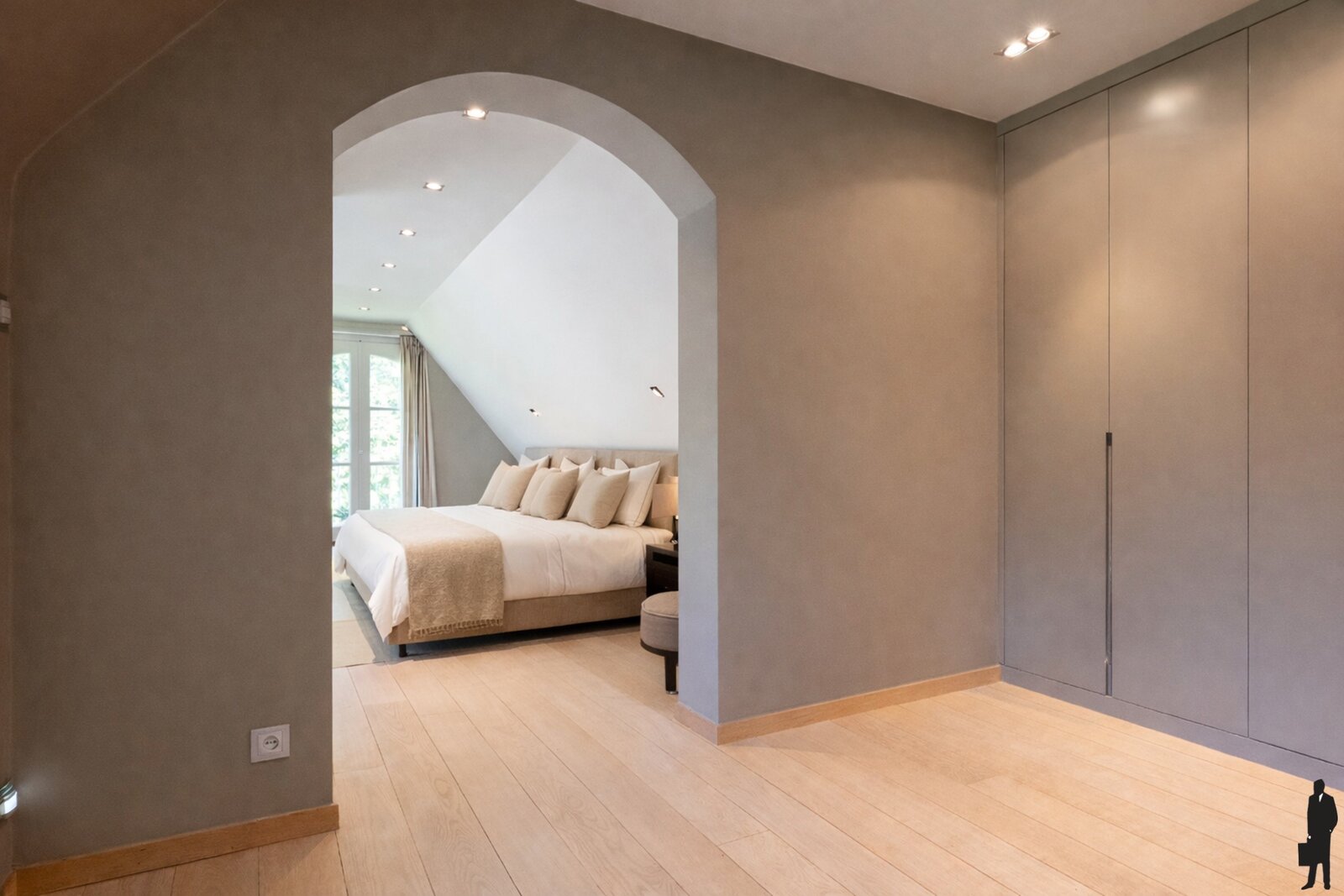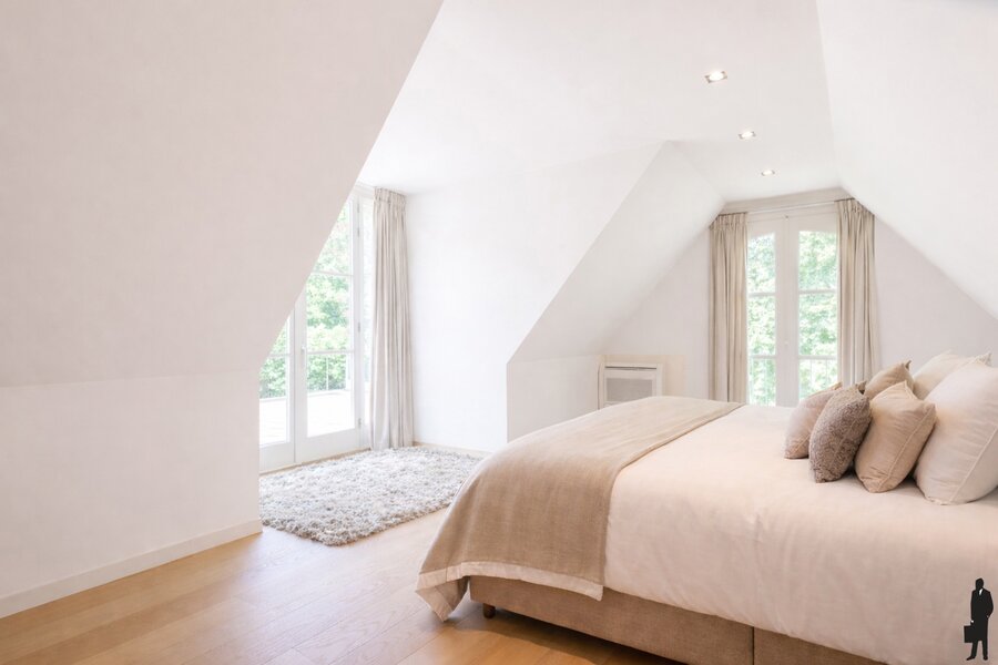 - Een hoofdslaapkamer (ca. 45 m²) met ingemaakte dressing en ruim terras (ca. 19 m²) op bancarai en zicht op de tuin