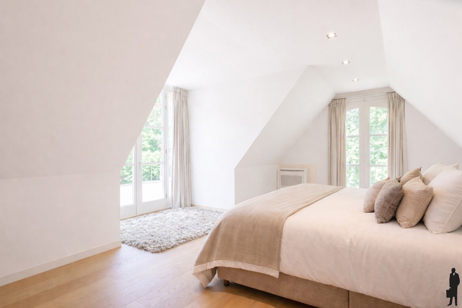 - Keuken, bibliotheek, TV-kamer en twee slaapkamers: airco en verwarming met warmtepomp