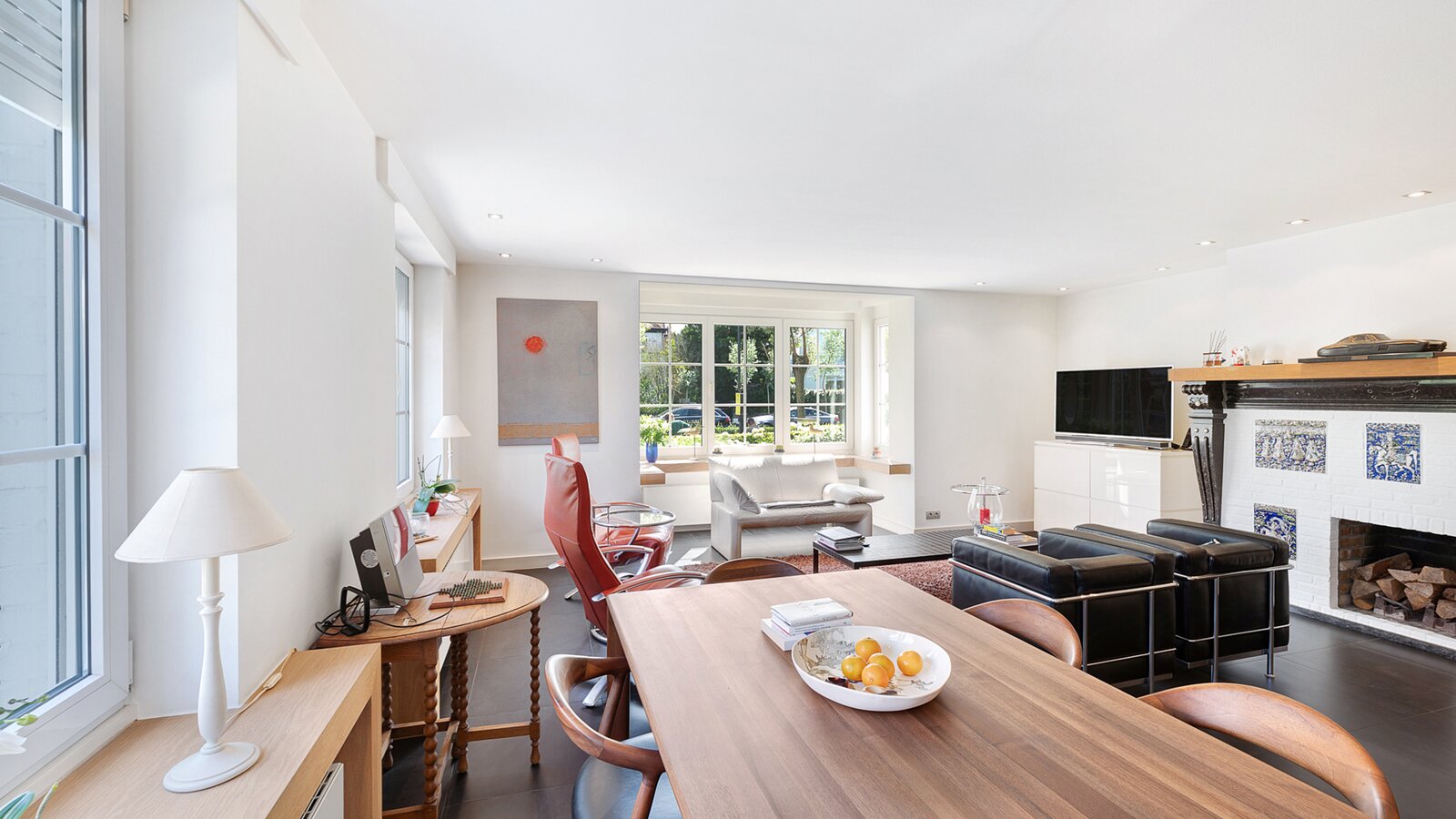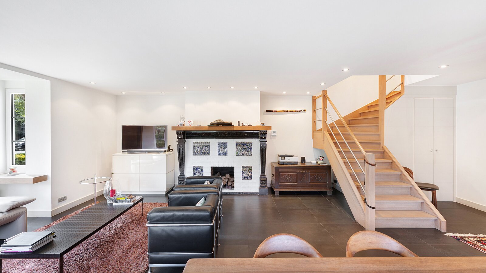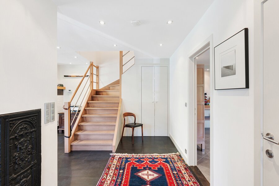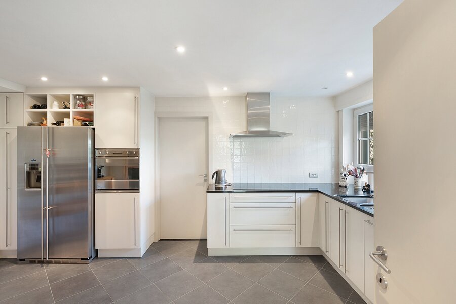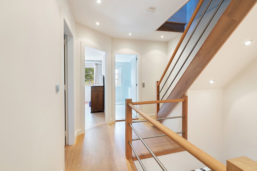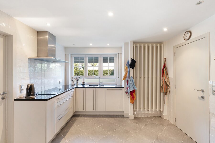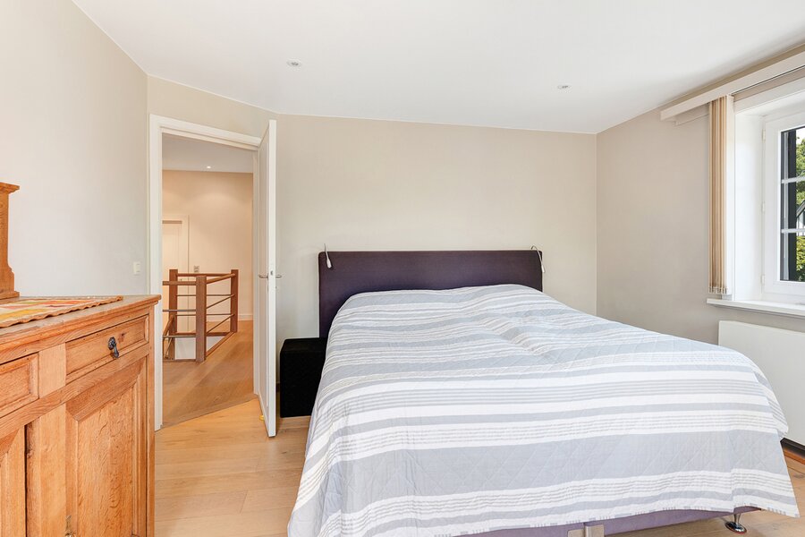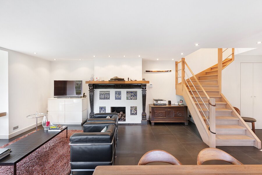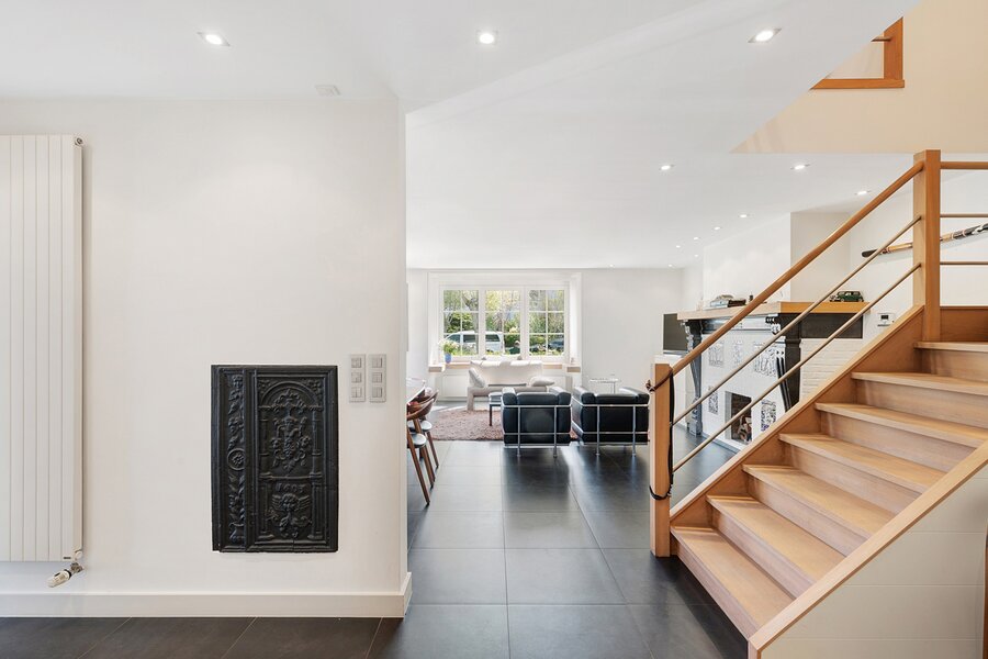 Upon entering, you are welcomed by a spacious entrance hall with cloakroom and separate guest toilet. The bright living room with open fireplace creates a warm and inviting atmosphere and forms the heart of the home. Adjacent is a generous separate kitchen, providing access to the first integrated garage.