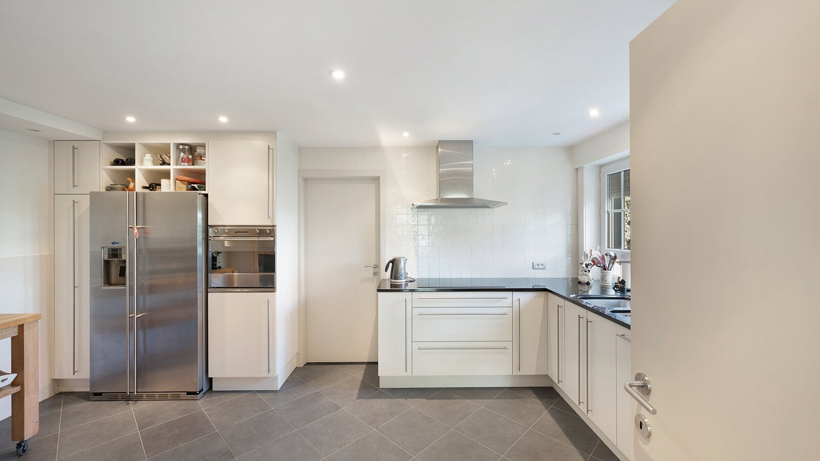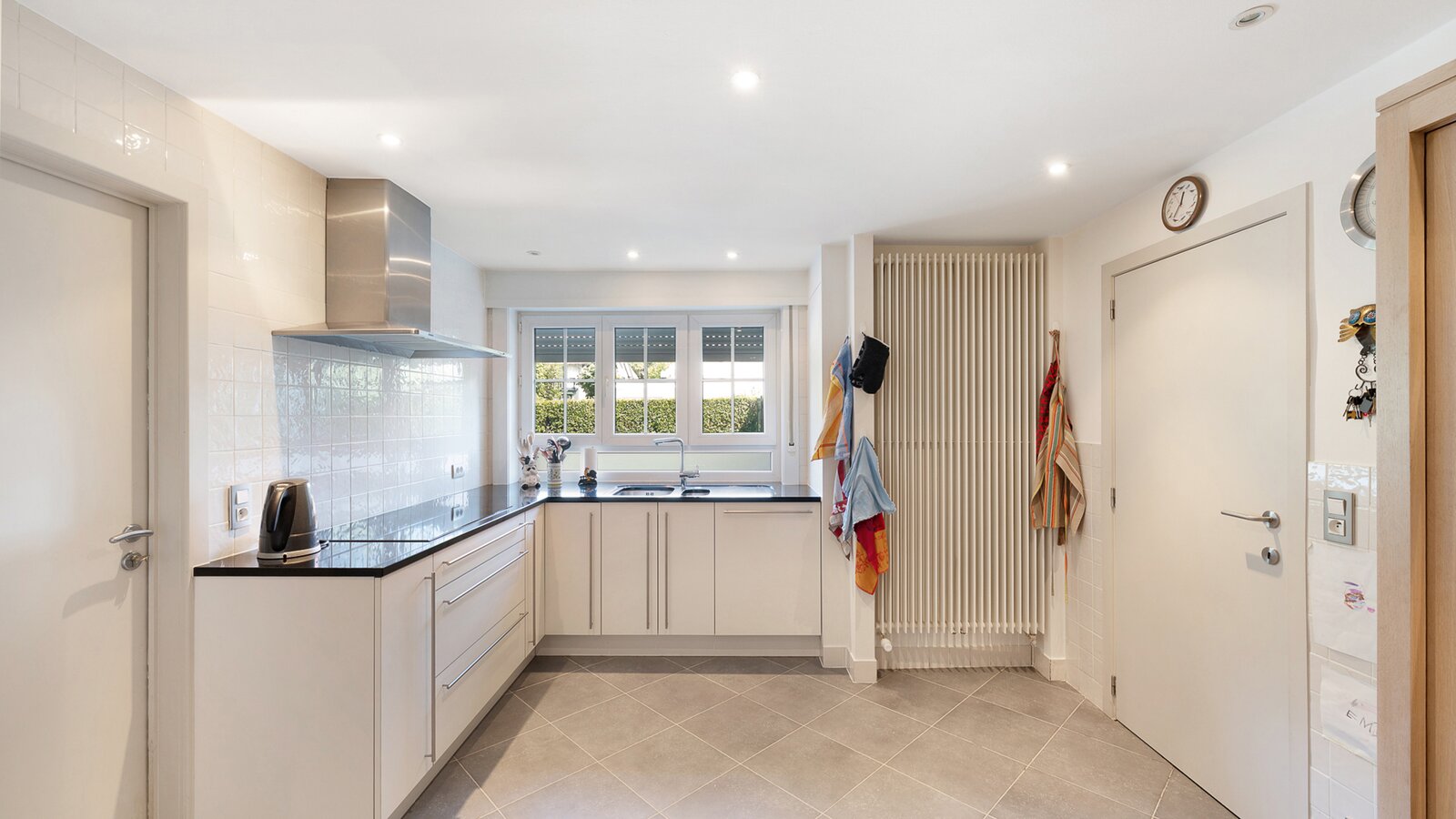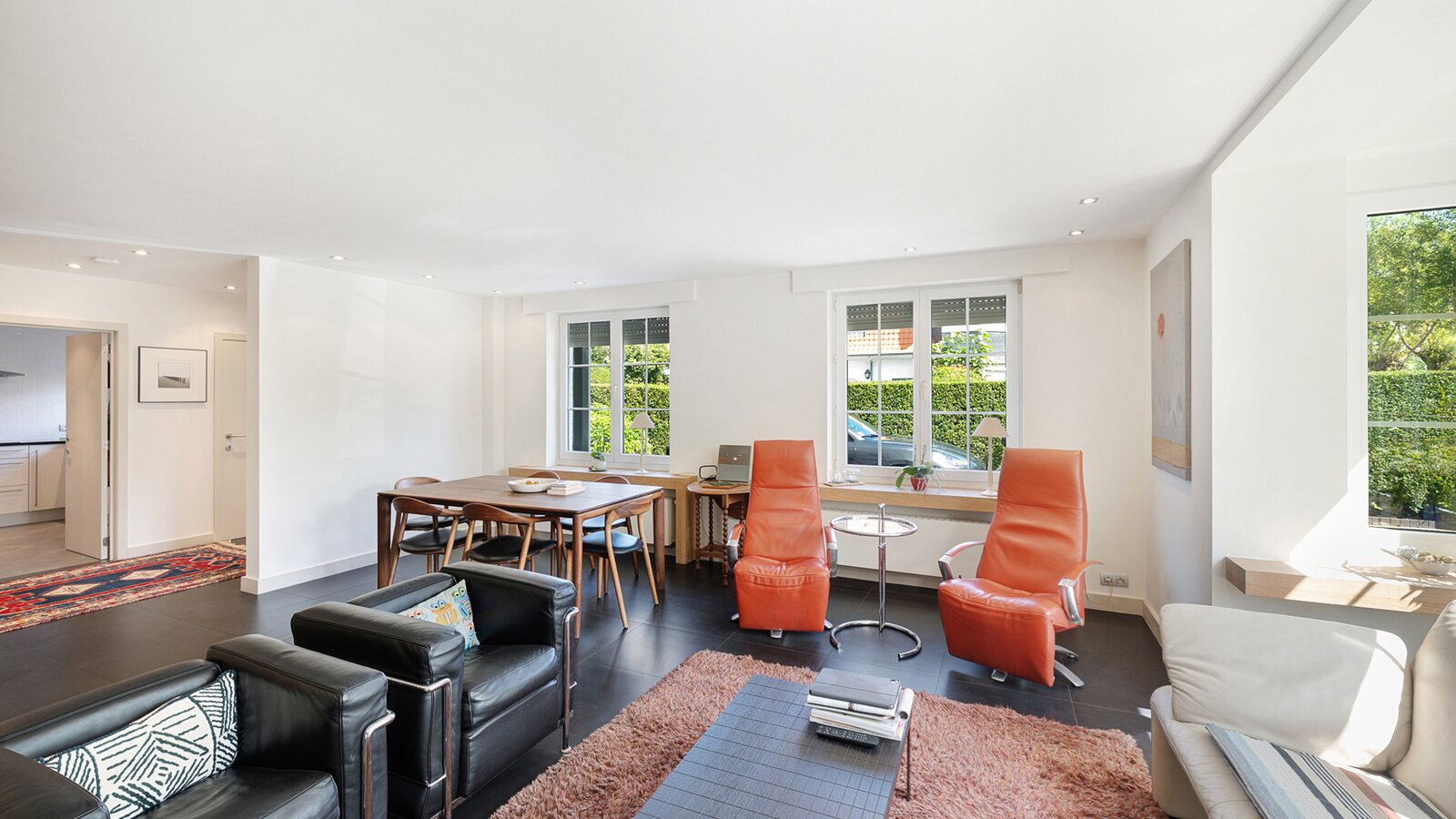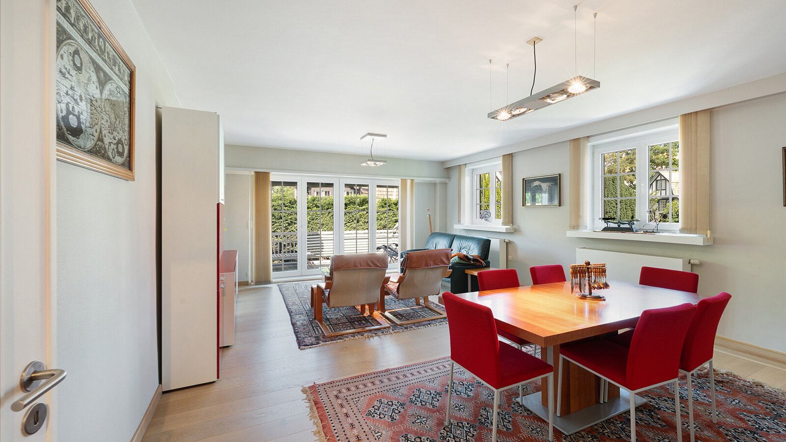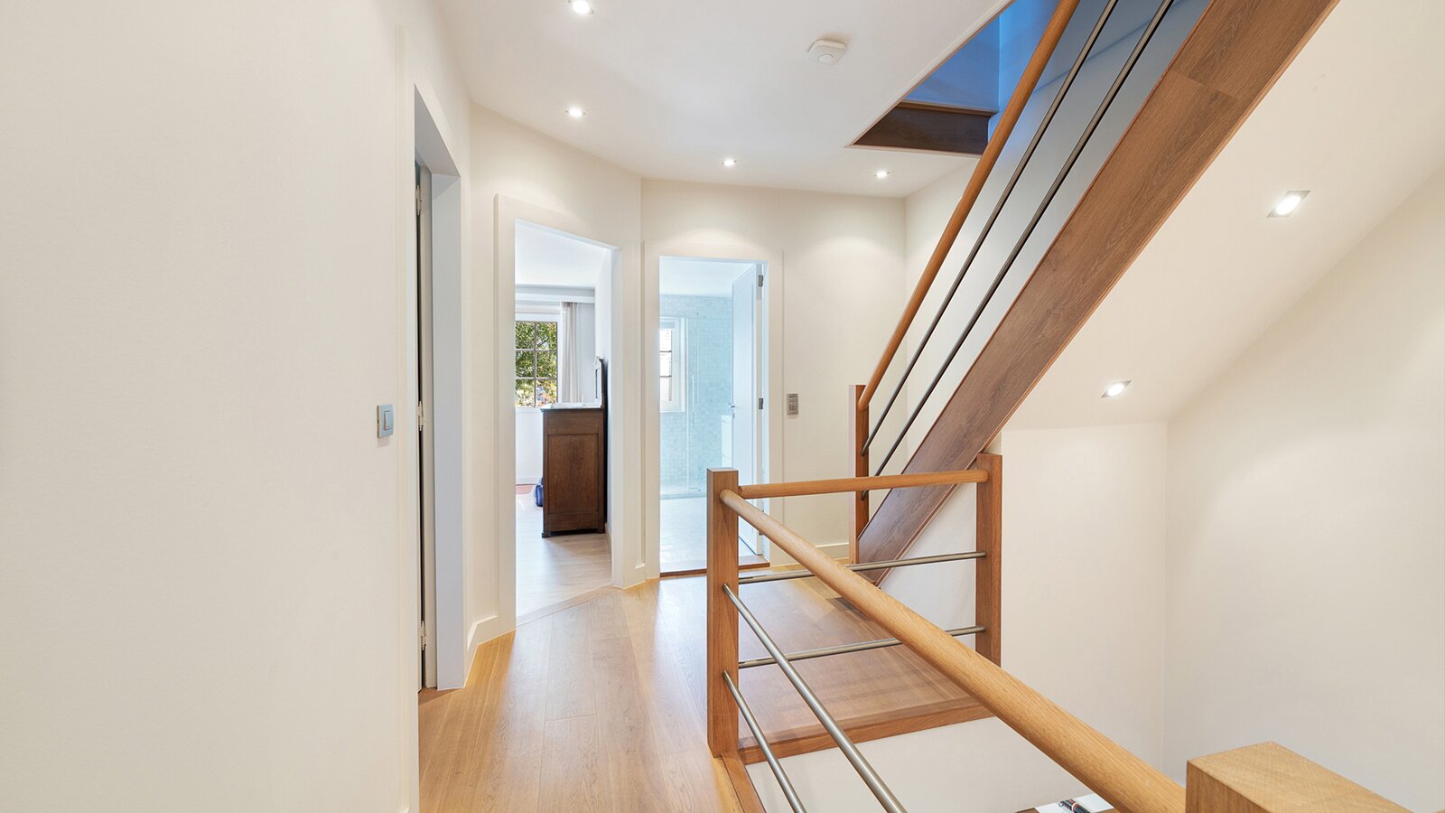 Upon entering, you are welcomed by a spacious entrance hall with cloakroom and separate guest toilet. The bright living room with open fireplace creates a warm and inviting atmosphere and forms the heart of the home. Adjacent is a generous separate kitchen, providing access to the first integrated garage.