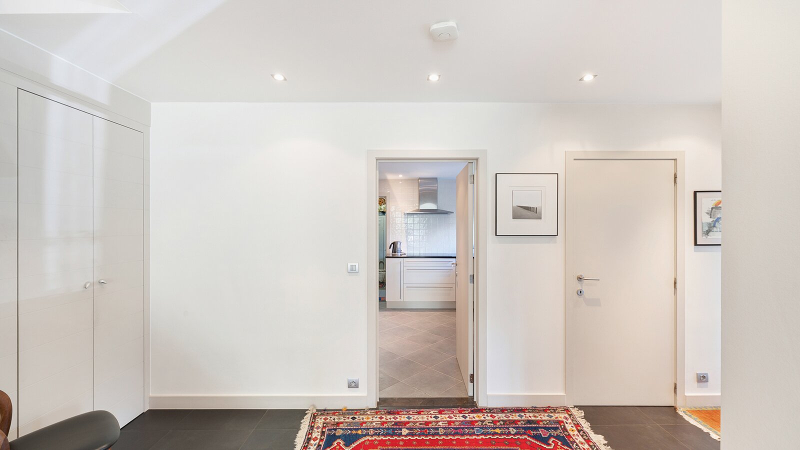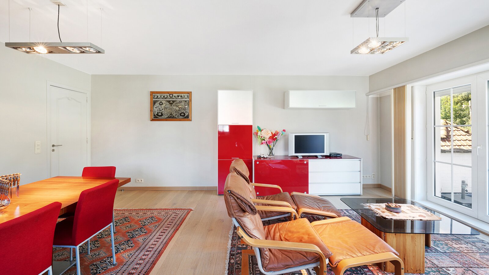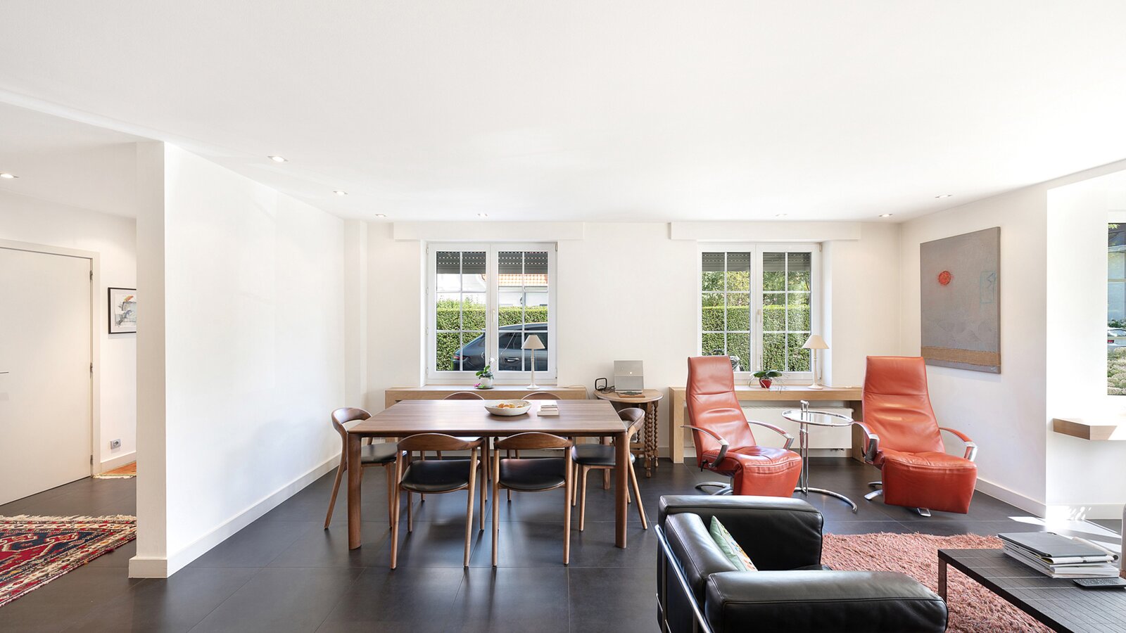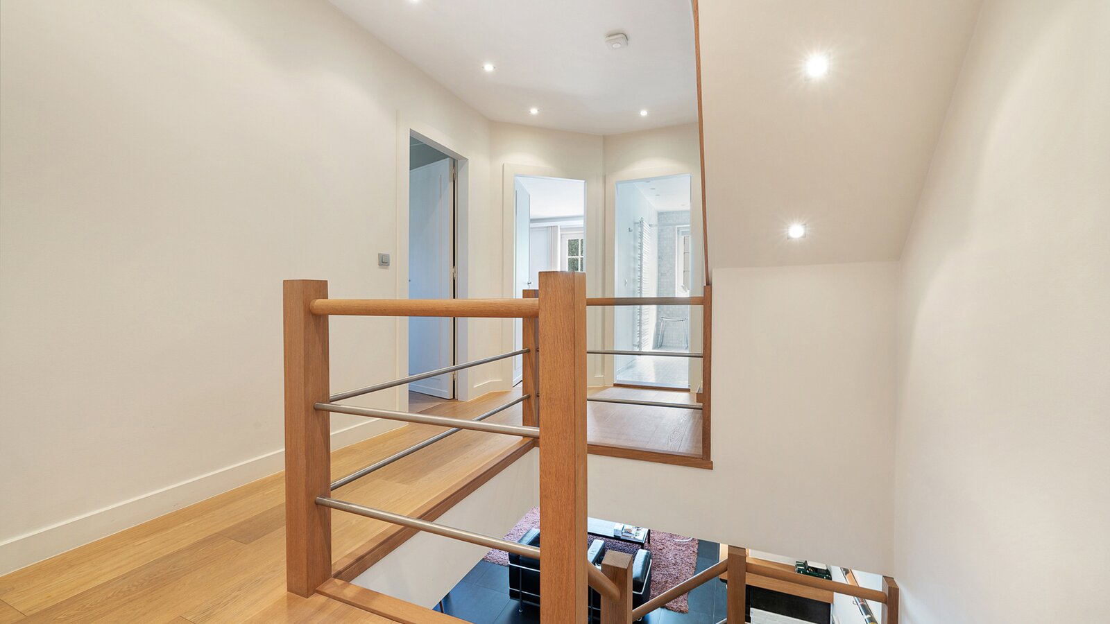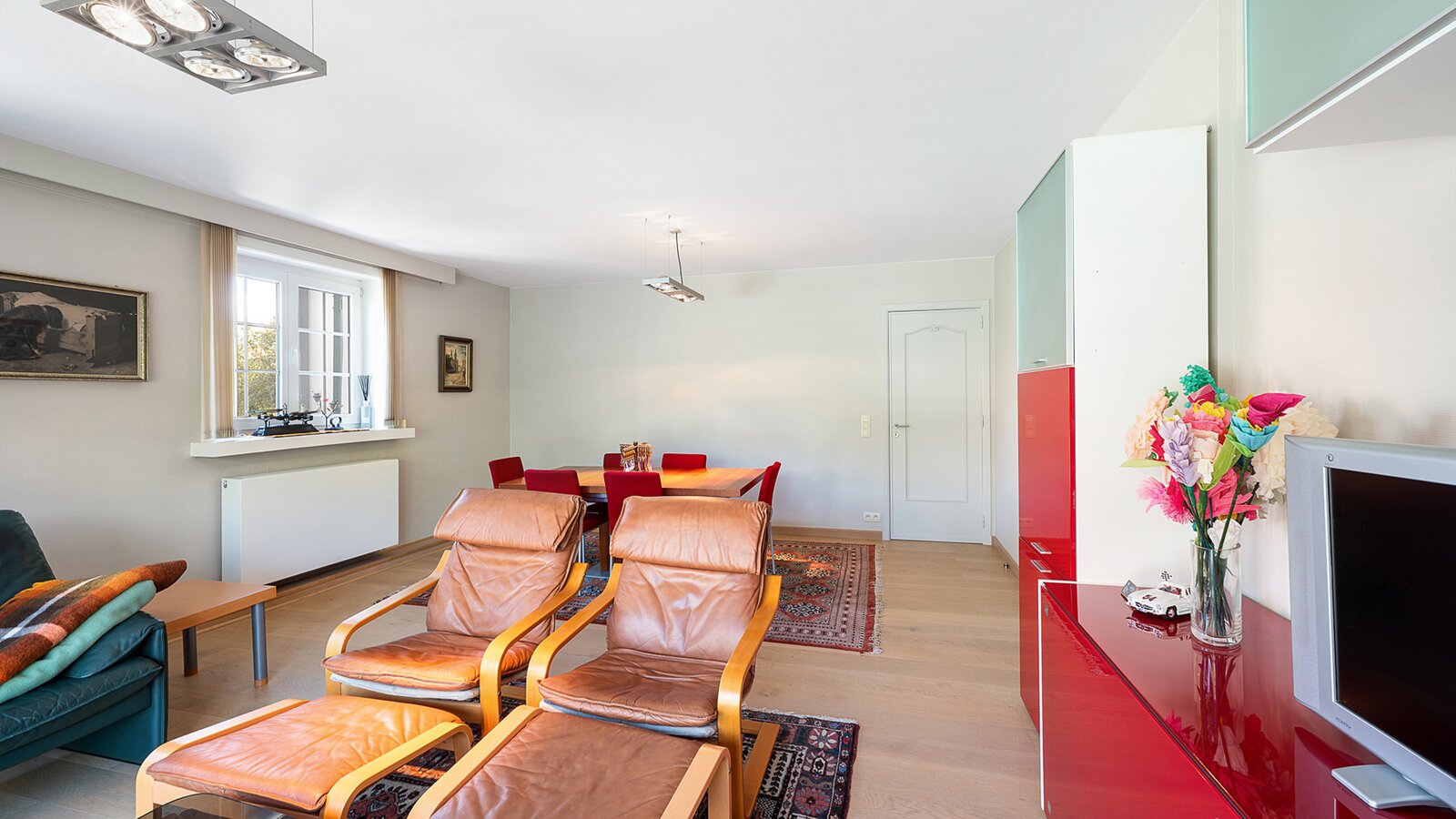 Upon entering, you are welcomed by a spacious entrance hall with cloakroom and separate guest toilet. The bright living room with open fireplace creates a warm and inviting atmosphere and forms the heart of the home. Adjacent is a generous separate kitchen, providing access to the first integrated garage.