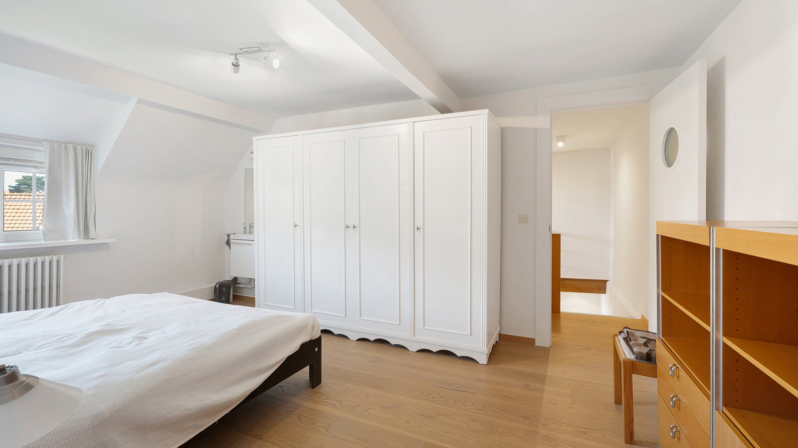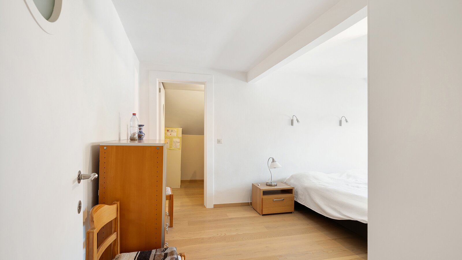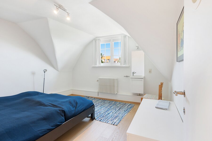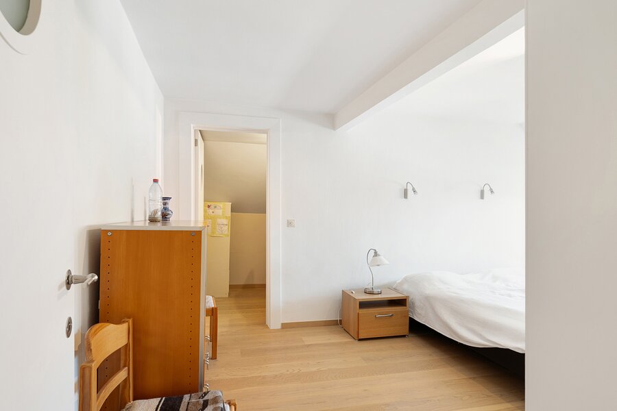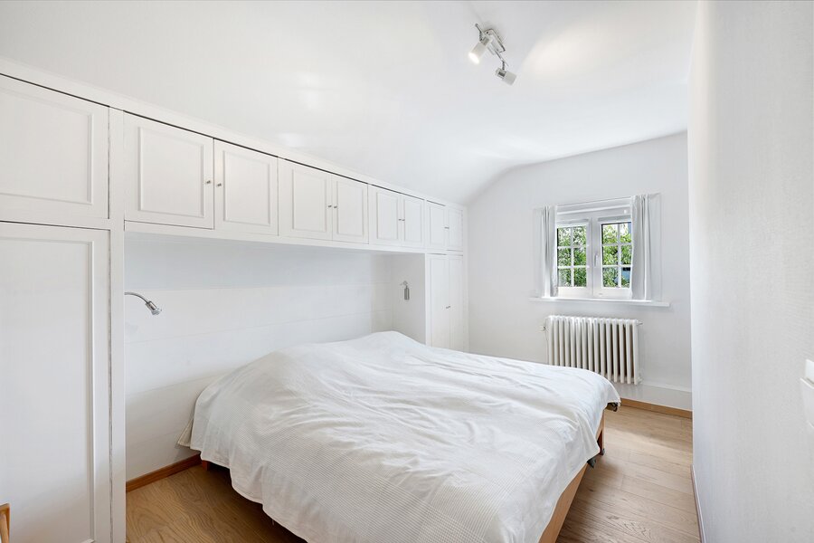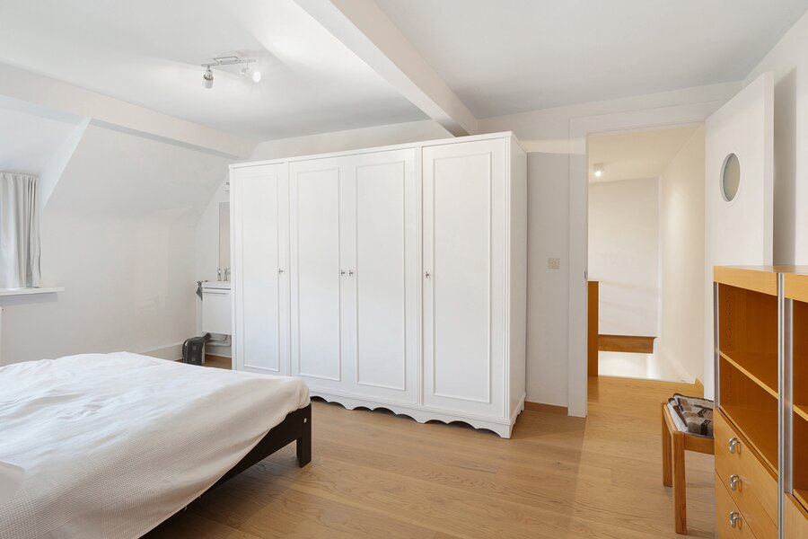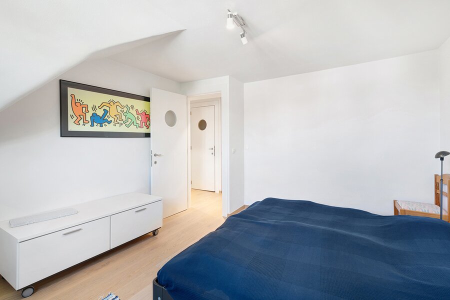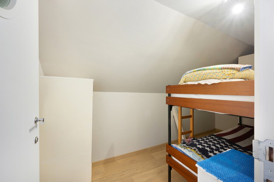 The first floor features two large bedrooms, one of which is currently arranged as an additional living space and opens onto a sunny terrace. A spacious dressing room, which can also serve as a smaller third bedroom, and a comfortable bathroom complete this level.