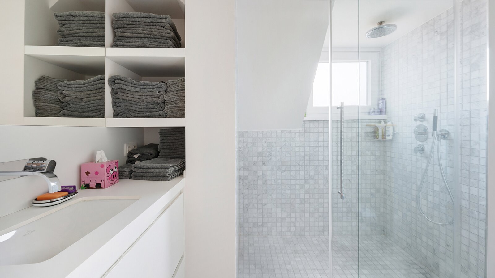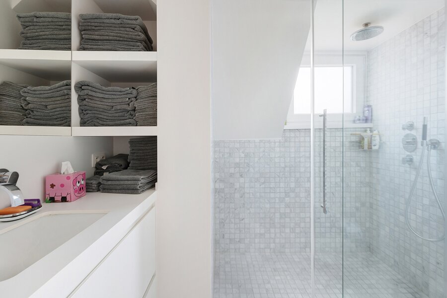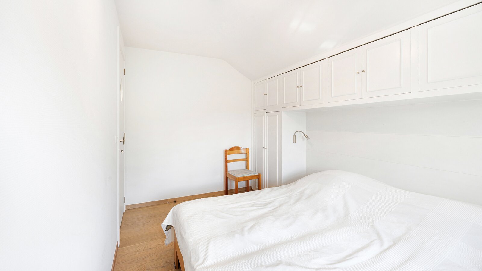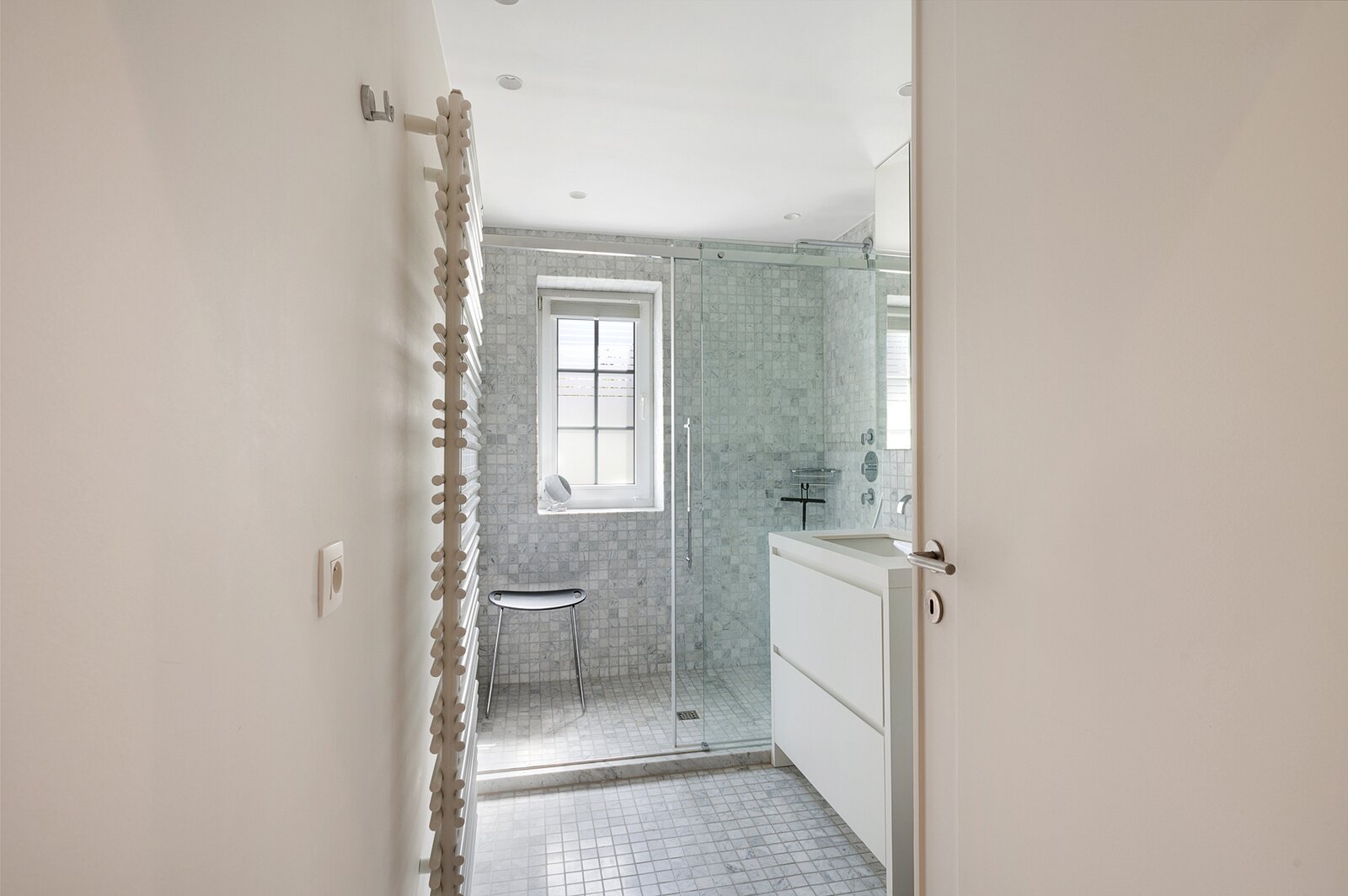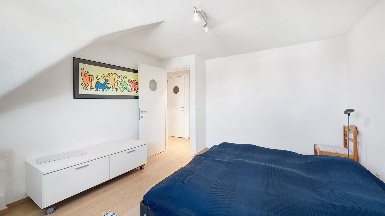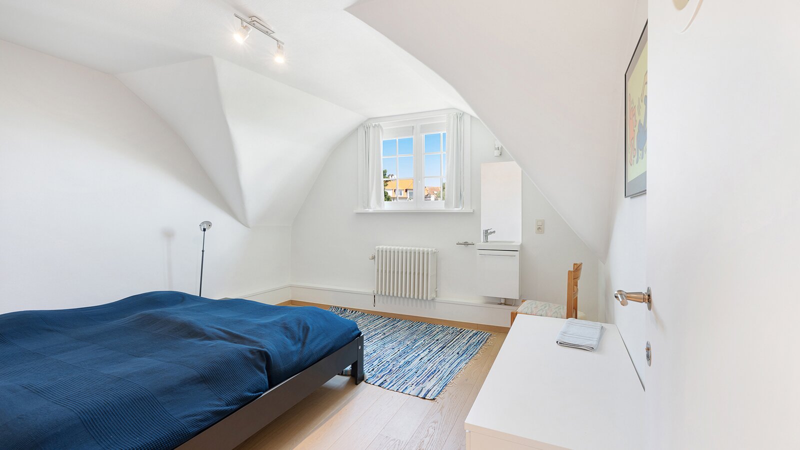 The first floor features two large bedrooms, one of which is currently arranged as an additional living space and opens onto a sunny terrace. A spacious dressing room, which can also serve as a smaller third bedroom, and a comfortable bathroom complete this level.